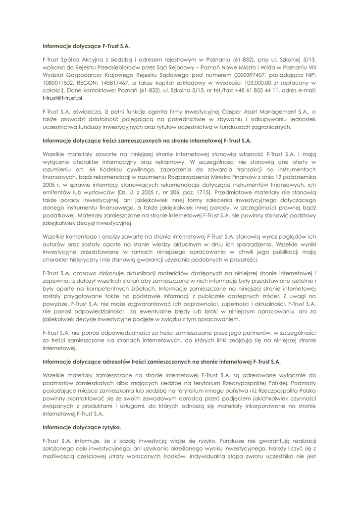 Informacje dotyczące F-Trust S.A. F-Trust Spółka Akcyjna z siedzibą i adresem rejestrowym w Poznaniu (61-832), przy ul. Szkolnej 5/13, wpisana do Rejestru Przedsiębiorców przez Sąd Rejonowy – Poznań Nowe Miasto i Wilda w Poznaniu VIII Wydział Gospodarczy Krajowego Rejestru Sądowego pod numerem 0000397407, posiadająca NIP: 1080011502, REGON: 145817467, a także kapitał zakładowy w wysokości 103.000,00 zł (opłacony w całości). Dane kontaktowe: Poznań (61-832), ul. Szkolna 5/13, nr tel./fax: +48 61 855 44 11, adres e-mail: [email protected]. F-Trust S.A. oświadcza, iż pełni funkcję agenta firmy inwestycyjnej Caspar Asset Management S.A., a także prowadzi działalność polegającą na pośrednictwie w zbywaniu i odkupywaniu jednostek uczestnictwa funduszy inwestycyjnych oraz tytułów uczestnictwa w funduszach zagranicznych. Informacje dotyczące treści zamieszczonych na stronie internetowej F-Trust S.A. Wszelkie materiały zawarte na niniejszej stronie internetowej stanowią własność F-Trust S.A. i mają wyłącznie charakter informacyjny oraz reklamowy. W szczególności nie stanowią one oferty w rozumieniu art. 66 Kodeksu cywilnego, zaproszenia do zawarcia transakcji na instrumentach finansowych, bądź rekomendacji w rozumieniu Rozporządzenia Ministra Finansów z dnia 19 października 2005 r. w sprawie informacji stanowiących rekomendacje dotyczące instrumentów finansowych, ich emitentów lub wystawców (Dz. U. z 2005 r., nr 206, poz. 1715). Przedmiotowe materiały nie stanowią także porady inwestycyjnej, ani jakiejkolwiek innej formy zalecenia inwestycyjnego dotyczącego danego instrumentu finansowego, a także jakiejkolwiek innej porady, w szczególności prawnej bądź podatkowej. Materiały zamieszczone na stronie internetowej F-Trust S.A. nie powinny stanowić podstawy jakiejkolwiek decyzji inwestycyjnej. Wszelkie komentarze i analizy zawarte na stronie internetowej F-Trust S.A. stanowią wyraz poglądów ich autorów oraz zostały oparte na stanie wiedzy aktualnym w dniu ich sporządzenia. Wszelkie wyniki inwestycyjne przedstawione w ramach niniejszego opracowania w chwili jego publikacji mają charakter historyczny i nie stanowią gwarancji uzyskania podobnych w przyszłości. F-Trust S.A. czasowo dokonuje aktualizacji materiałów dostępnych na niniejszej stronie internetowej i zapewnia, iż dołożył wszelkich starań aby zamieszczone w nich informacje były przedstawione rzetelnie i były oparte na kompetentnych źródłach. Informacje zamieszczone na niniejszej stronie internetowej zostały przygotowane także na podstawie informacji z publicznie dostępnych źródeł. Z uwagi na powyższe, F-Trust S.A. nie może zagwarantować ich poprawności, zupełności i aktualności. F-Trust S.A. nie ponosi odpowiedzialności za ewentualne błędy lub braki w niniejszym opracowaniu, ani za jakiekolwiek decyzje inwestycyjne podjęte w związku z tym opracowaniem. F-Trust S.A. nie ponosi odpowiedzialności za treści zamieszczane przez jego partnerów, w szczególności za treści zamieszczane na stronach internetowych, do których linki znajdują się na niniejszej stronie internetowej. Informacje dotyczące adresatów treści zamieszczonych na stronie internetowej F-Trust S.A. Wszelkie materiały zamieszczone na stronie internetowej F-Trust S.A. są adresowane wyłącznie do podmiotów zamieszkałych albo mających siedzibę na terytorium Rzeczypospolitej Polskiej. Podmioty posiadające miejsce zamieszkania lub siedzibę na terytorium innego państwa niż Rzeczpospolita Polska powinny skontaktować się ze swoim zawodowym doradcą przed podjęciem jakichkolwiek czynności związanych z produktami i usługami, do których odnoszą się materiały inkorporowane na stronie internetowej F-Trust S.A. Informacje dotyczące ryzyka. F-Trust S.A. informuje, że z każdą inwestycją wiąże się ryzyko. Fundusze nie gwarantują realizacji założonego celu inwestycyjnego, ani uzyskania określonego wyniku inwestycyjnego. Należy liczyć się z możliwością częściowej utraty wpłaconych środków. Indywidualna stopa zwrotu uczestnika nie jest tożsama z wynikiem inwestycyjnym funduszu i jest uzależniona od dnia zbycia i odkupienia jednostek uczestnictwa oraz od poziomu pobranych opłat oraz innych obciążeń dochodów z inwestycji w fundusze, w szczególności podatku od dochodów kapitałowych. Szczegółowy opis czynników ryzyka znajduje się w odpowiednim dla danego funduszu prospekcie informacyjnym oraz kluczowych informacjach dla inwestorów. Ryzyko wykorzystywania informacji zamieszczonych na stronie internetowej F-Trust, w szczególności ryzyko podjęcia decyzji inwestycyjnej, ponosi wyłącznie użytkownik niniejszej strony internetowej. Informacje dotyczące praw własności intelektualnej. Dysponentem wszelkich autorskich praw majątkowych do niniejszego opracowania jest F-Trust S.A. Powielanie lub publikowanie niniejszego opracowania lub jego części bez pisemnej zgody F-Trust S.A. jest zabronione.