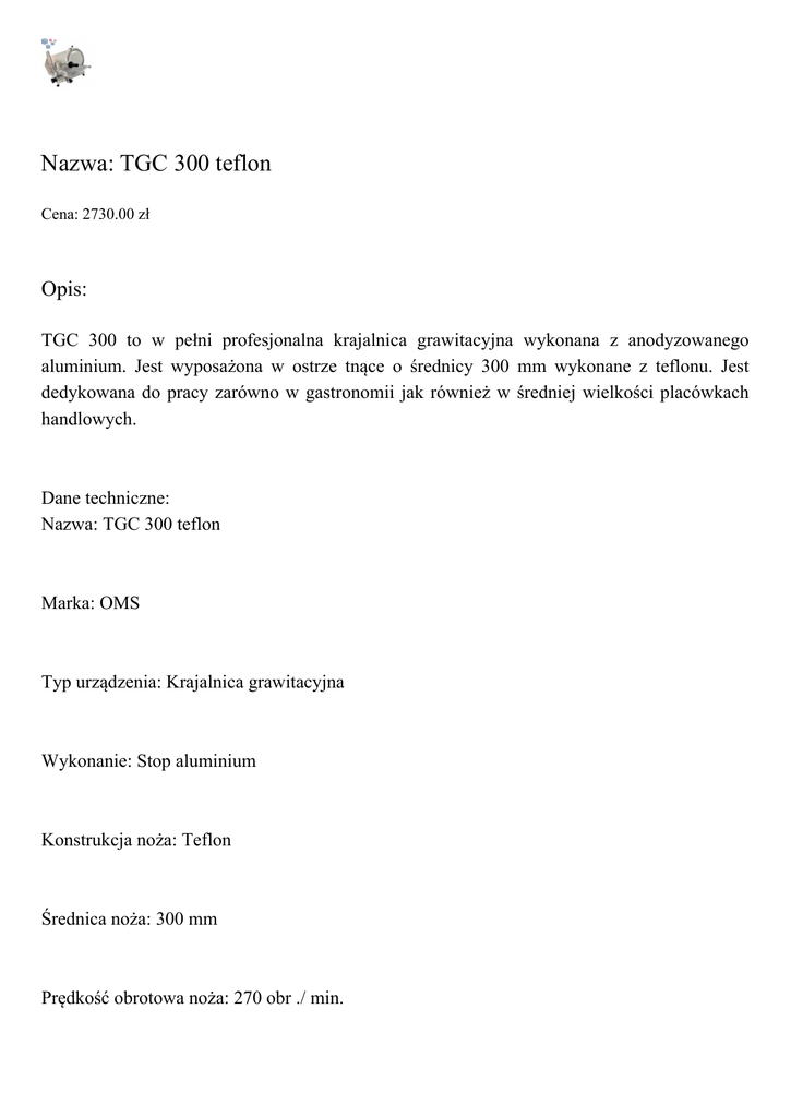Nazwa: TGC 300 teflon Cena: 2730.00 zł Opis: TGC 300 to w pełni profesjonalna krajalnica grawitacyjna wykonana z anodyzowanego aluminium. Jest wyposażona w ostrze tnące o średnicy 300 mm wykonane z teflonu. Jest dedykowana do pracy zarówno w gastronomii jak również w średniej wielkości placówkach handlowych. Dane techniczne: Nazwa: TGC 300 teflon Marka: OMS Typ urządzenia: Krajalnica grawitacyjna Wykonanie: Stop aluminium Konstrukcja noża: Teflon Średnica noża: 300 mm Prędkość obrotowa noża: 270 obr ./ min. Grubość krojenia: 0-14 mm Maks. śr. krojonego towaru: 205 mm Zasilanie: 230 V / 50 Hz Wymiary: 510(W) x 625(D) x 470(H) mm Masa: 21 kg ZALETY KRAJALNICY TGC 300: wbudowana ostrzałka ograniczona do minimum ilość plastikowych elementów łatwość czyszczenia maksimum bezpieczeństwa - certyfikat CE możliwość cięcia plastrów o grubości 0-14 mm 270 obrotów na minutę silnik o mocy 180 W maksymalne rozmiary krojonego produktu: 180 x 250 mm masa urządzenia: 21 kg Wszystkie podane ceny, są cenami netto do których należy doliczyć podatek VAT. Cennik nie stanowi oferty handlowej w rozumieniu art. 66 par.1 Kodeksu Cywilnego
