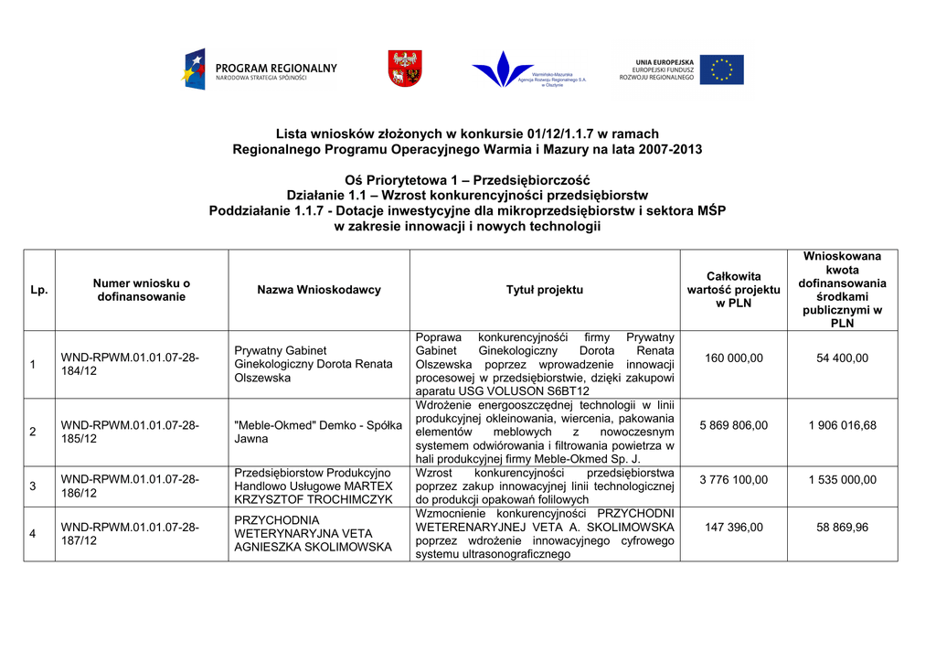 Lista wniosków złoŜonych w konkursie 01/12/1.1.7 w ramach Regionalnego Programu Operacyjnego Warmia i Mazury na lata 2007-2013 Oś Priorytetowa 1 – Przedsiębiorczość Działanie 1.1 – Wzrost konkurencyjności przedsiębiorstw Poddziałanie 1.1.7 - Dotacje inwestycyjne dla mikroprzedsiębiorstw i sektora MŚP w zakresie innowacji i nowych technologii Lp. Numer wniosku o dofinansowanie Nazwa Wnioskodawcy 1 WND-RPWM.01.01.07-28184/12 Prywatny Gabinet Ginekologiczny Dorota Renata Olszewska 2 WND-RPWM.01.01.07-28185/12 "Meble-Okmed" Demko - Spółka Jawna 3 WND-RPWM.01.01.07-28186/12 Przedsiębiorstow Produkcyjno Handlowo Usługowe MARTEX KRZYSZTOF TROCHIMCZYK 4 WND-RPWM.01.01.07-28187/12 PRZYCHODNIA WETERYNARYJNA VETA AGNIESZKA SKOLIMOWSKA Tytuł projektu Poprawa konkurencyjnośći firmy Prywatny Gabinet Ginekologiczny Dorota Renata Olszewska poprzez wprowadzenie innowacji procesowej w przedsiębiorstwie, dzięki zakupowi aparatu USG VOLUSON S6BT12 WdroŜenie energooszczędnej technologii w linii produkcyjnej okleinowania, wiercenia, pakowania elementów meblowych z nowoczesnym systemem odwiórowania i filtrowania powietrza w hali produkcyjnej firmy Meble-Okmed Sp. J. Wzrost konkurencyjności przedsiębiorstwa poprzez zakup innowacyjnej linii technologicznej do produkcji opakowań folilowych Wzmocnienie konkurencyjności PRZYCHODNI WETERENARYJNEJ VETA A. SKOLIMOWSKA poprzez wdroŜenie innowacyjnego cyfrowego systemu ultrasonograficznego Całkowita wartość projektu w PLN Wnioskowana kwota dofinansowania środkami publicznymi w PLN 160 000,00 54 400,00 5 869 806,00 1 906 016,68 3 776 100,00 1 535 000,00 147 396,00 58 869,96 5 WND-RPWM.01.01.07-28188/12 PRZEDSIĘBIORSTWO WIELOBRANśOWE „NORDOST” SPÓŁKA Z OGRANICZONĄ ODPOWIEDZIALNOŚCIĄ 6 WND-RPWM.01.01.07-28189/12 Przedsiębiorstwo ProdukcyjnoHandlowe Motoryzacji „EXMOT” Sulewski Eugeniusz Bogdan 7 WND-RPWM.01.01.07-28190/12 Przedsiębiorstwo Produkcyjno Usługowe "Plastimet" Spółka z ograniczoną odpowiedzialnością 8 WND-RPWM.01.01.07-28191/12 Zakład Mechaniczny ELTECH Sp. z o.o. 9 WND-RPWM.01.01.07-28192/12 10 WND-RPWM.01.01.07-28193/12 11 WND-RPWM.01.01.07-28194/12 PRZEDSIĘBIORSTWO USŁUG LEŚNYCH "WEST" IGNACIUK I OSTASZEWSKI SPÓŁKA JAWNA 12 WND-RPWM.01.01.07-28195/12 INDYWIDUALNA SPECJALISTYCZNA NIEPUBLICZNY ZAKŁAD OPIEKI ZDROWOTNEJ „SPECMED” ADAM MARIUSZ MILLER POL-FOODS Spółka z ograniczoną odpowiedzialnością WZROST KONKURENCYJNOŚCI P.W. NORDOST SP. Z O.O. NA RYNKU PRODUCENTÓW OPAKOWAŃ POPRZEZ WDROśENIE INNOWACYJNEJ TECHNOLOGII CIĘCIA, SKŁADANIA I SKLEJANIA TEKTURY LITEJ I FALISTEJ WZMOCNIENIE KONKURENCYJNOŚCI FIRMY PPHM EXMOT E.B. SULEWSKI POPRZEZ WDROśENIE INNOWACYJNEJ TECHNOLOGII WYTWARZANIA PRZEGRÓD FILTRACYJNYCH I WYOBLANIA W PROCESIE PRODUKCJI FILTRÓW Wzrost konkurencyjności firmy PLASTIMET poprzez wdroŜenie innowacyjnych technologii produkcji WdroŜenie innowacyjnej metody produkcji wielkogabarytowych wirników generatorów prądu oraz mozliwych innych wielkogabarytowych obrotowych części maszyn Wzrost konkurencyjności NZOZ SPECMED A. M. Miller dzięki inwestycji w innowacyjne urządzenia medyczne. Rozwój innowacji w regionie poprzez zakup najnowocześniejszej obecnie linii technologicznej POPRAWA KONKURENCYJNOŚCI FIRMY PUL ,,WEST” IGNACIUK, OSTASZEWSKI SP.J. POPRZEZ WPROWADZENIE INNOWACJI PROCESOWEJ W ZAKRESIE POZYSKIWANIA DREWNA ORAZ BIOMASY LEŚNEJ, DZIĘKI ZAKUPOWI FORWARDERA ZWIĘKSZENIE KONKURENCYJNOŚCI GABINETU DR. J. LEŚNICZAKA POPRZEZ 5 418 000,00 1 893 049,20 2 992 500,00 1 195 204,50 2 020 275,00 821 250,00 3 253 596,00 899 368,00 418 899,98 209 450,00 9 291 715,20 1 964 102,40 1 350 540,00 356 897,99 630 000,00 220 437,00 PRAKTYKA LEKARSKA POŁOśNICZO – GINEKOLOGICZNA LEŚNICZAK JAROSŁAW 13 WND-RPWM.01.01.07-28196/12 Z.P.U.H. "TRAKPOL" Zdzisław Kobus 14 WND-RPWM.01.01.07-28197/12 Przedsiębiorstwo InŜynieryjnoProdukcyjne i Handlowe "OBRAM" Spółka z ograniczoną odpowiedzialnością 15 WND-RPWM.01.01.07-28198/12 Przedsiębiorstwo HandlowoUsługowe "Tom-Car" Tomasz Grabowski 16 WND-RPWM.01.01.07-28199/12 Mazurek Spółka z ograniczona odpowiedzialnością 17 WND-RPWM.01.01.07-28200/12 FABRYKA MEBLI "SZYNAKA" SPÓŁKA Z OGRANICZONĄ ODPOWIEDZIALNOŚCIĄ 18 WND-RPWM.01.01.07-28201/12 "SZYNAKA-CLASSIC" SPÓŁKA Z OGRANICZONĄ ODPOWIEDZIALNOŚCIĄ 19 WND-RPWM.01.01.07-28202/12 Jan Szynaka Przedsiębiorstwo Produkcyjno-UsługowoHandlowe i Eksportowe „SZYNAKA” WDROśENIE INNOWACYJNEJ TECHNOLOGII OBRAZOWANIA ULTRASONOGRAFICZNEGO Budowa nowego zakładu produkcyjnego firmy TRAKPOL wraz z wdroŜeniem innowacyjnej technologii suszarni oraz innowacyjnej linii do produkcji pelletu Wzmocnienie pozycji rynkowej OBRAM Sp. z o.o. w Olsztynie poprzez wprowadzenie innowacji produktowej w firmie, dzięki zakupowi maszyn i urządzeń słuŜących do wytwarzania innowacyjnego produktu Zakup bezdotykowej innowacyjnej samochodowej w wersji modułowej 2+1 myjni WdroŜenie innowacyjnego produktu w oparciu o zjawisko bezwładności termicznej duŜych mas wody przez firmę Mazurek Spółka z ograniczoną odpowiedzialnością w Olsztynie. Poprawa konkurencyjności Fabryki Mebli "SZYNAKA" Sp. z o.o. w Nowym Mieście Lubawskim poprzez inwestycję w linię do pakowania mebli w ramach wdroŜenia innowacyjnego rozwiązania technologicznego Zwiększenie konkurencyjności Spółki SzynkaClassic poprzez pozyskanie ciągu innowacyjnych maszyn do zakładu w Nowym Mieście Lubawskim Poprawa konkurencyjności i wzmocnienie pozycji rynkowej JAN SZYNAKA PRZEDSIĘBIORSTWO PRODUKCYJNO-USŁUGOWO-HANDLOWE I EKSPORTOWE "SZYNAKA” poprzez inwestycję w innowacyjne rozwiązania technologiczne linii do 5 488 875,00 1 085 833,64 4 920 000,00 2 000 000,00 440 499,33 161 122,47 374 202,90 133 421,20 5 658 000,00 1 609 540,00 1 317 330,00 374 742,90 5 000 000,00 1 749 500,00 20 WND-RPWM.01.01.07-28203/12 Przedsiębiorstwo TransportowoSprzętowe Budownictwa "Pyzak" Mirosław Pyzak 21 WND-RPWM.01.01.07-