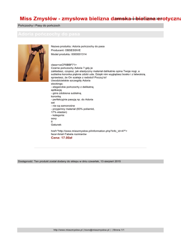 Utworzono: czwartek, 20 sierpień 2015 Miss Zmysłów - zmysłowa bielizna damska i bielizna erotyczna Pończochy i Pasy do pończoch Adoria pończochy do pasa Nazwa produktu: Adoria pończochy do pasa Producent: OBSESSIVE Model produktu: 0000001314 class=csCF6BBF71> Czarne pończochy Adoria ? gdy je zakładasz, czujesz, jak elastyczny materiał delikatnie opina Twoje nogi, a subtelna koronka pięknie zdobi uda. Dzięki nim wyglądasz bosko i z łatwością sprawiasz, że On szaleje z radości! Poczuj to! Uwodzicielskie szczegóły Adoria stockings: - eleganckie pończochy z delikatną aplikacją - góra zdobiona subtelną koronką - perfekcyjnie pasują np. do Adoria set - nie są samonośne - przyjemny materiał (83% poliamid, 17% elastan) - kategoria: sexy II Gatunek href="http://www.misszmyslow.pl/information.php?info_id=47"> face=Arial>Tabela rozmiarów Cena: 17.00zł Dostępność: Ten produkt został dodany do sklepu w dniu czwartek, 13 sierpień 2015 http://www.misszmyslow.pl | [email protected] | | Strona 1/1