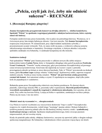 „Pelcia, czyli jak żyć, żeby nie odnieść sukcesu” - RECENZJE 1. [Recenzja] Ratujmy pingwiny! Joanna Szczepkowska przygotowała koncert na dwójkę aktorów i… telefon komórkowy. Spektakl "Pelcia" to spotkanie wegetującej pianistki z młodym karierowiczem, które częściej smuci niż śmieszy. Fortepian zarekwirowany przez komornika. Ale te palce nie potrzebują klawiszy. Wystarczy, że w ćwiczonym przez lata tempie bębnią po obrusie. I już jest muzyka. Tak Joanna Szczepkowska rozpoczyna swój koncert. W ciemnościach, przy odpowiednim nachyleniu sylwetki, z przymrużonymi oczami wirtuozki. Tyle, że zaraz zrobi się jasno, a widzowie zobaczą scenerię zdezelowanego mieszkania w kamienicy. Swoistego więzienia, w którym aktorka i reżyserka spektaklu zamknęła swa bohaterkę. A zamknęła bynajmniej nie dla śmiechu. Szaleństwo izolacji Nad spektaklem "Pelcia" pani Joanna pracowała w całkiem nowym dla siebie miejscu krakowskim teatrze Łaźnia Nowa, który w listopadzie ubiegłego roku gościł ją podczas Festiwalu Uczuć Urażonych. "Transfer" trochę sensacyjny, gdyż poczynaniom Szczepkowskiej od pewnego czasu towarzyszą kontrowersje. Kreowane tak naprawdę na wyrost i często z potrzeby przeciągnięcia aktorki na którąś ze stron ideowej barykady. Fakt, iż "Pelcia" powstawała na deskach teatru, gdzie Krystian Lupa szykuje właśnie "reaktywację" dyplomowej sztuki, zapewne rozgrzał niektóre umysły. Trzeba je teraz trochę ostudzić. "Pelcia" nie jest bowiem sztuką przeciwko czemuś lub komuś. Jest natomiast sztuką o czymś. O zepchnięciu na margines, skąd tylko jeden krok do popadnięcia w szaleństwo. Bohaterka grana przez Szczepkowską właściwie ową barierę przekracza. Po dawnej sławie pianistki, cudownego dziecka PRL-u, pozostały tylko wspomnienia. Rozwód pozbawił kobietę wszystkich oszczędności i zmusił do wegetacji w obskórnym mieszkaniu. Jest samotna, ale nie sama. Przy sobie ma bowiem Pelcię. Leżącą na łóżku w sąsiednim, zamkniętym na klucz pokoju. Pelcia się nie rusza. I nic nie mówi. Młodość musi się wyszumieć w… ubezpieczeniach Czy Pelcia to wytwór wyobraźni czy rzeczywiście dosłownie "trup w szafie"? Szczepkowska rozgrywa ów wątek dwuznacznie, wokół niego "montując" puentę całości. Relacje bohaterki z tytułową postacią stanowią jednak tylko tło dla bardziej istotnej warstwy sztuki - symbolicznej konfrontacji starego z nowym. Spotkania międzypokoleniowego, które owocuje pasmem nieporozumień, ale też swoistą więzią. Kiedy do pianistki puka młody, zbłąkany karierowicz, zaczyna się opowieść jakby o drugim rodzaju społecznej marginalizacji. Bo bohaterkę z młodzieńcem wbrew pozorom więcej łączy niż dzieli. Wrogie nastawienie obojga wobec siebie nie zmienia faktu, iż zostali odstawieni na boczny tor egzystencji. Każde na swoich warunkach. Przybysz stara się robić dobrą minę do złej gry. Oferuje ubezpieczenie, chwali się karierą w offowym zespole, w sekundę potrafi też zaimprowizować akcję pozyskiwania grantu na fundację. Tyle, że owe rozliczne zajęcia są czymś zastępczym; sprawdzaniem się, dorywczym zarobkiem, szukaniem szansy rozwoju. W rzeczywistości młodzieniec nie ma nic, ani też niczego nie osiągnął. Lecz to może ulec zmianie. O ile tylko pianistka użyczy trochę dawnej sławy pod kątem medialnego występu. Z telefonem pod ręką Kto widział "Gołą babę", ten wie, że Szczepkowska potrafi rozbawić do łez. "Pelcia" to jednak emocje zupełnie innego rodzaju. Raczej uśmiech niż śmiech. Tak jak w przypadku tworzonej na szybko fundacji ratującej pingwiny. Inicjatywie, którą nie kieruje autentyczna troska ekologiczna, lecz absurdalny zapał organizacyjny. Ratujmy pingwiny! Lećmy na Antarktydę! I rzecz jasna, last but not least, załatwiajmy grant od Unii Europejskiej. Podobne akcenty satyryczne są jeszcze rozsiane w kilku fragmentach "Pelci". Mimo tego, ciężko nie oprzeć się wrażeniu, iż Szczepkowską interesuje mało zabawny wizerunek młodego pokolenia. Rozedrganego, z trzęsącymi się nogami, łapiącego za wszelkie możliwe okazje, byle do przodu. Takim neurotykiem autorka uczyniła właśnie postać swego męskiego antagonisty. Mającego ciągle pod ręką "zagłuszacz" wszelkich lęków - telefon komórkowy. Przedłużenie mózgu, . używane praktycznie non stop. Na tyle, iż staje się trzecim (a właściwie czwartym) bohaterem spektaklu. Między wycofaniem a goryczą W "Pelci" jest trochę scenicznego przestoju, sytuacyjnych powtórzeń, które spowalniają rytm przedstawienia. Tym razem Szczepkowska stawia aktorsko na bardzo oszczędną i wycofaną grę. Jej Marta Morska jest istotą kruchą, wewnętrznie złamaną, przesadnie histeryzującą. Kreacja z tych niepozornych, o których randze decyduje kontekst egzystencjalny postaci a nie wykrzyczane widzu w twarz emocje. Krzyczy natomiast Jan Jurkowski. Młody aktor (absolwent krakowskiej PWST) partnerujący Szczepkowskiej na scenie. Udana rola. Pociągnięta po części pyszałkowatością cynicznego domokrążcy, a po części - goryczą niespełnionego artysty, zmuszonego do uwłaczających chałtur. Postać tragikomiczna w ciągu groteskowych monologów z telefonem komórkowym, ale tragiczna w ogólnym rozrachunku. Niemy koncert z początku nie przeistacza się zatem w jakiś wirtuozerski recital. Szczepkowska rozpisała na siebie, Jurkowskiego oraz telefon komórkowy koncert mocno akustyczny. Na rozstrojone postaci, które nic nie mają do stracenia, bo też nic nie mają. Pozostaje żyć przeszłością. Albo ratować pingwiny. Prapremiera spektaklu "Pelcia" odbyła się 5 marca na deskach teatru Łaźnia Nowa. Kolejne inscenizacje - 6 i 7 marca. http://kulturaonline.pl/recenzja,ratujmy,pingwiny,tytul,artykul,20161.html Łukasz Badula ———- 2. Szczepkowska w Łaźni Nowej, czyli jak żyć, żeby nie odnieść sukcesu „Pelcia, czyli jak żyć, żeby nie odni