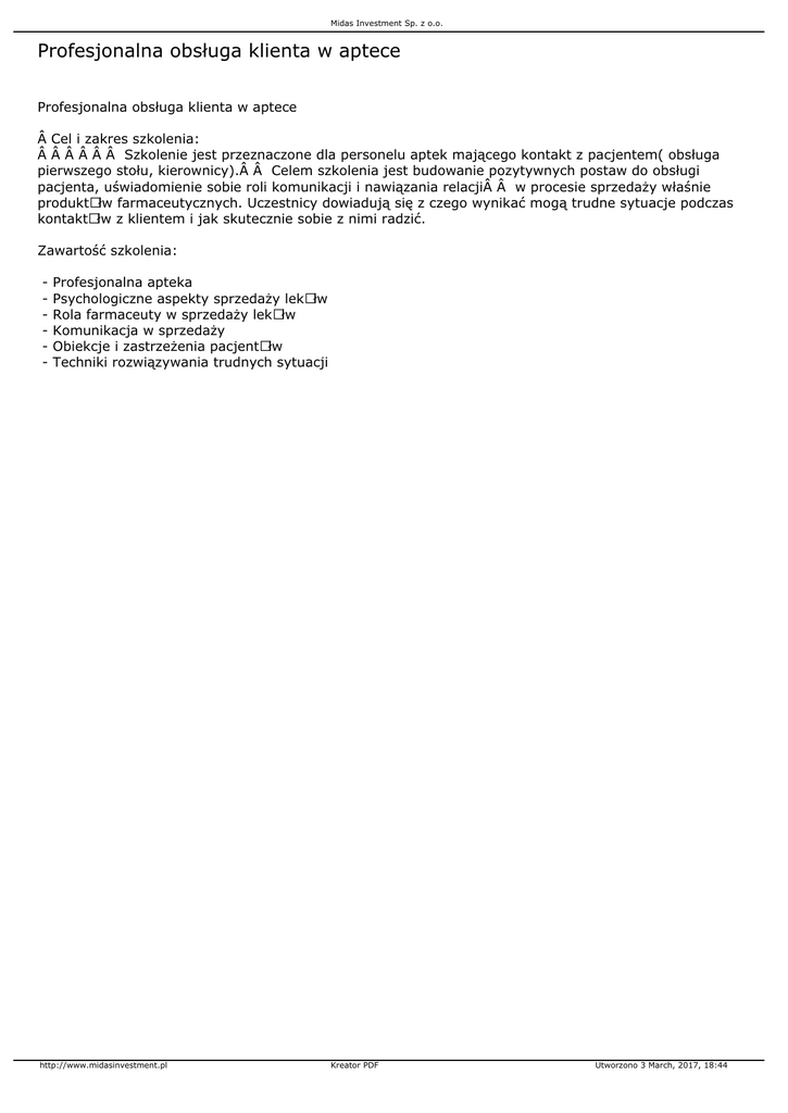 Midas Investment Sp. z o.o. Profesjonalna obsługa klienta w aptece Profesjonalna obsługa klienta w aptece  Cel i zakres szkolenia:       Szkolenie jest przeznaczone dla personelu aptek mającego kontakt z pacjentem( obsługa pierwszego stołu, kierownicy).  Celem szkolenia jest budowanie pozytywnych postaw do obsługi pacjenta, uświadomienie sobie roli komunikacji i nawiązania relacji  w procesie sprzedaży właśnie produktÃłw farmaceutycznych. Uczestnicy dowiadują się z czego wynikać mogą trudne sytuacje podczas kontaktÃłw z klientem i jak skutecznie sobie z nimi radzić. Zawartość szkolenia: - Profesjonalna apteka Psychologiczne aspekty sprzedaży lekÃłw Rola farmaceuty w sprzedaży lekÃłw Komunikacja w sprzedaży Obiekcje i zastrzeżenia pacjentÃłw Techniki rozwiązywania trudnych sytuacji http://www.midasinvestment.pl Kreator PDF Utworzono 3 March, 2017, 18:44