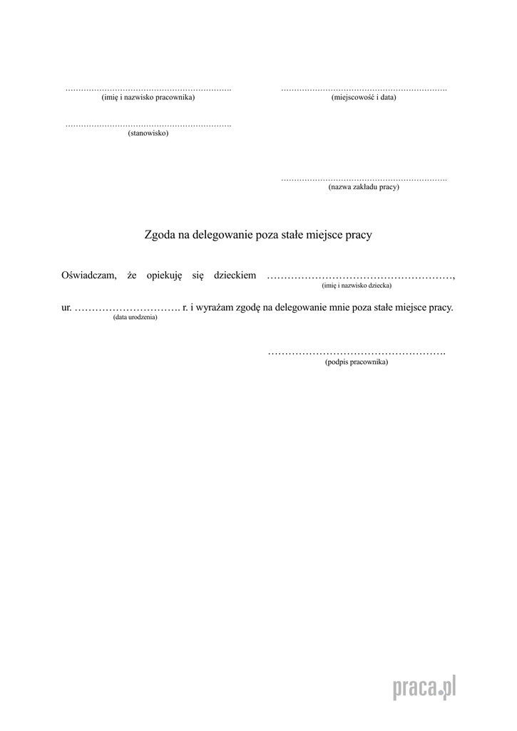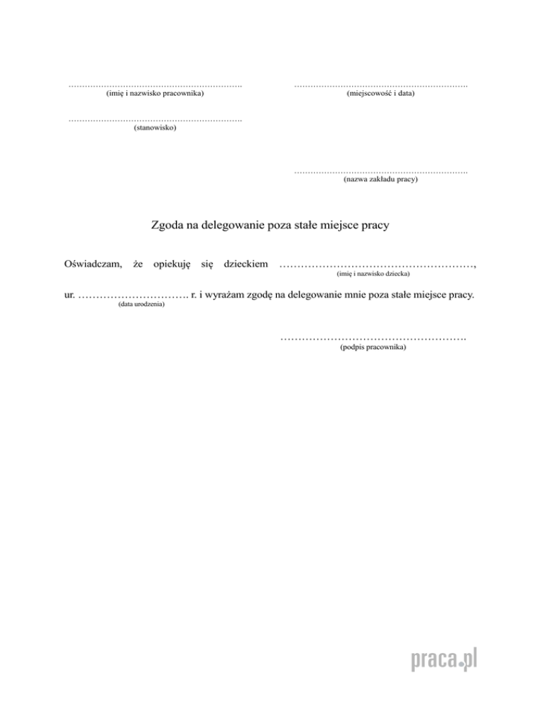 ………………………………………………………. (imię i nazwisko pracownika) ………………………………………………………. (miejscowość i data) ………………………………………………………. (stanowisko) ………………………………………………………. (nazwa zakładu pracy) Zgoda na delegowanie poza stałe miejsce pracy Oświadczam, że opiekuję się dzieckiem ………………………………………………, (imię i nazwisko dziecka) ur. …………………………. r. i wyrażam zgodę na delegowanie mnie poza stałe miejsce pracy. (data urodzenia) ……………………………………………. (podpis pracownika)