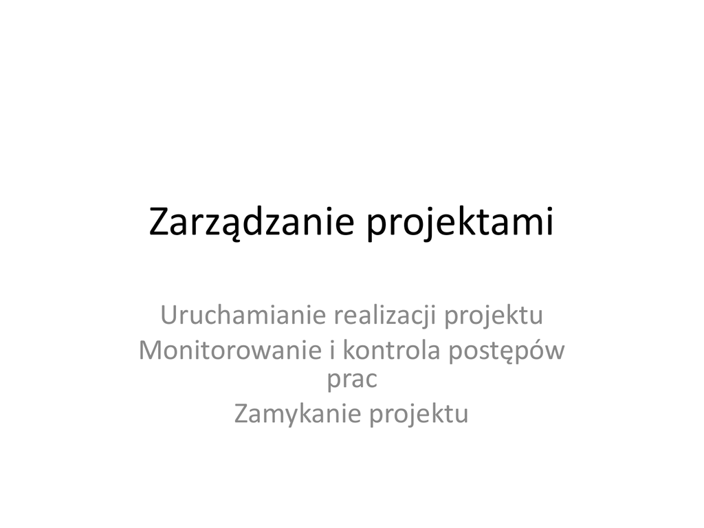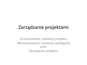 Zarządzanie projektami Uruchamianie realizacji projektu Monitorowanie i kontrola postępów prac Zamykanie projektu URUCHAMIANIE REALIZACJI PROJEKTU Elementy procesu rozpoczęcia prac projektowych 1. 2. 3. 4. 5. 6. 7. 8. Rekrutacja członków zespołu Definicja projektu Wyznaczanie zasad funkcjonowania zespołu Proces zarządzania zmianami zakresu Planowanie zarządzania komunikacją Pakiety robocze Proces alokacji zasobów Opracowanie ostatecznej wersji harmonogramu 1. Rekrutacja członków zespołu • Zespół projektowy* • Zespół klienta* • Zespół pracowników zaangażowanych na zlecenie* Członkowie zespołu projektowego • Zespół projektowy: uczestniczy od początku do końca realizacji projektu • Nie jest konieczne zaangażowanie w pełnym wymiarze • Zespół ten wyłaniany jest na początku Zespół klienta • Wyznaczany na takim etapie, aby mogli współuczestniczyć w inicjacji projektu • Kryteria selekcji (jedynie zarys): – Osoby o określonych kompetencjach decyzyjnych – Osoby na określonych stanowiskach* Pracownicy zaangażowani na zlecenie • Tzw. tech-temp • Angażowani w przypadku gdy brak personelu lub brak umiejętności • Zwykle dostępni w ściśle określonym czasie • Mają jasno określone role • Często priorytety tych pracowników są poza firmą • Mogą się słabiej angażować • Wymagają ściślejszej kontroli 2. Definicja projektu PDS • Możliwe jest wykorzystanie dokumentów (por. wykład 3): – COS - Conditions of Satisfaction (COS) • Warunki satysfakcji • Sformalizowana wymiana zdań na temat ofert i oczekiwań – POS - Statut projektu: Project Overview Statement (POS) • Statut projektu (1 strona + załączniki) • Określa, co ma być zrobione (opis problemu, opis celu głównego, cele cząstkowe, kryteria sukcesu, ryzyka) • Podpisany przez menedżera projektu i klienta – RBS – struktura podziału wymagań (ang. requirements breakdown structure) – WBS – struktura podziału prac (work breakdown structure) – Propozycji projektu Definicja projektu - PDS • PDS – project definition statement • Składa się z tych samych elementów, co POS, ale jest bardziej szczegółowy • Elementy: – opis problemu, – opis celu głównego, – cele cząstkowe, – kryteria sukcesu, – ryzyka. 3. Wyznaczanie zasad funkcjonowania zespołu • • • • Zasady rozwiązywanie problemów Zasady podejmowania decyzji Zasady rozwiązywania konfliktów Zasady dotyczące spotkań zespołu 4.Proces zarządzania zmianami zakresu • Sytuacja: następuję zmiana, w wyniku której projekt może być zagrożony • Rozwiązanie: wniosek o zmianę w projekcie • Wersje: – Zmiana uwzględniona– dotychczasowy harmonogram i plan alokacji zasobów – Zmiana uwzględniona– wydłużenie harmonogramu – Zmiana uwzględniona– dotychczasowy harmonogram i planowane są nowe zasoby – Zmiana uwzględniona– zmiana harmonogram i planowane są nowe zasoby – Zmiana uwzględniona – wymagana strategia stopniowego ujawniania rozwiązania i nadawania terminom priorytetów – Zmiana nie może być uwzględniona bez znacznej modyfikacji priorytetów • Deklaracja skutków dla projektu 5. Planowanie zarządzania komunikacją • Komunikacja bezpośrednia (spotkania) • Komunikacja pośrednia (np. wideokonferencje, poczta elektroniczna) 6. Pakiety robocze • „informacja dla menedżera, jak ma wykonać plan projektu w zakresie przydzielonego mu zadania, w określonych przez harmonogram ramach czasowych” • Format oparty na dwóch dokumentach: – Arkusz przydziału pakietów roboczych – Raport opisujący pakiet roboczy Arkusz przydziału pakietów roboczych Arkusz przydziału pakietów roboczych Tytuł projektu Pakiet roboczy Harmonogram Numer projektu Menedżer projektu Dane kontaktowe Nr pakietu Nazwa pakietu Najwcześniejszy początek NWP Najpóźniejszy koniec NPK Menedżer pakietu roboczego A Projektowanie 01/02/16 05/02/16 J. Nowak B Ocena produktu 01/02/16 05/02/16 A. Kowal ….. Przygotował Data Zatwierdził Data Strona 1 z 1 Raport opisujący pakiet roboczy Opis pakietu roboczego Tytuł projektu Nazwa pakietu roboczego Numer pakietu roboczego Menedżer pakietu roboczego Dane kontaktowe Data rozpoczęcia Data zakończenia Czy należy do Poprzednie pakiety ścieżki robocze krytycznej (T/N) Następny pakiet roboczy Numer Nazwa Opis Czas (w dniach) Osoba odpowiedzialna Dane kontaktowe Data Zatwierdził Data Strona 1 z 1 Przygotował Numer projektu Menedżer projektu Data 7. Proces alokacji zasobów • Poziomowanie zasobów (ang. resource leveling) – technika polegająca na tym, że daty początku i końca w harmonogramie są dopasowywane na podstawie dostępności zasobów w celu zrównoważenia (wyrównania) zapotrzebowania z dostępnością (PMBOK, 5th, s. 205) • Strategie: – Wykorzystywanie dostępnych zapasów czasu – Przesuwanie daty ukończenia projektu – Wygładzanie (np. angażowanie nadgodzin dla pracowników bez konieczności zwiększania dodatkowych zasobów osobowych) 8. Opracowanie ostatecznej wersji harmonogramu MONITOROWANIE POSTĘPU PRAC Narzędzia monitorowania postępu prac • Raporty bieżące (obejmują tylko ostatnio zakończony okres) • Raporty skumulowane (obejmują wszystkie dotychczas zakończone okresy) • Raporty o wyjątkach (tylko o odchyleniach od planu) • Raporty semafory (oznaczone uwagami) • Raporty o odchyleniach (wielkość planowana, wielkość faktyczna, różnica) – obszerniejszy niż Raport o wyjątkach, zwiera dane liczbowe* • Diagramy Gantta* • Wykresy wypalenia* • Wykresy trendów realizacji kamieni milowych* • Analiza wartości uzyskanej EVA* • Zintegrowane wykresy trendów realizacji kamieni milowych i EVA • Spotkania monitorujące postępy prac • Strategie zapobiegania eskalacji problemów Rodzaje odchyleń* • Opóźnienia sukcesywne: zwiększające się w każdym kolejnym punkcie • Gwałtowne odchylenia Diagram Gantta* Źr