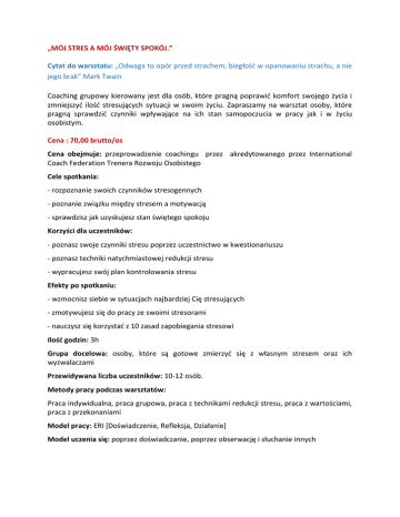 „MÓJ STRES A MÓJ ŚWIĘTY SPOKÓJ.” Cytat do warsztatu: „Odwaga to opór przed strachem, biegłość w opanowaniu strachu, a nie jego brak” Mark Twain Coaching grupowy kierowany jest dla osób, które pragną poprawić komfort swojego życia i zmniejszyć ilość stresujących sytuacji w swoim życiu. Zapraszamy na warsztat osoby, które pragną sprawdzić czynniki wpływające na ich stan samopoczucia w pracy jak i w życiu osobistym. Cena : 70,00 brutto/os Cena obejmuje: przeprowadzenie coachingu przez akredytowanego przez International Coach Federation Trenera Rozwoju Osobistego Cele spotkania: - rozpoznanie swoich czynników stresogennych - poznanie związku między stresem a motywacją - sprawdzisz jak uzyskujesz stan świętego spokoju Korzyści dla uczestników: - poznasz swoje czynniki stresu poprzez uczestnictwo w kwestionariuszu - poznasz techniki natychmiastowej redukcji stresu - wypracujesz swój plan kontrolowania stresu Efekty po spotkaniu: - wzmocnisz siebie w sytuacjach najbardziej Cię stresujących - zmotywujesz się do pracy ze swoimi stresorami - nauczysz się korzystać z 10 zasad zapobiegania stresowi Ilość godzin: 3h Grupa docelowa: osoby, które są gotowe zmierzyć się z własnym stresem oraz ich wyzwalaczami Przewidywana liczba uczestników: 10-12 osób. Metody pracy podczas warsztatów: Praca indywidualna, praca grupowa, praca z technikami redukcji stresu, praca z wartościami, praca z przekonaniami Model pracy: ERI [Doświadczenie, Refleksja, Działanie] Model uczenia się: poprzez doświadczanie, poprzez obserwację i słuchanie innych Prowadząca coaching grupowy: Dorota Trzmielewska - Coach ACC ICF1, Certyfikowany Trener FRIS®2, Kierownik projektu w DoradKom3, Turysta, członek International Coach Federation Polska i Global (USA). Prowadzi coachingi indywidualne, grupowe i zespołowe. Pracuje w obszarze life & business. Wspiera kobiety w zakresie zwiększenia pewności siebie, radzenia sobie ze stresem, utrwalania zachowań asertywnych oraz w zmianie nawyków. Prowadzi także coachingi dla młodych przedsiębiorców oraz ich zespołów. Wspiera mikro i średnie przedsiębiorstwa w nabywaniu kompetencji i umiejętności, które pozwalają na zwiększenie efektywności funkcjonowania firmy od jednostki do zespołu. Dorota prowadzi sesje coachingowe face to face, on-line, przez telefon. Jej motto to: „Nawet najdłuższa podróż zaczyna się od jednego kroku”. LaoCy. Cena : 70,00 brutto/os Cena obejmuje: przeprowadzenie coachingu przez akredytowanego przez International Coach Federation Trenera Rozwoju Osobistego 1 ACC ICF – Associed Certified Coach; akredytowany trener rozwoju osobistego przez światową organizację International Coach Federation zrzeszającą ponad 20 tysięcy członków. ICF funkcjonuje na świecie od 20 lat, w Polsce od 10 lat, w Opolu od 3 lat. www.icf.org.pl 2 Trener FRIS – Certyfikowany trener pracujący wg. metody opracowanej przez firmę FRIS Style Myślenia i Style Działania, www.fris.pl 3 DoradKom – firma zajmująca się coachingiem, szkoleniami, doradztwem dla mikro, małych i średnich przedsiębiorstw. www.doradkom.pl
