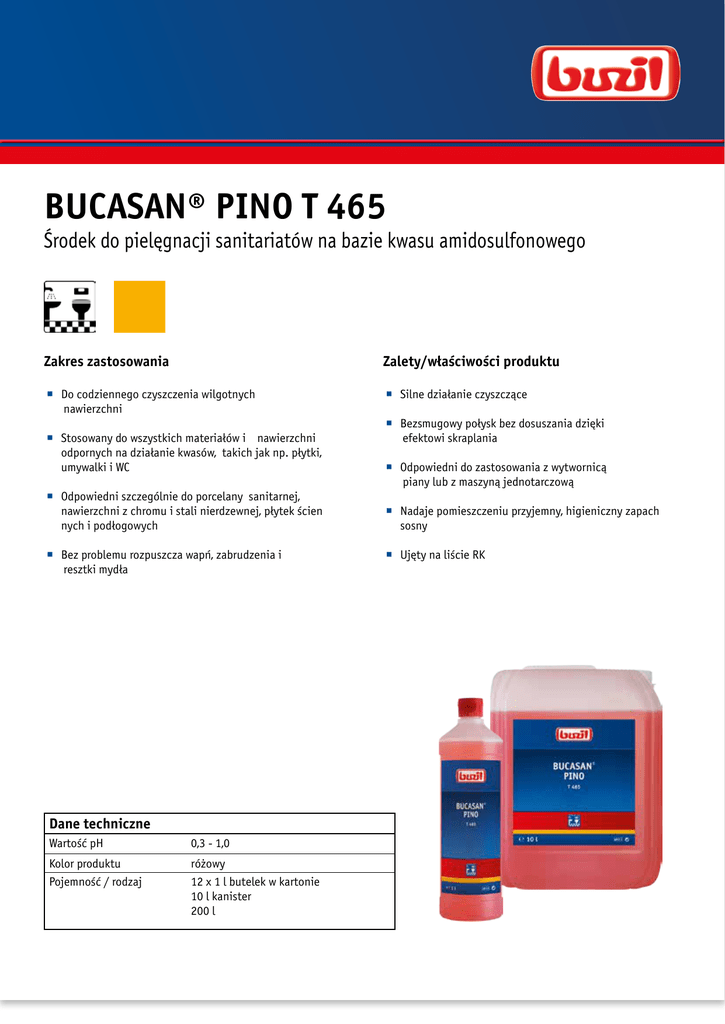 BUCASAN® PINO T 465 Środek do pielęgnacji sanitariatów na bazie kwasu amidosulfonowego Zakres zastosowania Zalety/właściwości produktu Do codziennego czyszczenia wilgotnych nawierzchni Silne działanie czyszczące Stosowany do wszystkich materiałów i nawierzchni odpornych na działanie kwasów, takich jak np. płytki, umywalki i WC Odpowiedni szczególnie do porcelany sanitarnej, nawierzchni z chromu i stali nierdzewnej, płytek ścien nych i podłogowych Bez problemu rozpuszcza wapń, zabrudzenia i resztki mydła Dane techniczne Wartość pH 0,3 - 1,0 Kolor produktu różowy Pojemność / rodzaj 12 x 1 l butelek w kartonie 10 l kanister 200 l Bezsmugowy połysk bez dosuszania dzięki efektowi skraplania Odpowiedni do zastosowania z wytwornicą piany lub z maszyną jednotarczową Nadaje pomieszczeniu przyjemny, higieniczny zapach sosny Ujęty na liście RK BUCASAN® PINO T 465 Środek do pielęgnacji sanitariatów na bazie kwasu amidosulfonowego Zastosowanie i dozowanie Do wszystkich pomieszczeń wilgotnych i w sanitariatach. Czyszczenie ręczne: WC, pisuary: stosować bez rozcieńczania. sanitariaty: 20-50 ml/10 l wody. Czyszczenie maszynowe: maszyna jednotarczowa: 200 ml - 1 l/10 l wody. Produkty uzupełniające W przypadku mocnych zabrudzeń w sanitariatach: G 460 Bucalex®. Specjalnie do WC/pisuarów: G 465 Wc Cleaner. W obszarach występowania miękkiej wody: G 468 Bucal. Do odświeżania powietrza: G 569 Buz ® Fresh. Działanie dezynfekujące: Budenat® Azid Plus D 587 Wytwornica piany: 1:5 do 1:10 z wodą Przed zastosowaniem T 465 Bucasan® Pino należy zwilżyć nawierzchnię zimną wodą. Zawsze spłukiwać zimną wodą. Ważne wskazówki Zawsze używać zimnej wody. Nie używać na kamieniach naturalnych zawierających wapień jak np. marmur, płyty Solnhofer, trawertyn, wapień muszlowy. Nie używać na aluminium, nawierzchniach lakierowanych i szkle akrylowym. Zwroty określające zagrożenie H 314 H 290 Powoduje poważne oparzenia skóry oraz uszkodzenia oczu . Może powodować korozję metali. Szczegółowe informacje znajdziecie Państwo w karcie preparatu niebezpiecznego do produktu T 465 Bucasan® Pino na stronie www.buzil.com. Kod GISBAU: GS 80 Numer artykułu: T465-0001 T465-0010 T465-0200 Dane zawarte w informacjach o produktach bazują na naszych doświadczeniach oraz badaniach i odpowiadają naszemu dzisiejszemu stanowi wiedzy. Różnorodność warunków panujących w obiektach oraz cech materiałów uniemożliwia jednak uwzględnienie wszystkich przypadków. Dlatego w informacjach technicznych możemy podać jedynie ogólne wskazówki odnośnie stosowania produktu. Jakość pracy zależy zatem od fachowej oceny obiektu dokonanej przez użytkownika. W przypadkach spornych jest on zobowiązany sprawdzić działanie produktu firmy Buzil na ukrytym kawałku nawierzchni przeznaczonej do czyszczenia lub zasięgnąć porady odnośnie techniki zastosowania. Ponosimy odpowiedzialność za niepełne lub niewłaściwe dane zawarte w naszych materiałach informacyjnych tylko w przypadku rażącej winy (działanie zamierzone lub rażące zaniedbanie); pozostałe roszczenia wynikające z rękojmi pozostają nienaruszone. Poprzez wprowadzenie tej informacji technicznej unieważniamy wszystkie poprzednie informacje techniczne. Data:12.10.2015 BUZIL POLSKA SP. Z O.O. ul. Jana Długosza 60 . 51-162 Wrocław T +48 71 376 60 31 . F +48 71 376 60 35 . E [email protected] . www.buzil.pl