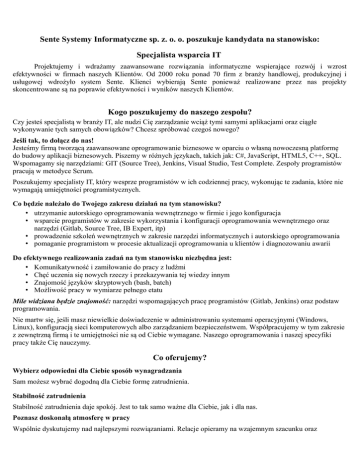 Sente Systemy Informatyczne sp. z. o. o. poszukuje kandydata na stanowisko: Specjalista wsparcia IT Projektujemy i wdrażamy zaawansowane rozwiązania informatyczne wspierające rozwój i wzrost efektywności w firmach naszych Klientów. Od 2000 roku ponad 70 firm z branży handlowej, produkcyjnej i usługowej wdrożyło system Sente. Klienci wybierają Sente ponieważ realizowane przez nas projekty skoncentrowane są na poprawie efektywności i wyników naszych Klientów. Kogo poszukujemy do naszego zespołu? Czy jesteś specjalistą w branży IT, ale nudzi Cię zarządzanie wciąż tymi samymi aplikacjami oraz ciągłe wykonywanie tych samych obowiązków? Chcesz spróbować czegoś nowego? Jeśli tak, to dołącz do nas! Jesteśmy firmą tworzącą zaawansowane oprogramowanie biznesowe w oparciu o własną nowoczesną platformę do budowy aplikacji biznesowych. Piszemy w różnych językach, takich jak: C#, JavaScript, HTML5, C++, SQL. Wspomagamy się narzędziami: GIT (Source Tree), Jenkins, Visual Studio, Test Complete. Zespoły programistów pracują w metodyce Scrum. Poszukujemy specjalisty IT, który wesprze programistów w ich codziennej pracy, wykonując te zadania, które nie wymagają umiejętności programistycznych. Co będzie należało do Twojego zakresu działań na tym stanowisku? • utrzymanie autorskiego oprogramowania wewnętrznego w firmie i jego konfiguracja • wsparcie programistów w zakresie wykorzystania i konfiguracji oprogramowania wewnętrznego oraz narzędzi (Gitlab, Source Tree, IB Expert, itp) • prowadzenie szkoleń wewnętrznych w zakresie narzędzi informatycznych i autorskiego oprogramowania • pomaganie programistom w procesie aktualizacji oprogramowania u klientów i diagnozowaniu awarii Do efektywnego realizowania zadań na tym stanowisku niezbędna jest: • Komunikatywność i zamiłowanie do pracy z ludźmi • Chęć uczenia się nowych rzeczy i przekazywania tej wiedzy innym • Znajomość języków skryptowych (bash, batch) • Możliwość pracy w wymiarze pełnego etatu Mile widziana będzie znajomość: narzędzi wspomagających pracę programistów (Gitlab, Jenkins) oraz podstaw programowania. Nie martw się, jeśli masz niewielkie doświadczenie w administrowaniu systemami operacyjnymi (Windows, Linux), konfiguracją sieci komputerowych albo zarządzaniem bezpieczeństwem. Współpracujemy w tym zakresie z zewnętrzną firmą i te umiejętności nie są od Ciebie wymagane. Naszego oprogramowania i naszej specyfiki pracy także Cię nauczymy. Co oferujemy? Wybierz odpowiedni dla Ciebie sposób wynagradzania Sam możesz wybrać dogodną dla Ciebie formę zatrudnienia. Stabilność zatrudnienia Stabilność zatrudnienia daje spokój. Jest to tak samo ważne dla Ciebie, jak i dla nas. Poznasz doskonałą atmosferę w pracy Wspólnie dyskutujemy nad najlepszymi rozwiązaniami. Relacje opieramy na wzajemnym szacunku oraz swobodnej wymianie doświadczeń i pomysłów. Otrzymasz od nas wszystko, co będzie Ci potrzebne do efektywnej pracy Dla nas Twoja efektywność jest priorytetem. Zapewnimy Ci warunki, dzięki którym sprawnie nabędziesz nową wiedzę i poszerzysz umiejętności. Opieka doświadczonych współpracowników pozwoli Ci rozwinąć skrzydła. Dodatkowo będziesz mógł skorzystać z systemu benefitów i wybrać spośród karty Multisport Benefit, prywatnej opieki medycznej, biletów do kina oraz wielu innych atrakcji. Zapraszamy do aplikowania za pośrednictwem formularza: http://rekrutacja.sente.pl/Apply/Step1/201605001