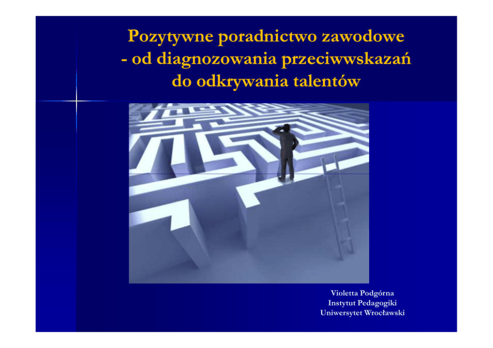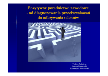 Pozytywne poradnictwo zawodowe - od diagnozowania przeciwwskazań do odkrywania talentów Violetta Podgórna Instytut Pedagogiki Uniwersytet Wrocławski Modele poradnictwa (A. (A. Kargulowa, 1986) Dyrektywne Dialogowe Liberalne Formy organizacji pracy a poradnictwo Kontekst Problemy poradnictwa zawodowego Wg J. Guicharda (2005) Profesjonalny system pracy Jaki wybrać zawód (a wcześniej ścieŜkę kształcenia), w którym miałbym największe szanse odniesienia sukcesu? Fordyzm W jakich sytuacjach zawodowych mógłbym podjąć pracę? Techniczny system pracy Jak dokonać bilansu róŜnych doświadczeń i zdefiniować projekty osobiste i zawodowe? Globalizacja, chaos Jak moŜliwie najlepiej stawiać czoło licznym tranzycjom wyznaczającym bieg Ŝycia? Wymiar etyczny i moralny poradnictwa całoŜyciowego Jak dobrze ukierunkować swoje Ŝycie w społeczeństwie? Modele poradnictwa Wg B. Wojtasik (2003) poradnictwo zawodowe dyrektywne (doradztwo) – podejmowanie decyzji za jednostkę badanie preferencji, udzielanie informacji Poradnictwo karierowe/ edukacyjno-zawodowe Edukacja do planowanie kariery zawodowej Poradnictwo Ŝyciowe/ biograficzne/ liberalno-terapeutyczne Wspieranie w indywidualnym uczeniu się (re)konstruowania biografii , scalania epizodów Ŝycia w spójne historie, uczenie się tolerancji lęków i niepewności Tradycyjne ujęcie poradnictwa zawodowego "długofalowy proces, którego treścią jest: informowanie o róŜnych rodzajach pracy zawodowej i drogach przygotowania do niej; rozpoznawanie, ukierunkowywanie i kształtowanie zainteresowań, skłonności, uzdolnień, motywacji i postaw zawodowych jednostek, ocenianie ich cech psychofizycznych i stanu zdrowia; konfrontowanie tych indywidualnych danych z wymaganiami i zapotrzebowaniem społecznym na kwalifikowane kadry, sterowanie samooceną i doradzanie” Szajek S., System orientacji i poradnictwa zawodowego, 1989 udzielanie pomocy w wyborze zawodu przez poradę (znaczenie węŜsze) działania wychowawcze przygotowujące do podejmowania decyzji zawodowych (znaczenie szersze) poradnictwo jako system działań, podejmowanych przez specjalistów w instytucjach (znaczenie systemowe) B. Wojtasik, Doradca zawodu, 1993 Dominujący model dominująca rola doradcy – eksperta lub informatora Poradnictwo dyrektywne działania jednorazowe i techniczne przynoszące wymierne korzyści informacja i przekaz treści (systemy) diagnoza i określanie przeciwwskazań (narzędzia) logika szkolna nie jest powiązana z logiką Ŝyciową Logika szkolna a logika Ŝyciowa Talent według logiki szkolnej Logika wyborów szkolnych zasadniczo róŜni się od logiki wyborów Ŝyciowych podstawowe rodzaje argumentacji a/ ścieŜki gładkie b/ ścieŜki rezygnacji (B. Dumora, 2005) ŚcieŜki „gładkie” droga dobrych uczniów sukces na drogach edukacyjnych jest oczywisty; planuje się kolejny etap kształcenia, a przyszłość zawodowa naturalnie w niego wyniknie; argumentacja oparta na „logice doskonałości doskonałości”; ”; droga uczniów ponoszących poraŜkę w szkole postawa pragmatyczna – wyznaczane są cele moŜliwe do osiągnięcia („po najmniejszej linii oporu…”); oporu…”); droga uczniów ponoszących poraŜkę oparta na „logice złudzenia” wybór podtrzymany wbrew rzeczywistym wynikom; myślenie irracjonalne ŚcieŜki rezygnacji logika rezygnacji - dokonywanie kolejnych wyborów o coraz mniejszej waŜności wcześniejsze wybory zmieniają się i jawią się jako marzenia lub szukanie po omacku, podmiot szuka wyboru zastępczego, strategie mniejszego zła „Dojrzewalnia talentów” Identyfikacja Wykorzystanie Rozwój Talent Utrzymanie Motywowanie Nie wystarczy mieć talent, trzeba go jeszcze odkryć i pozwolić mu się rozwijać! Odkrywanie i rozwijanie talentów Formalizowane refleksyjna postawa wobec swoich aktywności • Dostrzeganie sposobności pojawiających się w danym kontekście oraz tworzenie nowych okazji do rozwoju talentów • Słuszne inwestowanie kapitał kariery Poradnictwo kariery „proces interpersonalny, interpersonalny, którego celem jest towarzyszenie jednostce w sytuacji rozwoju kariery” (Brown, Brooks za: PaszkowskaPaszkowska-Rogacz, 2002, s. 13) Poradnictwo „Proces, w którym dwie (lub więcej) osoby oddziałują na siebie za pomocą bezpośredniej komunikacji, modyfikując nawzajem swoje zachowanie. Komunikacja ta zbudowana jest na całkowitym zaufaniu zaufaniu,, jest wymianą znaczących symboli werbalnych i pozawerbalnych między jej uczestnikami.” (Kargulowa, 2004, s. 47) Relacja Dialog Zaufanie Pozytywne poradnictwo zawodowe fortologiczne (fortis – siła) – Strümpfer (2005) agatologiczne (agatos – dobro) – Tischner (1982) asystujące, pedagogiczne pozytywne – skoncentrowane na dobrym Ŝyciu i podnoszeniu jakości Ŝycia określenie „pozytywne” nie oznacza, Ŝe model tradycyjny jest negatywny Cele: optymalizacja funkcjonowania jednostki i zbiorowości budowanie i rozwijanie osobistego potencjału ludzi oraz budowanie dobra społeczności Dobre Ŝycie = szczęście / poczucie sensu Ŝycia + wartościowe osiągnięcia Poradnictwo tradycyjne Poradnictwo pozytywne jednostka słaba jednostka silna koncentracja na słabościach (i ich usuwaniu) diagnoza przeciwwskazań koncentracja na sile (i jej wzmacnianiu) odkrywanie zasobów diagnoza i zrozumienie problemu zrozumienie klienta rozwiązywanie problemów budowanie rozwiązań koncentracja na przeszłości koncentracja na przyszłości poszukiwanie „prawdziwych wyjaśnień” poszukiwanie tworzonych sensów analizowanie przyczyn poszukiwanie moŜliwości nacisk na ryzyko analiza poraŜki nacisk na siły człowieka analiza sukcesu podejmowanie decyzji za jednostkę współpraca, wzajemność, współodpowiedzialność dialog opracowanie własne na podstawie: De Jong P., Kim Berg I.(2007); Guichard J, Huteau M. (2005), Milner J., O’Byrne P. (2007), Stewart J., Milt T. (2005) Optymalny model odkrywanie moŜliwości