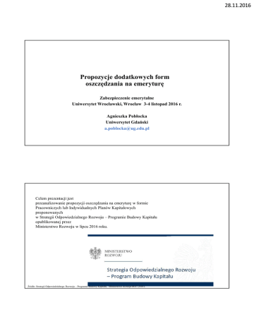 28.11.2016 Propozycje dodatkowych form oszczędzania na emeryturę Zabezpieczenie emerytalne Uniwersytet Wrocławski, Wrocław 3-4 listopad 2016 r. Agnieszka Pobłocka Uniwersytet Gdański [email protected] Celem prezentacji jest przeanalizowanie propozycji oszczędzania na emeryturę w formie Pracowniczych lub Indywidualnych Planów Kapitałowych proponowanych w Strategii Odpowiedzialnego Rozwoju – Programie Budowy Kapitału opublikowanej przez Ministerstwo Rozwoju w lipcu 2016 roku. Źródło: Strategii Odpowiedzialnego Rozwoju – Programie Budowy Kapitału, Ministerstwo rozwoju 06.07.2016 r. 28.11.2016 Źródło: Strategii Odpowiedzialnego Rozwoju – Programie Budowy Kapitału, Ministerstwo rozwoju 06.07.2016 r. Dane na dzień 30 czerwca 2016 r, IKZE IKE PPE Łącznie Rok powstania 2012 2004 1999 Liczba kont 613,9 tys. 867 tys. 392,6 tys. 1873,5 tys. Udział w pracujących wg BAEL 3,80% 5,40% 2,40% 11,60% Aktywa 764,1 mln zł 6 mld zł 10,6 mld zł 17,36 mld Liczba kont aktywnych (przynajmiej 1 wpłata w wokresie) 101,7 tys. 212,2 tys. 329,7 tys. 643,6 tys. Wskaźnik aktywnych kont w I półroczu 2016 r. 16,60% 24,40% 84% 34,35% Źródło: Strategii Odpowiedzialnego Rozwoju – Programie Budowy Kapitału, Ministerstwo rozwoju 06.07.2016 r. 28.11.2016 Źródło: Strategii Odpowiedzialnego Rozwoju – Programie Budowy Kapitału, Ministerstwo rozwoju 06.07.2016 r. Źródło: Strategii Odpowiedzialnego Rozwoju – Programie Budowy Kapitału, Ministerstwo rozwoju 06.07.2016 r. 28.11.2016 Źródło: Strategii Odpowiedzialnego Rozwoju – Programie Budowy Kapitału, Ministerstwo rozwoju 06.07.2016 r. Źródło: Strategii Odpowiedzialnego Rozwoju – Programie Budowy Kapitału, Ministerstwo rozwoju 06.07.2016 r. 28.11.2016 Symulacja wysokości zgromadzonego kapitału i świadczeń z podatkiem stopa zastąpienia realna stopa procentowa realne roczne tempo wynagrodzeń wynagrodzenie początkowe składka w okresie oszczędzania częstotliwość opłacania składek wynagrodzenie końcowe zgromadzone aktywa okres wypłaty wypłata jednorazowaa procent aktywów bez opodatkowania od dochodów kapitałowych 10% od dochodów kapitałowych 19% dochodowym 10% (przy wypłacie) i od dochodów kapitałowych 19% 3% 2% 4 333 zł 4% miesięcznie 9 379,81 zł 222 212,40 zł 18 lat nie 55 553 zł 100% 75% 14,1% 13,5% 13,0% 10,1% 10,6% 9,7% 9,5% 8,8% Źródło: Strategii Odpowiedzialnego Rozwoju – Programie Budowy Kapitału, Ministerstwo rozwoju 06.07.2016 r. Źródło: Opracowanie własne Symulacja wysokości zgromadzonego kapitału i świadczeń - dla realnej stopy procentowej 3 % z podatkiem stopa zastąpienia realna stopa procentowa realne roczne tempo wynagrodzeń wynagrodzenie początkowe składka w okresie oszczędzania częstotliwość opłacania składek wynagrodzenie końcowe zgromadzone aktywa okres wypłaty wypłata jednorazowaa procent aktywów bez opodatkowania od dochodów kapitałowych 10% od dochodów kapitałowych 19% Źródło: Opracowanie własne dochodowym 10% (przy wypłacie) i od dochodów kapitałowych 19% 4% 3% 2% 4 333 zł 7% miesięcznie 9 379,81 zł 222 212,40 zł 388 871,00 zł 18 lat nie 55 553 zł nie 97 217 zł 100% 75% 100% 75% 14,1% 13,5% 24,7% 18,5% 13,0% 10,1% 23,7% 17,7% 10,6% 9,7% 22,7% 17,0% 9,5% 8,8% 16,7% 15,3% 28.11.2016 Symulacja wysokości zgromadzonego kapitału i świadczeń - dla realnej stopy procentowej 2 % z podatkiem stopa zastąpienia realna stopa procentowa realne roczne tempo wynagrodzeń wynagrodzenie początkowe składka w okresie oszczędzania częstotliwość opłacania składek wynagrodzenie końcowe zgromadzone aktywa okres wypłaty wypłata jednorazowaa procent aktywów bez opodatkowania od dochodów kapitałowych 10% od dochodów kapitałowych 19% dochodowym 10% (przy wypłacie) i od dochodów kapitałowych 19% 4% 2% 2% 4 333 zł 7% miesięcznie 9 379,81 zł 181 737,32 zł 318 040,03 zł 18 lat nie 45 434 zł nie 79 510 zł 100% 75% 100% 75% 10,7% 8,0% 18,7% 14,0% 10,3% 7,7% 18,1% 13,6% 10,0% 7,5% 17,6% 13,2% 7,2% 6,8% 12,6% 11,9% Źródło: Opracowanie własne Symulacja wysokości zgromadzonego kapitału i świadczeń - dla realnej stopy procentowej 1 % Źródło: Opracowanie własne z podatkiem stopa zastąpienia realna stopa procentowa realne roczne tempo wynagrodzeń wynagrodzenie początkowe składka w okresie oszczędzania częstotliwość opłacania składek wynagrodzenie końcowe zgromadzone aktywa okres wypłaty wypłata jednorazowaa procent aktywów bez opodatkowania od dochodów kapitałowych 10% od dochodów kapitałowych 19% dochodowym 10% (przy wypłacie) i od dochodów kapitałowych 19% 4% 1% 2% 4 333 zł 7% miesięcznie 9 379,81 zł 150 260,97 zł 262 956,49 zł 18 lat nie 37 565 zł nie 65 739 zł 100% 75% 100% 75% 8,1% 6,1% 14,2% 10,6% 8,0% 6,0% 13,9% 10,5% 7,8% 5,9% 13,7% 10,3% 5,5% 5,3% 9,6% 9,3% 28.11.2016 Wnioski • Wysokość dodatku do emerytury z PPK i IPK zależy m.in.: • wieku przystąpienia do programu, okresu oszczędzania, płci • stopy procentowej, stopy wzrostu płac • stopy zastąpienia • (nie zależy od wynagrodzenia, a tylko od tempa wzrostu wynagrodzenia) • Brak informacji • o przyjętych w Strategii Odpowiedzialnego rozwoju – • Programie budowy Kapitału założeniach • - dotyczących wyników oszczędzania (m. in. tablicach Trwania Życia) Tablica trw ania życia 2015 Płeć 1-mężcz. 2-kobiety 1 1 2 2 3 Wiek x Przeciętne dalsze trw anie życia 62 65 65 68 65 • W projekcie nie rozstrzygnięto, • w jakiej wysokości będzie podatek od zysków kapitałowych - oszczędności (podatek Belki)? • czy będzie można podjąć pracę na emeryturze • czy oszczędzanie w PPK i IPK będzie podlegało podatkowi dochodowemu? ex 17,63 15,71 20,06 17,72 18,01 • jeżeli tak, to uczestnik programu będzie miał mniejsze oszczędności • czy opodatkowane będą wpłacane składki, czy wypłacane świadczenia? • jeśli wypłacane świadczenia, to wystąpią większe koszty o ile uczestnik prog