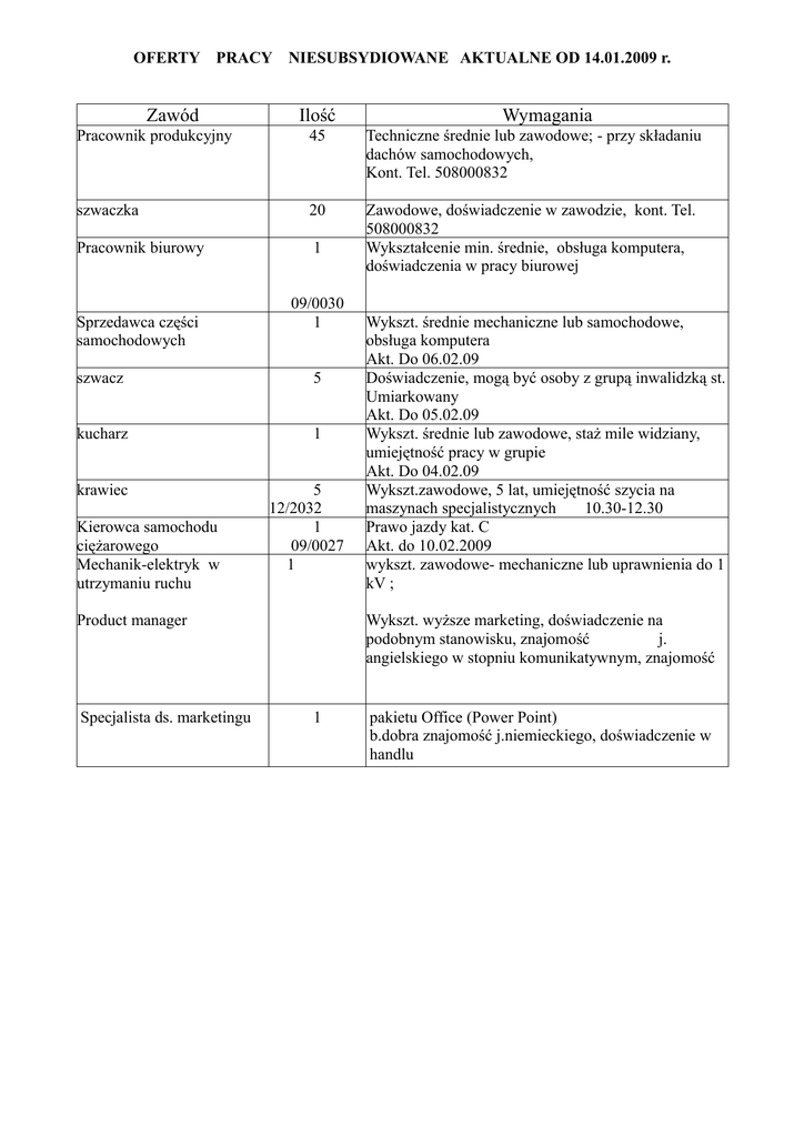 OFERTY PRACY NIESUBSYDIOWANE AKTUALNE OD 14.01.2009 r. Zawód Ilość Wymagania Pracownik produkcyjny 45 Techniczne średnie lub zawodowe; - przy składaniu dachów samochodowych, Kont. Tel. 508000832 szwaczka 20 Pracownik biurowy 1 Zawodowe, doświadczenie w zawodzie, kont. Tel. 508000832 Wykształcenie min. średnie, obsługa komputera, doświadczenia w pracy biurowej Sprzedawca części samochodowych 09/0030 1 szwacz 5 kucharz 1 krawiec Kierowca samochodu ciężarowego Mechanik-elektryk w utrzymaniu ruchu 5 12/2032 1 09/0027 1 Product manager Specjalista ds. marketingu Wykszt. średnie mechaniczne lub samochodowe, obsługa komputera Akt. Do 06.02.09 Doświadczenie, mogą być osoby z grupą inwalidzką st. Umiarkowany Akt. Do 05.02.09 Wykszt. średnie lub zawodowe, staż mile widziany, umiejętność pracy w grupie Akt. Do 04.02.09 Wykszt.zawodowe, 5 lat, umiejętność szycia na maszynach specjalistycznych 10.30-12.30 Prawo jazdy kat. C Akt. do 10.02.2009 wykszt. zawodowe- mechaniczne lub uprawnienia do 1 kV ; Wykszt. wyższe marketing, doświadczenie na podobnym stanowisku, znajomość j. angielskiego w stopniu komunikatywnym, znajomość 1 pakietu Office (Power Point) b.dobra znajomość j.niemieckiego, doświadczenie w handlu INFORMACJA O WOLNYM MIEJSCU PRACY A KTUALNE OD 14.01.2009 r Zawód Ilość Wymagania Frezer 1 Pracownik ochrony 1 Specjalista ds. BHP 1 Pracownik hurtowni 1 Przedstawiciel handlowy 1 Hydraulik Laborant ds.pomiarów długości i kąta 1 1 Wykszt. zawodowe, doświadczenie-manualne Akt. Do 06.02.09 orzeczenie o stopniu niepełnosprawności – umiarkowane Wyższe lub podyplomowe w specjalności BHP, minimum roczne doświadczenie pracy w służbie BHP, adres e-mail: [email protected] Wykszt. Min. zawodowe, prawo jazdy kat. B mile widziane, obsługa komputera : World, Exel praca w Żarach kontakt mailowo bądź pisemnie na adres: ul. Jasna 8, 66-010 Nowogród Bobrz. mail: [email protected] Wykszt. min. średnie, mile widziane doświadczenie, prawo jazdy kat. B Wyk. Zawodowe, Wykszt.wyższe lub średnie techniczne o kierunku mechanicznym, znajomość rysunku technicznego maszynowego, 1 Konserwator utrzymania ruchu,elektryk Wykszt.zawodowe-elektryk lub elektronik, uprawnienia elektryczne do 1kV INFORMACJA O WOLNYM MIEJSCU PRACY DLA NAUCZYCIELI Nauczyciel j.angielskiego 1 Pedagog Psycholog 1 1 Wykształcenie wyższe, może być licencjat Wykszt. Wyższe – kierunkowe, praca na ½ etatu