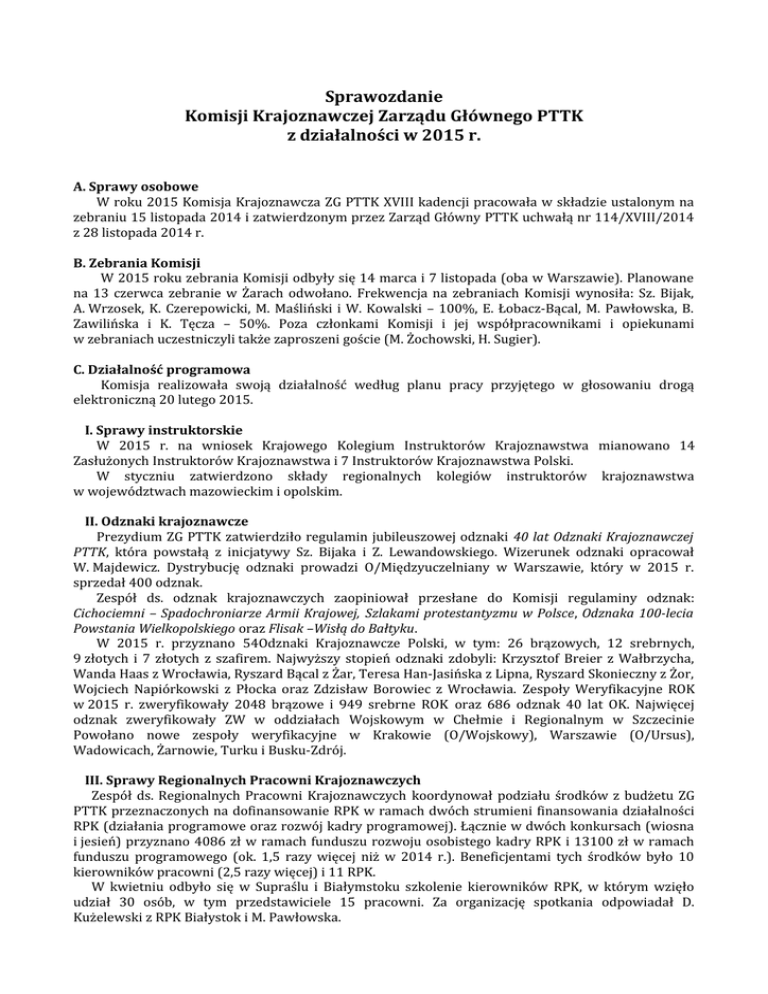 Sprawozdanie Komisji Krajoznawczej Zarządu Głównego PTTK z działalności w 2015 r. A. Sprawy osobowe W roku 2015 Komisja Krajoznawcza ZG PTTK XVIII kadencji pracowała w składzie ustalonym na zebraniu 15 listopada 2014 i zatwierdzonym przez Zarząd Główny PTTK uchwałą nr 114/XVIII/2014 z 28 listopada 2014 r. B. Zebrania Komisji W 2015 roku zebrania Komisji odbyły się 14 marca i 7 listopada (oba w Warszawie). Planowane na 13 czerwca zebranie w Żarach odwołano. Frekwencja na zebraniach Komisji wynosiła: Sz. Bijak, A. Wrzosek, K. Czerepowicki, M. Maśliński i W. Kowalski – 100%, E. Łobacz-Bącal, M. Pawłowska, B. Zawilińska i K. Tęcza – 50%. Poza członkami Komisji i jej współpracownikami i opiekunami w zebraniach uczestniczyli także zaproszeni goście (M. Żochowski, H. Sugier). C. Działalność programowa Komisja realizowała swoją działalność według planu pracy przyjętego w głosowaniu drogą elektroniczną 20 lutego 2015. I. Sprawy instruktorskie W 2015 r. na wniosek Krajowego Kolegium Instruktorów Krajoznawstwa mianowano 14 Zasłużonych Instruktorów Krajoznawstwa i 7 Instruktorów Krajoznawstwa Polski. W styczniu zatwierdzono składy regionalnych kolegiów instruktorów krajoznawstwa w województwach mazowieckim i opolskim. II. Odznaki krajoznawcze Prezydium ZG PTTK zatwierdziło regulamin jubileuszowej odznaki 40 lat Odznaki Krajoznawczej PTTK, która powstałą z inicjatywy Sz. Bijaka i Z. Lewandowskiego. Wizerunek odznaki opracował W. Majdewicz. Dystrybucję odznaki prowadzi O/Międzyuczelniany w Warszawie, który w 2015 r. sprzedał 400 odznak. Zespół ds. odznak krajoznawczych zaopiniował przesłane do Komisji regulaminy odznak: Cichociemni – Spadochroniarze Armii Krajowej, Szlakami protestantyzmu w Polsce, Odznaka 100-lecia Powstania Wielkopolskiego oraz Flisak –Wisłą do Bałtyku. W 2015 r. przyznano 54Odznaki Krajoznawcze Polski, w tym: 26 brązowych, 12 srebrnych, 9 złotych i 7 złotych z szafirem. Najwyższy stopień odznaki zdobyli: Krzysztof Breier z Wałbrzycha, Wanda Haas z Wrocławia, Ryszard Bącal z Żar, Teresa Han-Jasińska z Lipna, Ryszard Skonieczny z Żor, Wojciech Napiórkowski z Płocka oraz Zdzisław Borowiec z Wrocławia. Zespoły Weryfikacyjne ROK w 2015 r. zweryfikowały 2048 brązowe i 949 srebrne ROK oraz 686 odznak 40 lat OK. Najwięcej odznak zweryfikowały ZW w oddziałach Wojskowym w Chełmie i Regionalnym w Szczecinie Powołano nowe zespoły weryfikacyjne w Krakowie (O/Wojskowy), Warszawie (O/Ursus), Wadowicach, Żarnowie, Turku i Busku-Zdrój. III. Sprawy Regionalnych Pracowni Krajoznawczych Zespół ds. Regionalnych Pracowni Krajoznawczych koordynował podziału środków z budżetu ZG PTTK przeznaczonych na dofinansowanie RPK w ramach dwóch strumieni finansowania działalności RPK (działania programowe oraz rozwój kadry programowej). Łącznie w dwóch konkursach (wiosna i jesień) przyznano 4086 zł w ramach funduszu rozwoju osobistego kadry RPK i 13100 zł w ramach funduszu programowego (ok. 1,5 razy więcej niż w 2014 r.). Beneficjentami tych środków było 10 kierowników pracowni (2,5 razy więcej) i 11 RPK. W kwietniu odbyło się w Supraślu i Białymstoku szkolenie kierowników RPK, w którym wzięło udział 30 osób, w tym przedstawiciele 15 pracowni. Za organizację spotkania odpowiadał D. Kużelewski z RPK Białystok i M. Pawłowska. IV. Sprawy kolekcjonerskie Na wniosek Podkomisji ds. kolekcjonerstwa krajoznawczego dokonano kolejnych mianowań Jurorów Zbiorów Krajoznawczych. Uprawnienie to otrzymali Elżbieta i Zygmunt Kałuża z Rzeszowa oraz Alicja Wrzosek z Gdyni. D. Działalność organizacyjna I. Jubileusz 110-lecia powstania Polskiego Towarzystwa Krajoznawczego We współpracy z Komisją Historii i Tradycji ZG PTTK przygotowano wstępne założenia, kosztorys i harmonogram działań związanych z jubileuszem 110-lecia powstania Polskiego Towarzystwa Krajoznawczego, co dwukrotnie przedstawiano na zebraniach Zarządu Głównego PTTK. ZG PTTK uchwałą nr 158/XVIII/2015 z 27 czerwca 2015 r. ustanowił, że obchody rocznicy założenia PTKraj będą się odbywać pod hasłem Roku Krajoznawstwa Polskiego. Jesienią przygotowano wspólnie z J. Śledzińską, sekretarzem ZG PTTK ds. promocji, wniosek do Ministerstwa Sportu o dofinansowanie m.in. działań związanych z jubileuszem 110-lecia PTKraj. Sz. Bijak opracował również propozycję regulaminu konkursu na najlepsza pracę dyplomową związaną z krajoznawstwem. Projekt został przekazany do Prezydium ZG PTTK w celu zatwierdzenia. II. XLV Centralny Zlot Krajoznawców CZAK w Krasnobrodzie XLV CZAK odbył się w dniach 19–23 sierpnia i został zorganizowany przez Oddział Wojskowy PTTK w Chełmie. Komandorem Zlotu był Witold Kliza. Na CZAK przyjechało 89 osób, w tym 7 to Zasłużeni Instruktorzy Krajoznawstwa, 16 – Instruktorzy Krajoznawstwa Polski i 14 - Regionu. Zlot był poprzedzony trzema wycieczkami przedzlotowymi (w tym do Lwowa). Podczas CZAK, z inicjatywy Podkomisji ds. kolekcjonerstwa, odbyła się prezentacja zbiorów kol. Z. Kałuży z Rzeszowa. Wśród uczestników Zlotu przeprowadzono konkurs krajoznawczy. III. XXIV Przegląd Książki Krajoznawczej i Turystycznej XXIV Przegląd Książki Krajoznawczej i Turystycznej został przygotowany i zrealizowany przez Centralną Bibliotekę PTTK, przy współpracy z Wielkopolskim Klubem Publicystów Krajoznawczych i Oddziałem Poznańskim PTTK. Komisarzem Przeglądu była M. Janowicz. Z ramienia Komisji w pracach jury Przeglądu udział wzięli K. R. Mazurski (jako przewodniczący) i K. Tęcza, a M. Pawłowska reprezentowała Centralną Bibliotekę PTTK. Łącznie na Przegląd nadesłano 175 publikacje. Jury obradowało w Warszawie w dn. 11-12 września. Prezentacja laureatów i wręczenie nagród miały miejsce 23–25 października w Poznaniu podczas Targów Regionów i Produktów Turystycznych Tour Salon. Aktywny wkład w powstanie i prowadzenie stoiska Przeglądu m