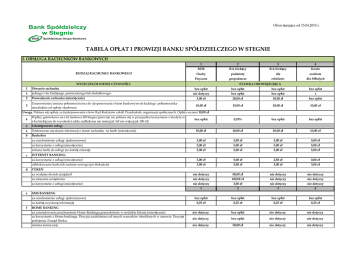 Obowiązująca od 15.04.2015 r. TABELA OPŁAT I PROWIZJI BANKU SPÓŁDZIELCZEGO W STEGNIE I. OBSŁUGA RACHUNKÓW BANKOWYCH RODZAJ RACHUNKU BANKOWEGO 1 2 3 4 ROR R-k bieżący R-k bieżący Konto Osoby podmioty dla osobiste Fizyczne gospodarcze rolników dla Młodych bez opłat bez opłat bez opłat nie dotyczy bez opłat bez opłat x WYSZCZEGÓLNIENIE CZYNNOŚCI STAWKA OBOWIĄZUJĄCA 1 Otwarcie rachunku a jednego r-ku bieżącego, pomocniczego lub dodatkowego 2 Prowadzenie rachunku (miesięcznie) 3,00 zł 20,00 zł 10,00 zł bez opłat 3 Ustanowienie/zmiana pełnomocnictwa do dysponowania r-kiem bankowym-od każdego pełnomocnika niezależnie od opłaty skarbowej 10,00 zł 15,00 zł 10,00 zł 10,00 zł bez opłat 0,10% bez opłat bez opłat 10,00 zł 10,00 zł 10,00 zł 10,00 zł za uruchomienie usługi (jednorazowo) 5,00 zł 5,00 zł 5,00 zł 5,00 zł za korzystanie z usługi (miesięcznie) 5,00 zł 5,00 zł 5,00 zł 5,00 zł zmiana hasła do usługi (za każdą zmianę) 5,00 zł 5,00 zł 5,00 zł 5,00 zł za korzystanie z usługi (miesięcznie) 3,00 zł 5,00 zł 2,50 zł 0,00 zł odblokowanie hasła lub nadanie nowego (po blokadzie) 3,00 zł 5,00 zł 3,00 zł 3,00 zł bez opłat Uwaga: Pobiera się opłaty za funkcjonowanie r-ków Rad Rodziców szkół, Przedszkoli, organizacji społecznych. Opłata wynosi 10,00 zł 4 5 a b c d e Wpłaty gotówkowe na r-ki bankowe BS Stegna (prowizji nie pobiera się w przypadku korzystania z kredytu w r-ku bieżącym do wysokości salda zadłużenia nie mniej jak 3zł nie więcej jak 100 zł) Udostępnienie usług: Telefoniczne uzyskanie informacji o stanie rachunku na hasło (miesięcznie) Bankofon INTERNET BANKING: TOKEN za wydanie dwóch urządzeń nie dotyczy 80,00 zł nie dotyczy nie dotyczy za utracenie urządzenia za korzystanie z usługi (miesięcznie) nie dotyczy nie dotyczy 1 100,00 zł 3,00 zł 2 nie dotyczy nie dotyczy 3 nie dotyczy nie dotyczy 4 bez opłat bez opłat bez opłat bez opłat 0,25 zł 0,25 zł 0,25 zł 0,25 zł nie dotyczy bez opłat nie dotyczy nie dotyczy nie dotyczy bez opłat nie dotyczy nie dotyczy nie dotyczy 50,00 zł nie dotyczy nie dotyczy SMS BANKING za uruchomienie usługi (jednorazowo) za każdą uzyskaną informację f HOME BANKING za zainstalowanie,uruchomienie Home Bankingu,przeszkolenie w siedzibie klienta (miesięcznie) za korzystanie z Home bankingu. Decyzja uzależniona od innych warunków określonych w umowie. Decyzję podejmuje Zarząd Banku. zmiana autoryzacji 6 6.1. Polecenie przelewu: przelew wewnętrzny na rachunki prowadzone w BS w Stegnie realizowany: a w Placówkach Banku bez opłat bez opłat bez opłat bez opłat b za pośrednictewm Internet Bankingu skierowany na rachunki w BS w Stegnie bez opłat bez opłat bez opłat bez opłat 6.2. przelew wychodzący do innego banku realizowany: a w Placówkach Banku (za jeden przelew) 2,50 zł 2,50 zł 2,50 zł 2,50 zł b za pośrednictwem Internet Bankingu 0,50 zł 1,00 zł 1,00 zł 0,50 zł c za pośrednictwem Internet Bankingu poprzez system Blue Cash 5,00 zł 5,00 zł 5,00 zł 5,00 zł d realizowany poprzez System BlueCash (za jeden przelew) 5,00 zł 5,00 zł 5,00 zł 5,00 zł f realizowane poprzez system Sorbnet (dodatkowo od każdego przelewu) 25,00 zł 25,00 zł 25,00 zł 25,00 zł g generowane w systemie Home Banking (za jeden przelew) nie dotyczy 2,50 zł 2,50 zł nie dotyczy 7 Polecenie zapłaty: a złożenie zlecenia wykonania zapłaty przez wierzyciela w formie elektronicznej 5,00 zł 5,00 zł 5,00 zł 5,00 zł b realizacja polecenia zapłaty z r-ku dłużnika 2,50 zł 2,50 zł 2,50 zł 2,50 zł c odwołanie polecenia zapłaty (za złożenie jednego odwołania) lub aktualizacja upoważnienia polecenia zapłaty 5,00 zł 5,00 zł 5,00 zł 5,00 zł 8 Wypłaty czeków gotówkowych umiejscowionych: a ze wszystkich r-ków na rzecz posiadacza r-ku(nie mniej niż 3 zł nie więcej jak 100 zł) nie dotyczy 0,10% bez opłat nie dotyczy b z wszystkich r-ków na rzecz os. trzecich (nie mniej niż 3 zł nie więcej niż 100 zł) nie dotyczy 0,10% bez opłat nie dotyczy c realizowanych wpływów bieżących nie dotyczy x bez opłat nie dotyczy 9 Potwierdzenie czeku gotówkowego i rozrachunkowego 15,00 zł 15,00 zł 15,00 zł a przyjęcie czeku do inkasa 25,00 zł 25,00 zł 25,00 zł nie dotyczy nie dotyczy 10 Wydanie książeczki czekowej Zgłoszenie oraz odwołanie zastrzeżenia o utracie czeków i blankietów czekowych x x 15,00 zł 30,00 zł 15,00 zł 30,00 zł nie dotyczy 11 1 2 3 4 12 a Potwierdzenia, wyciąg z rachunku, odpisy, zaświadczenia: c Sporządzenie odpisu obrotów na jednym r-ku z bieżącego roku kalendarzowego Za wydanie klientom-na ich wniosek zaświadczenia stwierdzającego posiadanie rachunku,wysokość salda lub opinii o r-ku, stanie oszczędności Za przekazywanie pocztą wyciągów bankowych raz w miesiącu * * * drogą elektroniczną d e b nie dotyczy Strona pierwsza 5,00 zł każda następna 2,00 zł 30,00 zł 30,00 zł 30,00 zł 30,00 zł bez opłat bez opłat bez opłat bez opłat sporządzenie wyciągu po każdorazowej zmianie salda (odbiór osobisty) 3,00 zł 3,00 zł 3,00 zł 3,00 zł wysyłanie wyciągów pocztą po każdorazowej zmianie salda 5,00 zł 5,00 zł 5,00 zł 5,00 zł bez opłat bez opłat bez opłat bez opłat Sporządzenie odpisu wyciągu bankowego (bez załączników) 15,00 zł 15,00 zł 15,00 zł 15,00 zł 5,00 zł 5,00 zł 5,00 zł 5,00 zł f Sporządzenie odpisu każdego załącznika do wyciągu Sporządzenie odpisu dokumentu pozostającego w archiwum banku w przypadku gdy: * klient określi datę dokonania operacji 25,00 zł 25,00 zł 25,00 zł 25,00 zł * g klient nie określi daty dokonania operacji 30,00 zł 3,00 zł 30,00 zł 3,00 zł 30,00 zł 3,00 zł 30,00 zł 3,00 zł za potwierdzenie dokonania transakcji,która została wykonana za pośrednictwem Internet Bankingu 13 Realizacja zleceń stałych: a na rachunki w BS Stegna 1,00 zł 1,00 zł 1,00 zł 1,00 zł b na rachunki w innych bankach 3,00 zł 3,0