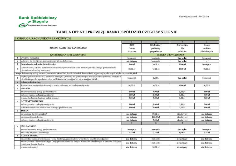 tabela opłat i prowizji banku spółdzielczego w stegnie