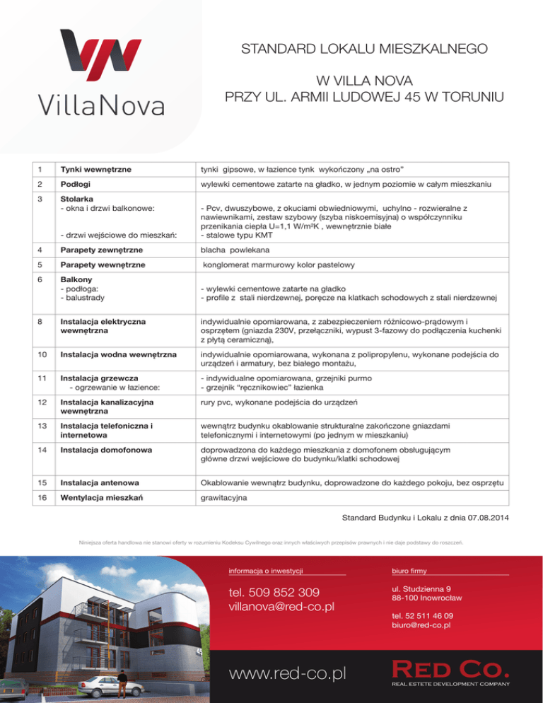STANDARD LOKALU MIESZKALNEGO W VILLA NOVA PRZY UL. ARMII LUDOWEJ 45 W TORUNIU 1 Tynki wewnętrzne tynki gipsowe, w łazience tynk wykończony „na ostro” 2 Podłogi wylewki cementowe zatarte na gładko, w jednym poziomie w całym mieszkaniu 3 Stolarka - okna i drzwi balkonowe: - drzwi wejściowe do mieszkań: - Pcv, dwuszybowe, z okuciami obwiedniowymi, uchylno - rozwieralne z nawiewnikami, zestaw szybowy (szyba niskoemisyjna) o współczynniku przenikania ciepła U=1,1 W/m²K , wewnętrznie białe - stalowe typu KMT 4 Parapety zewnętrzne blacha powlekana 5 Parapety wewnętrzne konglomerat marmurowy kolor pastelowy 6 Balkony - podłoga: - balustrady - wylewki cementowe zatarte na gładko - profile z stali nierdzewnej, poręcze na klatkach schodowych z stali nierdzewnej 8 Instalacja elektryczna wewnętrzna indywidualnie opomiarowana, z zabezpieczeniem różnicowo-prądowym i osprzętem (gniazda 230V, przełączniki, wypust 3-fazowy do podłączenia kuchenki z płytą ceramiczną), 10 Instalacja wodna wewnętrzna indywidualnie opomiarowana, wykonana z polipropylenu, wykonane podejścia do urządzeń i armatury, bez białego montażu, 11 Instalacja grzewcza - ogrzewanie w łazience: - indywidualne opomiarowana, grzejniki purmo - grzejnik “ręcznikowiec” łazienka 12 Instalacja kanalizacyjna wewnętrzna rury pvc, wykonane podejścia do urządzeń 13 Instalacja telefoniczna i internetowa wewnątrz budynku okablowanie strukturalne zakończone gniazdami telefonicznymi i internetowymi (po jednym w mieszkaniu) 14 Instalacja domofonowa doprowadzona do każdego mieszkania z domofonem obsługującym główne drzwi wejściowe do budynku/klatki schodowej 15 Instalacja antenowa Okablowanie wewnątrz budynku, doprowadzone do każdego pokoju, bez osprzętu 16 Wentylacja mieszkań grawitacyjna Standard Budynku i Lokalu z dnia 07.08.2014 Niniejsza oferta handlowa nie stanowi oferty w rozumieniu Kodeksu Cywilnego oraz innych właściwych przepisów prawnych i nie daje podstawy do roszczeń. informacja o inwestycji biuro firmy tel. 509 852 309 [email protected] ul. Studzienna 9 88-100 Inowrocław www.red-co.pl tel. 52 511 46 09 [email protected] STANDARD BUDYNKU I ZAGOSPODAROWANIA TERENU W VILLA NOVA PRZY UL. ARMII LUDOWEJ 45 W TORUNIU 1 Ściany i stropy Ściany zewnętrzne z SILKA 24 ocieplone styropianem grubości 15 cm, słupy żelbetowe, stropy żelbetowe prefabrykowane typu Filigran, 2 Elewacja tynk mineralny, parapety zewnętrzne z blachy powlekanej 3 Dach Stropodach kryty papą termozgrzewalną, wpusty dachowe kanalizacji opadowej 4 Wejścia do budynku - główne: drzwi stalowe, zestaw szybowy (szyba niskoemisyjna) o współczynniku przenikania ciepła U=1,1 W/m²K, otwierane domofonem, 5 Pomieszczenia wspólnie użytkowane: płytki granitowe na posadzkach, stopnie i podstopnie na schodach granitowe, ściany malowane, oświetlenie korytarzy lampami z czujnikami ruchu, oświetlenia numeru domu, oświetlenie komunikacji, wejść do budynku, instalacja elektryczna rozliczana osobnym licznikiem, 6 Okna PCV, zestaw szybowy (szyba niskoemisyjna) o współczynniku przenikania ciepła U=1,1 W/m²K z nawiewnikami, wewnętrznie białe 7 Standard wielostanowiskowego garażu podziemnego brama wjazdowa segmentowa, sterowana pilotem i mechanicznie, posadzki utwardzane powierzchniowo, beton gładki na słupach żelbetowych, ściany z silki malowane, oświetlenie lampami z czujnikami ruchu, wentylacja mechaniczna, wymagane przepisami oznaczenia. 8 Kotłownia Gazowa automatyczna, - dostarczająca media CO i CWU dla całego budynku 9 Drogi, ciągi pieszo-jezdne, miejsca parkingowe kostka brukowa szara, miejsca parkingowe oznaczone pasami kostki kolorowej 10 Zieleń Trawa i krzewy na terenach wspólnych wokół budynku 11 Uzbrojenie terenu kanalizacja deszczowa, kanalizacja sanitarna, przyłącze gazu, wody i elektryczne, oświetlenie terenu Standard Budynku i Lokalu z dnia 07.08.2014 Niniejsza oferta handlowa nie stanowi oferty w rozumieniu Kodeksu Cywilnego oraz innych właściwych przepisów prawnych i nie daje podstawy do roszczeń. informacja o inwestycji biuro firmy tel. 509 852 309 [email protected] ul. Studzienna 9 88-100 Inowrocław www.red-co.pl tel. 52 511 46 09 [email protected]