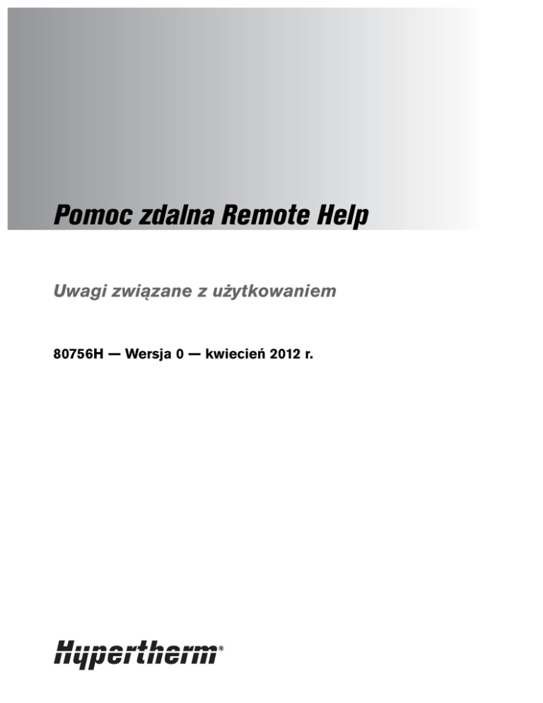 Pomoc zdalna Remote Help Uwagi związane z użytkowaniem 80756H — Wersja 0 — kwiecień 2012 r. Hypertherm, Inc. Etna Road, P.O. Box 5010 Hanover, NH 03755 USA 603-643-3441 Tel (Main Office) 603-643-5352 Fax (All Departments) [email protected] (Main Office Email) 800-643-9878 Tel (Technical Service) [email protected] (Technical Service Email) 800-737-2978 Tel (Customer Service) [email protected] (Customer Service Email) Hypertherm Automation 5 Technology Drive, Suite 300 West Lebanon, NH 03784 USA 603-298-7970 Tel 603-298-7977 Fax Hypertherm Plasmatechnik GmbH Technologiepark Hanau Rodenbacher Chaussee 6 D-63457 Hanau-Wolfgang, Deutschland 49 6181 58 2100 Tel 49 6181 58 2134 Fax 49 6181 58 2123 (Technical Service) Hypertherm (S) Pte Ltd. 82 Genting Lane Media Centre Annexe Block #A01-01 Singapore 349567, Republic of Singapore 65 6841 2489 Tel 65 6841 2490 Fax 65 6841 2489 (Technical Service) Hypertherm (Shanghai) Trading Co., Ltd. Unit A, 5th Floor, Careri Building 432 West Huai Hai Road Shanghai, 200052 PR China 86-21 5258 3330/1 Tel 86-21 5258 3332 Fax Hypertherm Europe B.V. Vaartveld 9 4704 SE Roosendaal, Nederland 31 165 596907 Tel 31 165 596901 Fax 31 165 596908 Tel (Marketing) 31 165 596900 Tel (Technical Service) 00 800 4973 7843 Tel (Technical Service) Hypertherm Japan Ltd. Level 9, Edobori Center Building 2-1-1 Edobori, Nishi-ku Osaka 550-0002 Japan 81 6 6225 1183 Tel 81 6 6225 1184 Fax Hypertherm Brasil Ltda. Rua Brás Cubas, 231 - Jardim Maia CEP 07115-030 Guarulhos - SP - Brasil 55 11 2409 2636 Tel 55 11 2408 0462 Fax Hypertherm México, S.A. de C.V. Avenida Toluca No. 444, Anexo 1, Colonia Olivar de los Padres Delegación Álvaro Obregón México, D.F. C.P. 01780 52 55 5681 8109 Tel 52 55 5683 2127 Fax Hypertherm Korea Branch #3904 Centum Leaders Mark B/D, 1514 Woo-dong, Haeundae-gu, Busan Korea, 612-889 82 51 747 0358 Tel 82 51 701 0358 Fax © 2012 Hypertherm, Inc. Wszelkie prawa zastrzeżone Hypertherm i Remote Help to znaki handlowe firmy Hypertherm Inc. i mogą być zastrzeżone w Stanach Zjednoczonych i/lub innych krajach. Lync, Microsoft, Outlook, Silverlight i Windows to zastrzeżone znaki towarowe firmy Microsoft Corporation. Spis treści Wprowadzenie ........................................................................................................................................... 1 Wymagania dotyczące narzędzia Remote Help........................................................................................ 1 Przed rozpoczęciem .................................................................................................................................. 1 Instalacja klienta programu Microsoft Lync............................................................................................ 3 Główne okno programu Lync ................................................................................................................. 3 Rozpoczynanie spotkania.......................................................................................................................... 4 Zapraszanie systemu CNC do spotkania .............................................................................................. 4 Uruchamianie spotkania z systemu CNC .............................................................................................. 6 Udostępnianie pulpitu .......................................................................................................................... 10 Komunikacja przy użyciu narzędzia Remote Help .................................................................................. 12 Kontrolowanie spotkania ...................................................................................................................... 12 Udostępnianie plików ........................................................................................................................... 13 Używanie tablicy .................................................................................................................................. 14 Historia spotkań ................................................................................................................................... 15 Pomoc zdalna Remote Help Wprowadzenie Pomoc zdalna Remote Help to internetowe narzędzie diagnostyczne, które umożliwia pracującemu zdalnie technikowi i operatorowi wspólne rozwiązywanie problemów z systemem CNC, systemem plazmowym lub stołem cięcia. Dzięki narzędziu Remote Help diagnostykę i naprawy można często zrealizować bez konieczności wizyty technika na miejscu w lokalizacji użytkownika. Oznacza to, że stół cięcia może zostać szybko przywrócony do działania, bez dodatkowych kosztów związanych z czasem przestoju i dojazdem serwisu. Niektóre zastosowania narzędzia Remote Help: obserwacja sposobu używania maszyny przez operatora przeglądanie ustawień i konfiguracji przesyłanie plików ustawień, programów części i aktualizacji oprogramowania przeprowadzanie diagnostyki systemów HPR szkolenie operatorów z zakresu nowych funkcji używanie okna czatu w celu prowadzenia dyskusji o funkcjach i problemach Wymagania dotyczące narzędzia Remote Help Do korzystania z narzędzia Remote Help obaj uczestnicy muszą mieć do dyspozycji: połączenie internetowe ® ® system operacyjny Microsoft Windows XP z dodatkiem SP3 lub nowszy ® dodatek Microsoft Silverlight Przed rozpoczęciem Ze względów bezpieczeństwa wyjścia aktywacji napędów w systemie CNC muszą być połączone ze sterownikiem silnika. System CNC wykorzystuje te wyjścia do włączania i wyłączania silników oraz do zezwalania na ruch na stole lub blokowania go. ® Do zainicjowania spotkania zdalny technik musi użyć klienta programu Microsoft Lync . System CNC powinien być wyposażony w klawiaturę PC oraz mysz, tak aby umożliwiać wygodne i szybkie wpisywanie. Kombinacja klawiszy umożliwiająca przywrócenie okna rozmowy do górnej części 