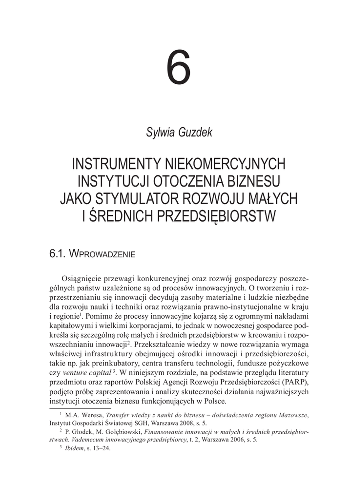 6 Sylwia Guzdek INSTRUMENTY NIEKOMERCYJNYCH INSTYTUCJI OTOCZENIA BIZNESU JAKO STYMULATOR ROZWOJU MAŁYCH I ŚREDNICH PRZEDSIĘBIORSTW 6.1. Wprowadzenie Osiągnięcie przewagi konkurencyjnej oraz rozwój gospodarczy poszczególnych państw uzależnione są od procesów innowacyjnych. O tworzeniu i rozprzestrzenianiu się innowacji decydują zasoby materialne i ludzkie niezbędne dla rozwoju nauki i techniki oraz rozwiązania prawno-instytucjonalne w kraju i regionie1. Pomimo że procesy innowacyjne kojarzą się z ogromnymi nakładami kapitałowymi i wielkimi korporacjami, to jednak w nowoczesnej gospodarce podkreśla się szczególną rolę małych i średnich przedsiębiorstw w kreowaniu i rozpowszechnianiu innowacji2. Przekształcanie wiedzy w nowe rozwiązania wymaga właściwej infrastruktury obejmującej ośrodki innowacji i przedsiębiorczości, takie np. jak preinkubatory, centra transferu technologii, fundusze pożyczkowe czy venture capital 3. W niniejszym rozdziale, na podstawie przeglądu literatury przedmiotu oraz raportów Polskiej Agencji Rozwoju Przedsiębiorczości (PARP), podjęto próbę zaprezentowania i analizy skuteczności działania najważniejszych instytucji otoczenia biznesu funkcjonujących w Polsce. 1 M.A. Weresa, Transfer wiedzy z nauki do biznesu – doświadczenia regionu Mazowsze, Instytut Gospodarki Światowej SGH, Warszawa 2008, s. 5. 2 P. Głodek, M. Gołębiowski, Finansowanie innowacji w małych i średnich przedsiębiorstwach. Vademecum innowacyjnego przedsiębiorcy, t. 2, Warszawa 2006, s. 5. 3 Ibidem, s. 13–24. 165 6.2. Instytucje otoczenia biznesu w świetle teorii i praktyki Współczesne systemy rozwoju przedsiębiorczości powstały w wyniku różnorodnych doświadczeń oraz tworzenia zróżnicowanych strategii i instrumentariów4, które można uporządkować w następujące główne obszary oddziaływania: obniżanie kosztów podejmowania działalności gospodarczej, transfer technologii i pomoc w realizacji przedsięwzięć innowacyjnych, szkoleniowych i doradczych, bezpośrednia pomoc i koordynacja programów wsparcia. Budowa systemów wsparcia jest istotna dla państw nadrabiających zaległości rozwojowe, w szczególności dla społeczeństw postsocjalistycznych. System wsparcia przedsiębiorczości opiera się na programach i instytucjach. Programy są selektywnymi instrumentami skierowanymi do określonych regionów, branż i grup społecznych. Podejmowane doraźnie działania mają na celu uzyskanie zamierzonych efektów strukturalnych i ekonomiczno-społecznych5. Tworzone przez instytucje publiczne programy wsparcia (dotacyjne) zawierają: cel i zakładane efekty, budżet, środki techniczne i zasoby ludzkie, bazę instytucjonalną obejmującą poziom zarządzania i realizacji programu. Nie ma jednego, uniwersalnego wzorca organizacyjnego i funkcjonalnego dla tego typu instytucji. Rozwój systemów wsparcia jest różny w każdym kraju, na co wpływ mają m.in. tradycja oraz uwarunkowania kulturowe – przykładowo kraje kręgu anglosaskiego (np. Wielka Brytania, Holandia) podchodzą z większą ostrożnością do systemów wsparcia w odróżnieniu od państw protekcjonistycznej tradycji „kultury chronionej”, które w większym zakresie formalizują i biurokratyzują działania (np. Francja, Chiny, Korea Południowa). W odniesieniu do podmiotów aktywnych w obszarze wsparcia przedsiębiorczości, innowacyjności i konkurencyjności stosuje się wiele określeń: infrastruktura innowacji i transferu technologii, niekomercyjne otoczenie biznesu, instytucje wsparcia rozwoju gospodarczego, instytucje wsparcia itp. W Polsce najczęściej używa się nazwy „ośrodki innowacji i przedsiębiorczości”. Obecnie najczęściej stosowane definicje innowacji pochodzą z podręcznika Oslo Manual, stanowiącego efekt prac m.in. OECD i Europejskiego Urzędu Statystycznego (Eurostat). Zgodnie z tą terminologią innowacją, a więc zjawiskiem nowym dla danego przedsiębiorstwa (rynku), nazywamy wprowadzenie na rynek nowego lub zmodernizowanego produktu, zastosowanie w produkcji 4 Zob. też: A. Sosnowska i in., Systemy wspierania innowacji i transferu technologii w krajach Unii Europejskiej i w Polsce. Poradnik przedsiębiorcy, PARP, Warszawa 2003. 5 Zob. też: P. Ciacek, Ocena poziomu świadomości i postaw wobec innowacyjności wśród grup docelowych planowanej kampanii promocyjnej, PARP, Warszawa 2009. 166 nowego lub zmodernizowanego procesu. Są to tzw. innowacje technologiczne (produktowe i procesowe). Wyróżnia się ponadto innowacje nietechnologiczne (marketingowe, organizacyjne). Ostatnie badania wskazują na znaczną złożoność obszaru innowacji i innowacyjności, na który nakładają się również wzajemne interakcje i powiązania między podmiotami6. Innowacyjność należy rozpatrywać na trzech poziomach: innowacyjność całej gospodarki, innowacyjność jej głównych graczy, tj. podmiotów gospodarczych, oraz innowacyjność jednostkowa, tzw. kompetencja innowacyjna, określająca postawę danej jednostki wobec zmiany. Warto dodać, że ze względu na sferę, na którą oddziałują, rozróżniamy innowacje popytowe i podażowe. Innowacje sfery popytowej wpływają na konsumentów i wiążą się z działaniami dotyczącymi np. jakości produktu, udziału w rynku, wejścia na nowe rynki – są to innowacje produktowe i marketingowe. Innowacje sfery podażowej odnoszą się do producentów i przedsiębiorstw, dotyczą np. redukcji kosztów, zwiększenia mocy produkcyjnych – są to innowacje organizacyjne i procesowe7. Ważne jest kształtowanie świadomego dążenia przedsiębiorców do wprowadzania innowacji w trosce o podnoszenie konkurencyjności8. Wspieranie innowacyjności jest istotnym elementem polityki rozwoju gospodarczego, a instytucje wsparcia są coraz ważniejszym filarem rozwoju lokalnego9. Różne cele oraz konieczność uwzględnienia lokalnych i regionalnych uwarunkowań determinują dużą różnoro