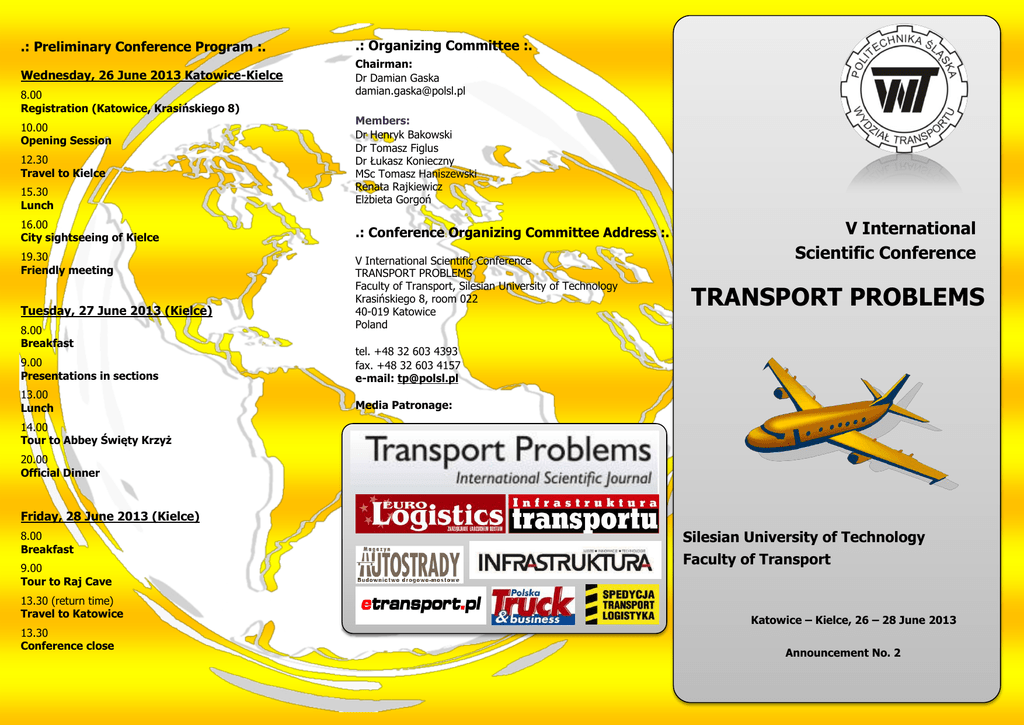 .: Preliminary Conference Program :. .: Organizing Committee :. Wednesday, 26 June 2013 Katowice-Kielce Chairman: Dr Damian Gaska [email protected] 8.00 Registration (Katowice, Krasińskiego 8) 10.00 Opening Session 12.30 Travel to Kielce 15.30 Lunch 16.00 City sightseeing of Kielce 19.30 Friendly meeting Tuesday, 27 June 2013 (Kielce) 8.00 Breakfast Members: Dr Henryk Bakowski Dr Tomasz Figlus Dr Łukasz Konieczny MSc Tomasz Haniszewski Renata Rajkiewicz Elżbieta Gorgoń .: Conference Organizing Committee Address :. V International Scientific Conference TRANSPORT PROBLEMS Faculty of Transport, Silesian University of Technology Krasińskiego 8, room 022 40-019 Katowice Poland 9.00 Presentations in sections tel. +48 32 603 4393 fax. +48 32 603 4157 e-mail: [email protected] 13.00 Lunch Media Patronage: V International Scientific Conference TRANSPORT PROBLEMS 14.00 Tour to Abbey Święty Krzyż 20.00 Official Dinner Friday, 28 June 2013 (Kielce) 8.00 Breakfast 9.00 Tour to Raj Cave 13.30 (return time) Travel to Katowice 13.30 Conference close Silesian University of Technology Faculty of Transport Katowice – Kielce, 26 – 28 June 2013 Announcement No. 2 .: Important dates :. .: International Scientific Committee :. .: Conference topics :. Registration and submission of summarizes 15 April 2013 Chairman: Prof. Aleksander Sładkowski (Poland) Co-chairmans: Prof. Bogusław Łazarz Prof. Stanisław Krawiec Prof. Krystian Wilk (Poland) (Poland) (Poland) Members: Prof. Anvar Adylhodzaev Prof. Rasim Alguliyev Prof. Gerd-Axel Arens Prof. Żilwinas Bazaras Prof. Klaus Becker Prof. Tatiana Čorejová Prof. Anna Dobrzańska-Danikiewicz Prof. Irina Englezi Prof. Radim Farana Prof. Andrzej Fellner Prof. Aleksander Golubenko Dr Rossen Ivanov Prof. Ajay Kapoor Prof. Leonas Povilas Lingaitis Prof. Mirosław Luft Prof. Gabriele Malavasi Dr Marija Malenkovska Todorova Dr Marin Marinov Dr Mareks Mezitis Prof. Leszek Mindur Dr Alfonso Orro Prof. Stanislav Pavlin Prof. Paweł Piec Prof. Dmitrij Pogorelov Prof. Mihaela Popa Prof. Hayrettin Kemal Sezen Prof. Abilio Manuel Pereira da Silva Prof. Nurgali Surashov Prof. George Tumanishvili Prof. Robert Tomanek Prof. Elen Twrdy Prof. Sergey Urushev Prof. Antal Veha Prof. Wojciech Wawrzyński Prof. Tomasz Węgrzyn (Uzbekistan) (Azerbaijan) (Germany) (Lithuania) (Germany) (Slovakia) (Poland) (Ukraine) (Czech Republic) (Poland) (Ukraina) (Bulgaria) (Australia) (Lithuania) (Poland) (Italy) (Macedonia) (United Kingdom) (Latvia) (Poland) (Spain) (Croatia) (Poland) (Russia) (Romania) (Turkey) (Portugalia) (Kazakhstan) (Georgia) (Poland) (Slovenia) (Russia) (Hungary) (Poland) (Poland) Conference topics include the following areas: - road transport, rail transport, air transport, sea transport and inland, - municipal and bicycle transport, - industrial transport, - load preparation, organization and coordination cargo handling, - co-ordination methods and transport logistics centres, integrated transport systems, - intermodal, multimodal and compound transport, - computer systems aided design of transport facilities, - means of transport production, - technical diagnostic means of transport, - active and passive vehicles safety, - transport systems safety, - traffic forecasting and region requirements, statistical research, - influence of the law regulations on the road traffic safety, - transport management in urban area, - modelling and simulation transport systems, road traffic controllers, - automation in transport, - ecological problems in transport, - education and instruction in transport. Currently Int. Sci. Committee received summaries of scientists from 11 countries: Austria, Finland, Korea, Latvia, Poland, Romania, Russia, Serbia, Slovakia, Ukraine, Uzbekistan Notification of paper reception 1 May 2013 Full paper submission 15 May 2013 Payment of the conference fee 30 May 2013 All papers will be published in the conference materials; the selected ones after positive revision will be published in the International Scientific Journal „Transport Problems” (ISSN 1896 – 0596) or in another journal which patronizes the conference. Information for authors is located on the website: http://www.transportproblems.polsl.pl/en/Info/ .: Conference fee :. Participation in the conference: 400 euro (1690 zł) Payment for an accompanying person 350 euro (1480 zł) (Students of master’s and PhD studies can receive a discount of 45 euro - 190 zł) Payment includes: full board, accommodation at a hotel, integration evening, drinks, publication costs, participation in the conference, conference materials, coach travel, organisation costs. Conference Registration will be made according to the instructions available on the website: www.konferencje.polsl.pl/tp Please transfer money to the account at Bank Śląski S.A. O / Katowice IBAN PL 30 1050 1214 1000 0007 0000 8022, SWIFT: INGB PL PW with postscript „Conference TP’13 – name and surname of participant” During the conference and in the conference materials the possibility of company products and activity presentations is provided. Interested persons are asked to contact with the organizing committee.