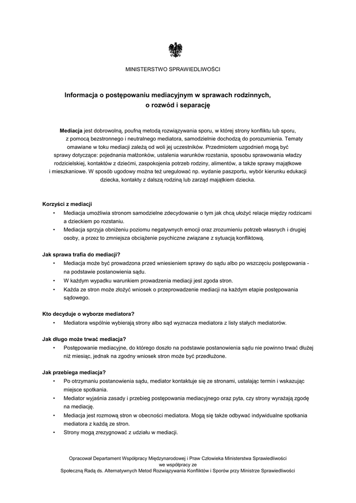 MINISTERSTWO SPRAWIEDLIWOŚCI Informacja o postępowaniu mediacyjnym w sprawach rodzinnych, o rozwód i separację Mediacja jest dobrowolną, poufną metodą rozwiązywania sporu, w której strony konfliktu lub sporu, z pomocą bezstronnego i neutralnego mediatora, samodzielnie dochodzą do porozumienia. Tematy omawiane w toku mediacji zależą od woli jej uczestników. Przedmiotem uzgodnień mogą być sprawy dotyczące: pojednania małżonków, ustalenia warunków rozstania, sposobu sprawowania władzy rodzicielskiej, kontaktów z dziećmi, zaspokojenia potrzeb rodziny, alimentów, a także sprawy majątkowe i mieszkaniowe. W sposób ugodowy można też uregulować np. wydanie paszportu, wybór kierunku edukacji dziecka, kontakty z dalszą rodziną lub zarząd majątkiem dziecka. Korzyści z mediacji • Mediacja umożliwia stronom samodzielne zdecydowanie o tym jak chcą ułożyć relacje między rodzicami a dzieckiem po rozstaniu. • Mediacja sprzyja obniżeniu poziomu negatywnych emocji oraz zrozumieniu potrzeb własnych i drugiej osoby, a przez to zmniejsza obciążenie psychiczne związane z sytuacją konfliktową. Jak sprawa trafia do mediacji? • Mediacja może być prowadzona przed wniesieniem sprawy do sądu albo po wszczęciu postępowania na podstawie postanowienia sądu. • W każdym wypadku warunkiem prowadzenia mediacji jest zgoda stron. • Każda ze stron może złożyć wniosek o przeprowadzenie mediacji na każdym etapie postępowania sądowego. Kto decyduje o wyborze mediatora? • Mediatora wspólnie wybierają strony albo sąd wyznacza mediatora z listy stałych mediatorów. Jak długo może trwać mediacja? • Postępowanie mediacyjne, do którego doszło na podstawie postanowienia sądu nie powinno trwać dłużej niż miesiąc, jednak na zgodny wniosek stron może być przedłużone. Jak przebiega mediacja? • Po otrzymaniu postanowienia sądu, mediator kontaktuje się ze stronami, ustalając termin i wskazując miejsce spotkania. • Mediator wyjaśnia zasady i przebieg postępowania mediacyjnego oraz pyta, czy strony wyrażają zgodę na mediację. • Mediacja jest rozmową stron w obecności mediatora. Mogą się także odbywać indywidualne spotkania mediatora z każdą ze stron. • Strony mogą zrezygnować z udziału w mediacji. Opracował Departament Współpracy Międzynarodowej i Praw Człowieka Ministerstwa Sprawiedliwości we współpracy ze Społeczną Radą ds. Alternatywnych Metod Rozwiązywania Konfliktów i Sporów przy Ministrze Sprawiedliwości • Mediacja jest poufna. Mediator nie może udostępniać informacji z mediacji osobom trzecim. Protokół z mediacji nie zawiera żadnych ocen ani stanowisk stron. • Mediator nie może być świadkiem co do faktów, o których dowiedział się w związku z prowadzeniem mediacji, chyba że strony zwolnią go z obowiązku zachowania tajemnicy mediacji. W jaki sposób może zakończyć się mediacja? • Mediacja może zakończyć się zawarciem wspólnie wypracowanej ugody, którą podpisują strony. • W sprawie rozwodowej i o separację mediacja może zakończyć się pojednaniem lub porozumieniem Małżonków, bądź wypracowaniem zgodnych stanowisk procesowych. Stanowią one podstawę dla rozstrzygnięcia sprawy przez sąd. • Mediator doręcza stronom odpis protokołu. • Mediator przekazuje sądowi protokół oraz ugodę, o ile została zawarta. • Zatwierdzona przez sąd ugoda ma moc prawną ugody zawartej przed sądem i kończy postępowanie. • Sąd nie zatwierdzi ugody jeśli jest sprzeczna z prawem lub zasadami współżycia społecznego albo zmierza do obejścia prawa, a także gdy jest niezrozumiała lub zawiera sprzeczności. • Jeśli ugoda której nadano klauzulę wykonalności nie została wykonana, można skierować jej wykonanie do egzekucji komorniczej. • W przypadku braku ugody, strony mogą dochodzić swoich praw w postępowaniu sądowym. Ile kosztuje mediacja? • Koszty mediacji ponoszą strony. Są one zazwyczaj ponoszone po połowie, chyba że strony ustalą inny sposób rozliczeń. • W postępowaniu mediacyjnym, do którego doszło na podstawie postanowienia sądu wysokość wynagrodzenia mediatora w sporach niemajątkowych wynosi 60 zł za pierwsze posiedzenie mediacyjne, a za każde następne posiedzenie- 25 zł. Jeśli postępowanie dotyczy praw majątkowych, wynagrodzenie mediatora wynosi 1% wartości przedmiotu sporu (nie mniej niż 30 zł i nie więcej niż 1.000 zł). Zwrotowi podlegają też wydatki mediatora poniesione w związku z przeprowadzeniem mediacji, w tym opłata za wynajem pomieszczenia do 50 zł za posiedzenie. Do kosztów mediacji dolicza się podatek VAT. • Niezależnie od wyniku sprawy, sąd może nałożyć na stronę obowiązek zwrotu kosztów wywołanych nieusprawiedliwioną odmową udziału w mediacji, na którą strona uprzednio wyraziła zgodę. • Jeśli dojdzie do zawarcia ugody, która jest wynikiem mediacji, strona otrzyma zwrot 75% opłaty sądowej, którą zapłaciła wnosząc sprawę do sądu. • W sprawie o rozwód lub separację, jeżeli dojdzie do pojednania się stron przed sądem I instancji i cofnięcia pozwu, strona otrzymuje zwrot 100% opłaty sądowej, którą zapłaciła wnosząc sprawę do sądu. Jeżeli pojednanie się stron nastąpiło przed zakończeniem postępowania przed sądem II instancji, strona otrzymuje zwrot 50% uiszczonej opłaty od apelacji. • W przypadku mediacji, do której doszło nie na podstawie postanowienia sądu, wysokość wynagrodzenia mediatora i zwrot jego wydatków wynikają z cennika ośrodka mediacyjnego lub strony uzgadniają je razem z mediatorem przed rozpoczęciem mediacji. Więcej informacji o mediacji na stronie www.ms.gov.pl w zakładce: „Działalność/Mediacje" Opracował Departament Współpracy Międzynarodowej i Praw Człowieka Ministerstwa Sprawiedliwości we współpracy ze Społeczną Radą ds. Alternatywnych Metod Rozwiązywania Konfliktów i Sporów przy Minis