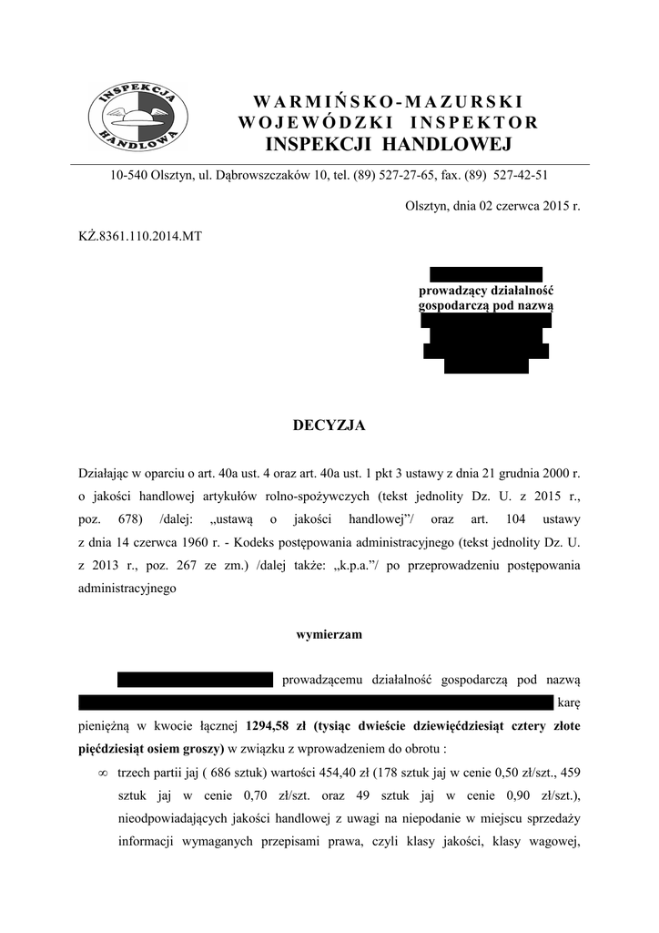 WARMIŃSKO-MAZURSKI WOJEWÓDZKI INSPEKTOR INSPEKCJI HANDLOWEJ 10-540 Olsztyn, ul. Dąbrowszczaków 10, tel. (89) 527-27-65, fax. (89) 527-42-51 Olsztyn, dnia 02 czerwca 2015 r. KŻ.8361.110.2014.MT Mariusz Rytelewski prowadzący działalność gospodarczą pod nazwą AUTO GAZ HANDEL Mariusz Rytelewski ul. Nad Jarem 2 lok. 5 10-172 Olsztyn DECYZJA Działając w oparciu o art. 40a ust. 4 oraz art. 40a ust. 1 pkt 3 ustawy z dnia 21 grudnia 2000 r. o jakości handlowej artykułów rolno-spożywczych (tekst jednolity Dz. U. z 2015 r., poz. 678) /dalej: „ustawą o jakości handlowej”/ oraz art. 104 ustawy z dnia 14 czerwca 1960 r. - Kodeks postępowania administracyjnego (tekst jednolity Dz. U. z 2013 r., poz. 267 ze zm.) /dalej także: „k.p.a.”/ po przeprowadzeniu postępowania administracyjnego wymierzam Mariuszowi Rytelewskiemu prowadzącemu działalność gospodarczą pod nazwą AUTO GAZ HANDEL Mariusz Rytelewski, ul. Nad Jarem 2 lok. 5, 10-172 Olsztyn karę pieniężną w kwocie łącznej 1294,58 zł (tysiąc dwieście dziewięćdziesiąt cztery złote pięćdziesiąt osiem groszy) w związku z wprowadzeniem do obrotu : • trzech partii jaj ( 686 sztuk) wartości 454,40 zł (178 sztuk jaj w cenie 0,50 zł/szt., 459 sztuk jaj w cenie 0,70 zł/szt. oraz 49 sztuk jaj w cenie 0,90 zł/szt.), nieodpowiadających jakości handlowej z uwagi na niepodanie w miejscu sprzedaży informacji wymaganych przepisami prawa, czyli klasy jakości, klasy wagowej, oznaczenia metody chowu, objaśnienia znaczenia kodu producenta, daty minimalnej trwałości, a także nazwy albo imienia i nazwiska producenta wbrew postanowieniom art. 16 lit. a, b, c, d i e rozporządzenia Komisji (WE) Nr 589/2008 z dnia 23 czerwca 2008 r. ustanawiającego szczegółowe zasady wykonywania rozporządzenia Rady (WE) nr 1234/2007 w sprawie norm handlowych w odniesieniu do jaj (Dz. U. L 163 z dnia 24.06.2008 r. ze zm.) oraz § 17 ust. 1 pkt 1 rozporządzenia Ministra Rolnictwa i Rozwoju Wsi z dnia 10 lipca 2007 r. w sprawie znakowania środków spożywczych (Dz. U. z 2014 r., poz. 774) oraz nieposiadających żadnych oznaczeń na skorupie wbrew postanowieniom części VI rozdział III ust. 1 załącznika VII do rozporządzenia Parlamentu Europejskiego i Rady (UE) nr 1308/2013 z dnia 17 grudnia 2013 r. ustanawiającego wspólną organizację rynków rolnych oraz uchylającego rozporządzenia Rady (EWG) nr 922/72, (EWG) nr 234/79, (WE) nr 1037/2001, (WE) nr 1234/2007 (Dz. U. L 347 Z 20.12.2013 r. ze zm.) i art. 9 ust. 1 rozporządzenia Komisji (WE) Nr 589/2008 z dnia 23 czerwca 2008 r. ustanawiającego szczegółowe zasady wykonywania rozporządzenia Rady (WE) nr 1234/2007 w sprawie norm handlowych w odniesieniu do jaj (Dz. U. L 163 z dnia 24.06.2008 r. ze zm.), • dwóch partii jaj i trzech sztuk jaj (łącznie 498 sztuk) wartości 344,30 zł (266 sztuk jaj w cenie 0,60 zł/szt., 229 sztuk jaj w cenie 0,80 zł/szt. oraz 3 sztuki jaj w cenie 0,50 zł/szt.) nieodpowiadających jakości handlowej z uwagi na niepodanie w miejscu sprzedaży informacji wymaganych przepisami prawa, czyli klasy jakości, klasy wagowej, oznaczenia metody chowu, objaśnienia znaczenia kodu producenta, daty minimalnej trwałości, a także nazwy albo imienia i nazwiska producenta wbrew postanowieniom art. 16 lit. a, b, c, d i e rozporządzenia Komisji (WE) Nr 589/2008 z dnia 23 czerwca 2008 r. ustanawiającego szczegółowe zasady wykonywania rozporządzenia Rady (WE) nr 1234/2007 w sprawie norm handlowych w odniesieniu do jaj (Dz. U. L 163 z dnia 24.06.2008 r. ze zm.) oraz § 17 ust. 1 pkt 1 rozporządzenia Ministra Rolnictwa i Rozwoju Wsi z dnia 10 lipca 2007 r. w sprawie znakowania środków spożywczych (Dz. U. z 2014 r., poz. 774). UZASADNIENIE W wyniku kontroli przeprowadzonej w dniach 05.11.- 12.11.2014 r. na podstawie art. 3 ust. 1-3 Rozporządzenia Parlamentu Europejskiego i Rady (WE) Nr 882/2004 z dnia 29 kwietnia 2004 r. w sprawie kontroli urzędowych przeprowadzanych w celu sprawdzenia zgodności z prawem paszowym i żywnościowym oraz regułami dotyczącymi zdrowia zwierząt i dobrostanu zwierząt (Dz. Urz. UE L. 165 z 30.04.2004, str. 1-141, Polskie wydanie specjalne Rozdział 3 Tom 45 P. 200-251 ze zm.), art. 17 ust. 3 ustawy z dnia 21 grudnia 2000 r. o jakości handlowej artykułów rolno-spożywczych (tekst jednolity Dz. U. z 2014 r., Nr 187, poz.669), art. 3 ust. 1 pkt 1, 2 i 6 ustawy z dnia 15 grudnia 2000 r. o Inspekcji Handlowej (tekst jednolity Dz. U. z 2014 r., poz.148 ze zm.), w punkcie sprzedaży jaj w Miejskiej Hali Targowej „Zatorzanka” w Olsztynie, ul. Kolejowa lok. 53 należącym do Mariusza Rytelewskiego prowadzącego działalność gospodarczą pod nazwą AUTO GAZ HANDEL Mariusz Rytelewski, ul. Nad Jarem 2 lok. 5, 10-172 Olsztyn, Warmińsko-Mazurski Wojewódzki Inspektor Inspekcji Handlowej stwierdził w ofercie handlowej: • trzy partie jaj ( 686 sztuk) wartości 454,40 zł (178 sztuk jaj w cenie 0,50 zł/szt., 459 sztuk jaj w cenie 0,70 zł/szt. oraz 49 sztuk jaj w cenie 0,90 zł/szt.), które zakwestionował z uwagi na niepodanie w miejscu sprzedaży informacji wymaganych przepisami prawa, czyli klasy jakości, klasy wagowej, oznaczenia metody chowu, objaśnienia znaczenia kodu producenta, daty minimalnej trwałości, a także nazwy albo imienia i nazwiska producenta oraz z uwagi na brak oznaczeń na skorupie jaj, • dwie partie jaj i trzy sztuki jaj (łącznie 498 sztuk) wartości 344,30 zł (266 sztuk jaj w cenie 0,60 zł/szt., 229 sztuk jaj w cenie 0,80 zł/szt. oraz 3 sztuki jaj w cenie 0,50 zł/szt.), które zakwestionował z uwagi na niepodanie w miejscu sprzedaży informacji wymaganych przepisami prawa, czyli klasy jakości, klasy wagowej, oznaczenia metody chowu, objaśnienia znaczenia kodu producenta, daty minimalnej trwałości, a także nazwy albo imienia i nazwiska producenta. Dwie partie jaj (266 sztuk jaj w cenie 0,60 zł/szt. i 229 sztuk jaj w cenie 0,80 zł/szt.) oraz 3 sztuki jaj w cenie 0,50 zł