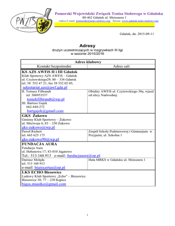 Pomorski Wojewódzki Związek Tenisa Stołowego w Gdańsku 80-462 Gdańsk ul. Meissnera 1 Adres E-mail: [email protected] Strona: www.gdansk.tenis-stolowy.org Gdańsk, dn. 2015-09-11 Adresy drużyn uczestniczących w rozgrywkach III ligi w sezonie 2015/2016 Adres klubowy Kontakt bezpośredni KS AZS AWFiS II i III Gdańsk Adres sali Klub Sportowy AZS AWFiS – Gdańsk ul. Czyżewskiego29; 80 – 336 Gdańsk tel. 58 552 47 21; fax 58 552 02 05; [email protected] Obiekty AWFiS ul. Czyżewskiego 30a, wjazd od ulicy Nadwodnej II. Tomasz Filbrandt tel. 506953537 [email protected] III. Bartosz Gajek 662-444-272 [email protected] GKS Żukowo Gminny Klub Sportowy – Żukowo ul. Mściwoja 6; 83 – 330 Żukowo [email protected] Paweł Richert tel. 665 625 175 Zespół Szkoły Podstawowej i Gimnazjum w Przyjaźni, ul. Szkolna 1 [email protected] FUNDACJA AURA Fundacja Aura ul. Hebanowa 17; 83-010 Jagatowo Tel.: 513.160.913 e-mail: [email protected] Dariusz Molęda tel. 513 160 913 Hala MRKS w Gdańsku ul. Meissnera 1 e-mail: [email protected] LKS ECHO Biesowice Ludowy Klub Sportowy „Echo” – Biesowice Biesowice 38; 77 – 230 Kępice [email protected] 1 Dariusz Adamczyk ul. Koszalińska 6A/15; 77 – 200 Miastko tel.535 585 657 Wiesław Pawlicki tel.: 517 279 546 Sala Domu Kultury, Biesowice 2 rez. Sala Sportowa, Barcino 39 (szkoła) [email protected] [email protected] MTS Kwidzyn Młodzieżowe Towarzystwo Sportowe w Kwidzynie ul. Mickiewicza 56B; 82 – 500 Kwidzyn tel./fax 55 279 64 41; [email protected] Mariusz Schaefer Zespół Szkół Ponadgimnazjalnych Nr1 Tel. 793 029 438 Kwidzyn - ul. Słowiańska 17 (wejście od ul. Piłsudskiego) [email protected] PERŁA s.c. Tczew Uczniowski Klub Sportowy „Hubertus” - Tczew ul. Jodłowa 3C/7; 83 – 110 Tczew (Zb. Banach) [email protected] Szkoła Podstawowa Nr 7 Tczew, ul. Stoczniowców 15a Adam Kozikowski tel. 792 192 013 [email protected] GKTS Gdańsk Gdański Klub Tenisa Stołowego – Gdańsk ul. Obrońców Wybrzeża 25B/56; 80 – 398 Gdańsk tel 58 718 43 29, 501 192 350 [email protected] Łukasz Łukaszewski ; tel. 609 265 150 Szkoła Podstawowa Nr 79 w Gdańsku; ul. Kołobrzeska49 Centrum Szkolenia PZTS im. Andrzeja Grubby w Gdańsku, ul. Meissnera 3 [email protected] ŻTS Nowy Dwór Gdański Żuławskie Towarzystwo Sportowe w Nowym Dworze Gdańskim ul. Warszawska 22; 82 – 100 Nowy Dwór Gdański Marcin Głowacki 1.Hala sportowa ZSP w Kmiecinie. tel. 600 011678 2.Sala gimnastyczna Zespół Szkół nr 2 w Nowym Dworze Gdańskim, [email protected] ul. Warszawska 54 EUROCAPITAL24 – ATS II Małe Trójmiasto Akademia Tenisa Stołowego Małe Trójmiasto Stowarzyszenie Sportowe ul. Mickiewicza 49, 84 – 230 Rumia tel.: 502 810 451, 501 085 222 [email protected] Andrzej Małkiewicz tel. 500 664 167 Sala Szkoły Salezjańskiej, Rumia ul. Kościelna 1 Rez.: MOSiR Rumia, SP Nr 6 Reda, SP Nr 2 Reda [email protected] [email protected] 2 POLTAREX POGOŃ Lębork Lęborski Klub Sportowy „Pogoń” ul. Czołgistów 5, 84 – 300 Lębork tel. 59 862 27 81; [email protected] Wojciech Potrykus Gimnazjum Nr 2 w Lęborku tel. 696 432 815 ul. Piotra Skargi 52 ATS III Małe Trójmiasto Akademia Tenisa Stołowego Małe Trójmiasto Stowarzyszenie Sportowe ul. Mickiewicza 49, 84 – 230 Rumia tel.: 502 810 451, 501 085 222 [email protected] Marek Wójcik tel. 693 431 925 [email protected] [email protected] Sala Szkoły Salezjańskiej, Rumia ul. Kościelna 1 Rez.: MOSiR Rumia, SP Nr 6 Reda, SP Nr 2 Reda UWAGA: Regulamin rozgrywek III ligi jest zawarty w „Regulaminie PWZTS na sezon 2015/2016”, który jest dostępny na stronie internetowej:www.gdansk.tenis-stolowy.org. Opracował: Mariusz Piński 3