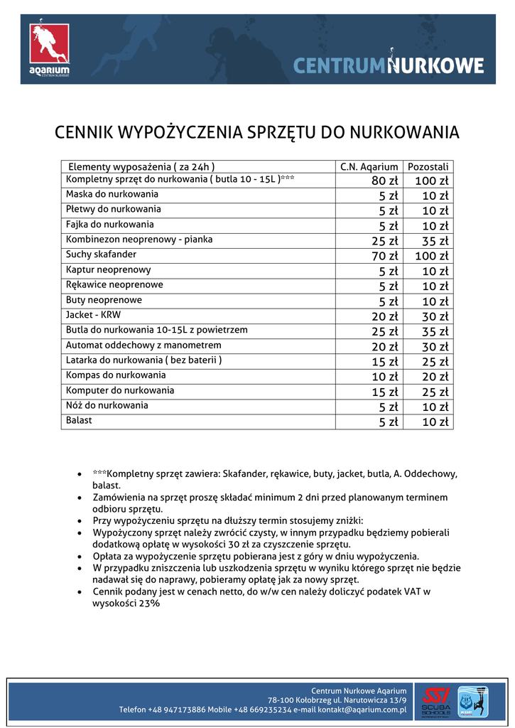 CENNIK WYPOŻYCZENIA SPRZĘTU DO NURKOWANIA Elementy wyposażenia ( za 24h ) Kompletny sprzęt do nurkowania ( butla 10 - 15L )*** Maska do nurkowania Płetwy do nurkowania Fajka do nurkowania Kombinezon neoprenowy - pianka Suchy skafander Kaptur neoprenowy Rękawice neoprenowe Buty neoprenowe Jacket - KRW Butla do nurkowania 10-15L z powietrzem Automat oddechowy z manometrem Latarka do nurkowania ( bez baterii ) Kompas do nurkowania Komputer do nurkowania Nóż do nurkowania Balast C.N. Aqarium Pozostali 80 zł 5 zł 5 zł 5 zł 25 zł 70 zł 5 zł 5 zł 5 zł 20 zł 25 zł 20 zł 15 zł 10 zł 15 zł 5 zł 5 zł 100 zł 10 zł 10 zł 10 zł 35 zł 100 zł 10 zł 10 zł 10 zł 30 zł 35 zł 30 zł 25 zł 20 zł 25 zł 10 zł 10 zł ***Kompletny sprzęt zawiera: Skafander, rękawice, buty, jacket, butla, A. Oddechowy, balast. Zamówienia na sprzęt proszę składać minimum 2 dni przed planowanym terminem odbioru sprzętu. Przy wypożyczeniu sprzętu na dłuższy termin stosujemy zniżki: Wypożyczony sprzęt należy zwrócić czysty, w innym przypadku będziemy pobierali dodatkową opłatę w wysokości 30 zł za czyszczenie sprzętu. Opłata za wypożyczenie sprzętu pobierana jest z góry w dniu wypożyczenia. W przypadku zniszczenia lub uszkodzenia sprzętu w wyniku którego sprzęt nie będzie nadawał się do naprawy, pobieramy opłatę jak za nowy sprzęt. Cennik podany jest w cenach netto, do w/w cen należy doliczyć podatek VAT w wysokości 23% Centrum Nurkowe Aqarium 78-100 Kołobrzeg ul. Narutowicza 13/9 Telefon +48 947173886 Mobile +48 669235234 e-mail [email protected]