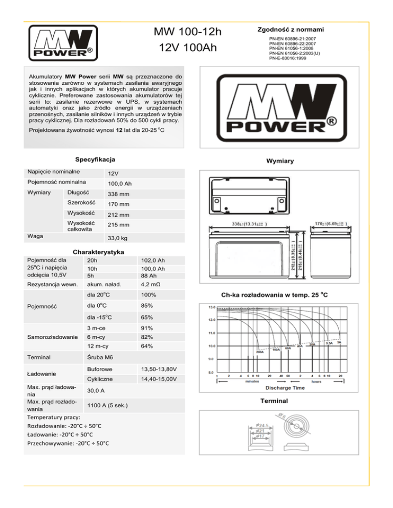 MW 100-12h 12V 100Ah Zgodność z normami PN-EN 60896-21:2007 PN-EN 60896-22:2007 PN-EN 61056-1:2008 PN-EN 61056-2:2003(U) PN-E-83016:1999 Akumulatory MW Power serii MW są przeznaczone do stosowania zarówno w systemach zasilania awaryjnego jak i innych aplikacjach w których akumulator pracuje cyklicznie. Preferowane zastosowania akumulatorów tej serii to: zasilanie rezerwowe w UPS, w systemach automatyki oraz jako źródło energii w urządzeniach przenośnych, zasilanie silników i innych urządzeń w trybie pracy cyklicznej. Dla rozładowań 50% do 500 cykli pracy. Projektowana żywotność wynosi 12 lat dla 20-25 oC Specyfikacja Napięcie nominalne 12V Pojemność nominalna 100,0 Ah Wymiary Długość 338 mm Szerokość 170 mm Wysokość 212 mm Wysokość całkowita 215 mm Wymiary 33,0 kg Waga Charakterystyka Pojemność dla 25oC i napięcia odcięcia 10,5V 20h 102,0 Ah 10h 5h 100,0 Ah 88 Ah Rezystancja wewn. akum. naład. o Pojemność Samorozładowanie Terminal Ładowanie Max. prąd ładowania Max. prąd rozładowania 4,2 mΩ dla 20 C 100% dla 0oC 85% dla -15oC 65% 3 m-ce 91% 6 m-cy 82% 12 m-cy 64% Ch-ka rozładowania w temp. 25 oC Śruba M6 Buforowe 13,50-13,80V Cykliczne 14,40-15,00V 30,0 A 1100 A (5 sek.) Temperatury pracy: Rozładowanie: -20°C ÷ 50°C Ładowanie: -20°C ÷ 50°C Przechowywanie: -20°C ÷ 50°C Terminal