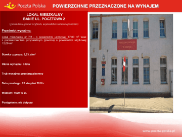 POWIERZCHNIE PRZEZNACZONE NA WYNAJEM LOKAL MIESZKALNY BANIE UL. POCZTOWA 2 (gmina Banie, powiat Gryfiński, województwo zachodniopomorskie) Przedmiot wynajmu: Lokal mieszkalny nr 7/2 - o powierzchni użytkowej 77,60 m2 wraz z pomieszczeniem przynależnym (piwnica) o powierzchni użytkowej 12,00 m2 Stawka czynszu: 6,53 zł/m² Okres wynajmu: 3 lata Tryb wynajmu: przetarg pisemny Data przetargu: 25 sierpień 2016 r. Wadium: 1520,19 zł. Postąpienie: nie dotyczy Kliknij i zlokalizuj na mapie Opis przedmiotu wynajmu: Lokal mieszkalny usytuowany jest na I piętrze budynku stanowiącego własność Poczty Polskiej S.A. w skład, którego wchodzi pokój 14,80 m², pokój 17,30 m², pokój 18,60 m², kuchnia 12,50 m², łazienka z wc 4,00 m², korytarz 4,20 m² i spiżarka 6,20 m² + pom. przynależne piwnica 12,00 m² Lokal wyposażony jest w instalacje: energetyczną, wodną, kanalizacyjną i centralne ogrzewanie (olejowe). Niezależnie od czynszu Najemca będzie ponosił opłaty za energie elektryczną, wywóz nieczystości oraz opłatę za centralne ogrzewanie w formie zaliczki. Opis nieruchomości: Miejscowość Banie Ulica, nr budynku Pocztowa 7/2 Powierzchnia budynku, w których zlokalizowany jest przedmiot wynajmu 733,00 m² Nr działki ewidencyjnej, obręb 292 obręb 1 Księga wieczysta, Sąd Rejonowy, Nr Wydziału SZ1Y/00030319/4 _Sąd Rejonowy w Gryfinie V Wydział Ksiąg Wieczystych Stan prawny gruntu Uregulowany Lokalizacja i dostępność komunikacyjna: Banie (dawniej niem. Bahn) – wieś w północno-zachodniej Polsce położona w województwie zachodniopomorskim, w powiecie gryfińskim, w gminie Banie, nad rzeką Tywą, pomiędzy jeziorami Dłużec (Długie Bańskie) i Jeziorem Mostowym. W IX-X wieku Banie stały się okręgiem grodowym, który bronił od zachodu dostępu do Ziemi Pyrzyckiej. W roku 1124 prawdopodobnie wprowadzono wiarę chrześcijańską w Baniach. Prawa miejskie osada otrzymała w 1230 roku. Obszar obecnie nazywany Ziemią Bańską, książę Barnim I nadał w 1234 r. Zakonowi Templariuszy. W pierwszej połowie XIII w. wzniesiono w Baniach kościół, a w pierwszej połowie XIV w. rozpoczęto budowę murów obronnych (linia murów posiadała wówczas dwie bramy i dwadzieścia baszt). Po kasacji Zakonu Templariuszy w 1312 r. tutejsze ziemie przejęli Joannici, którzy w 1345 r. odstąpili miasto księciu Barnimowi III. W 1417 r. powstał szpital oraz kaplica św. Jerzego. Po wojnie utraciło prawa miejskie. Mimo zniszczeń, Banie zachowały średniowieczny układ ulic z trójkątnym rynkiem. Banie usytuowane jest od Szczecina 56 km i od Gryfina 32 km. Nieruchomość położona jest w centrum miejscowości w otoczeniu budynków użyteczności publicznej (przedszkole miejskie, szkoła podstawowa) zabudowy mieszkaniowej wolnostojącej jedno i wielorodzinnej. W pobliżu usytuowane są sklepy wielobranżowe. Opis nieruchomości: Nieruchomość zabudowana jest budynkiem usługowo-mieszkalnym o ogólnej powierzchni użytkowej 324,00 m² OBWIESZCZENIE O PRZETARGU NA NAJEM CZĘŚCI NIERUCHOMOŚCI Wynajmujący: Poczta Polska S.A. , 00-940 Warszawa Prowadzący przetarg: PI NNN Szczecin Miejsce przetargu: Szczecin, Al. Niepodległości 41/42, 70-940 Szczecin – pokój 137, I piętro godz. 12:00 Poczta Polska S.A. Pion Infrastruktury Obszar Operacyjny ds. Nieruchomości w Szczecinie ogłasza przetarg pisemny na najem lokalu mieszkalnego. Oferty należy składać w zamkniętych kopertach w pokoju nr 137 (sekretariat) do dnia 25.08.2016 r. do godz. 12:00 z dopiskiem „oferta na wynajem lokalu mieszkalnego w Baniach, ul. Pocztowa 7/2”. Przedmiot najmu: Charakterystyka nieruchomości: Lokal usytuowany jest na I piętrze budynku Poczty Polskiej S.A. w miejscowości Banie, przy ul. Pocztowej 7/2, o powierzchni użytkowej 77,60 m² + pom. przynależne (piwnica) 12,00 m². Lokal mieszkalny składa się z trzech pokoi, kuchni, łazienki z wc, korytarza i spiżarki. Wyposażony jest w centralne ogrzewanie (olejowe), instalacje wodno-kanalizacyjną i instalację elektryczną. Okres najmu: 3 lata Wywoławcza stawka czynszu netto: 6,53 m² (słownie: sześć złotych 53/100) Postąpienia: brak Wadium: 1520,19 zł. (słownie: jeden tysiąc pięćset dwadzieścia złotych 19/100) Termin przetargu: 25 sierpnia 2016 r. Warunkiem przystąpienia do przetargu jest: 1.Wniesienie wadium przelewem na rachunek bankowy w Banku Pocztowym S.A. w Bydgoszczy nr konta: 85-1320-0019-0099-0718-2000-0025 w terminie do dnia: 24 sierpnia 2016 r., przy czym jako termin wpłaty rozumiany jest termin uznania wpłaty na rachunku Poczty Polskiej S.A. z dopiskiem na przelewie w rubryce tytułem: Wadium - przetarg na wynajem lokalu mieszkalnego położonego w Baniach”. 2.Okazanie komisji przetargowej oryginału lub kopii wpłaty wadium. 3.Złożenie przez Oferenta oświadczenia o zapoznaniu się z Regulaminem przetargu, projektem umowy najmu i przyjęciu zawartych w w/w dokumentach warunków bez zastrzeżeń, jak również oświadczenie, że zapoznał się ze stanem technicznym przedmiotu najmu. 4.Przed rozpoczęciem licytacji osoba fizyczna zobowiązana jest do okazania dowodu osobistego. W przypadku przystąpienia do przetargu przez jednego z małżonków, konieczne jest przedłożenie pisemnego wyrażenia zgody współmałżonka na przystąpienie do przetargu z zamiarem najmu części nieruchomości, będącej przedmiotem przetargu, ze środków pochodzących z majątku wspólnego, za cenę ustaloną w przetargu. 5.W przypadku osób prawnych i jednostek organizacyjnych nie posiadających osobowości prawnej, osoba reprezentująca biorąca udział w licytacji zobowiązana jest do okazania dowodu osobistego oraz odpowiednich dokumentów potwierdzających uprawnienie do reprezentowania tych osób lub jednostek w postępowaniu przetargowym. Informacje dodatkowe: Wadium wpłacone przez wyłonionego w przetargu najemcę, ulega zaliczeniu na poczet kaucji, która będzie 3 krotnością miesięcznego czynszu. Wp