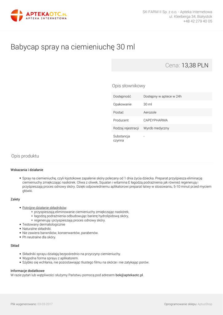 SK-FARM II Sp. z o.o. - Apteka Internetowa ul. Kleeberga 34, Białystok +48 42 279 40 05 Babycap spray na ciemieniuchę 30 ml Cena: 13,38 PLN Opis słownikowy Dostępność Dostępny w aptece w 24h Opakowanie 30 ml Postać Aerozole Producent CAPEYPHARMA Rodzaj rejestracji Wyrób medyczny Substancja czynna - Opis produktu Wskazania i działanie Spray na ciemieniuchę, czyli łojotokowe zapalenie skóry polecany od 1 dnia życia dziecka. Preparat przyśpiesza eliminację ciemieniuchy zmiękczając naskórek. Oliwa z oliwek, Squalan i witamina E łagodzą podrażnienia jak również regenerują i przyśpieszają proces odnowy skóry. Dzięki odpowiedniemu aplikatorowi preparat łatwy w stosowaniu, 5-10 minut przed myciem główki. Zalety Potrójne działanie składników: przyspieszają eliminowanie ciemieniuchy zmiękczając naskórek, łagodzą podrażnienia odbudowując barierę hydrolipidową skóry, regenerują i przyspieszają proces odnowy skóry. Testowany dermatologicznie Naturalne składniki. Nie zawiera barwników, konserwantów, parabenów. Ph neutralne dla skóry. Skład Składniki sprayu działają bezpośrednio na przyczyny ciemieniuchy. Wygodna forma sprayu z aplikatorem. Szybko się wchłania, nie pozostawiając tłustego filmu na skórze i nie zatykając porów. Informacje dodatkowe W razie pytań lub wątpliwości służymy Państwu pomocą pod adresem [email protected]. Plik wygenerowano: 03-03-2017 Powered by TCPDF (www.tcpdf.org) Oprogramowanie sklepu: AptusShop