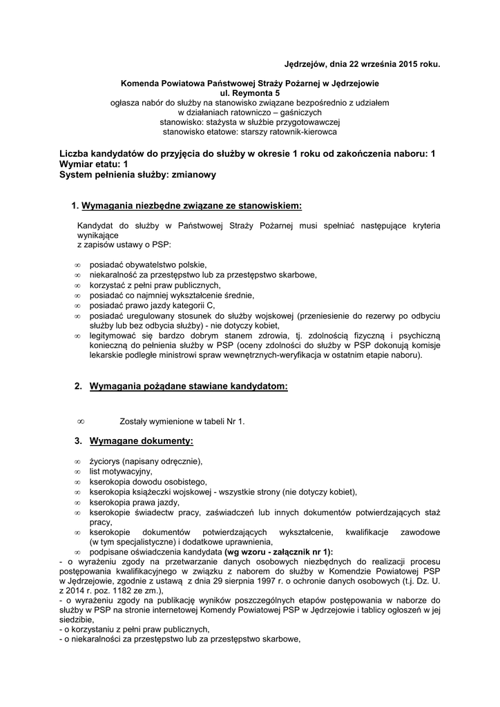 Jędrzejów, dnia 22 września 2015 roku. Komenda Powiatowa Państwowej Straży Pożarnej w Jędrzejowie ul. Reymonta 5 ogłasza nabór do służby na stanowisko związane bezpośrednio z udziałem w działaniach ratowniczo – gaśniczych stanowisko: stażysta w służbie przygotowawczej stanowisko etatowe: starszy ratownik-kierowca Liczba kandydatów do przyjęcia do służby w okresie 1 roku od zakończenia naboru: 1 Wymiar etatu: 1 System pełnienia służby: zmianowy 1. Wymagania niezbędne związane ze stanowiskiem: Kandydat do służby w Państwowej Straży Pożarnej musi spełniać następujące kryteria wynikające z zapisów ustawy o PSP: • • • • • • • posiadać obywatelstwo polskie, niekaralność za przestępstwo lub za przestępstwo skarbowe, korzystać z pełni praw publicznych, posiadać co najmniej wykształcenie średnie, posiadać prawo jazdy kategorii C, posiadać uregulowany stosunek do służby wojskowej (przeniesienie do rezerwy po odbyciu służby lub bez odbycia służby) - nie dotyczy kobiet, legitymować się bardzo dobrym stanem zdrowia, tj. zdolnością fizyczną i psychiczną konieczną do pełnienia służby w PSP (oceny zdolności do służby w PSP dokonują komisje lekarskie podległe ministrowi spraw wewnętrznych-weryfikacja w ostatnim etapie naboru). 2. Wymagania pożądane stawiane kandydatom: • Zostały wymienione w tabeli Nr 1. 3. Wymagane dokumenty: • • • • • • życiorys (napisany odręcznie), list motywacyjny, kserokopia dowodu osobistego, kserokopia książeczki wojskowej - wszystkie strony (nie dotyczy kobiet), kserokopia prawa jazdy, kserokopie świadectw pracy, zaświadczeń lub innych dokumentów potwierdzających staż pracy, • kserokopie dokumentów potwierdzających wykształcenie, kwalifikacje zawodowe (w tym specjalistyczne) i dodatkowe uprawnienia, • podpisane oświadczenia kandydata (wg wzoru - załącznik nr 1): - o wyrażeniu zgody na przetwarzanie danych osobowych niezbędnych do realizacji procesu postępowania kwalifikacyjnego w związku z naborem do służby w Komendzie Powiatowej PSP w Jędrzejowie, zgodnie z ustawą z dnia 29 sierpnia 1997 r. o ochronie danych osobowych (t.j. Dz. U. z 2014 r. poz. 1182 ze zm.), - o wyrażeniu zgody na publikację wyników poszczególnych etapów postępowania w naborze do służby w PSP na stronie internetowej Komendy Powiatowej PSP w Jędrzejowie i tablicy ogłoszeń w jej siedzibie, - o korzystaniu z pełni praw publicznych, - o niekaralności za przestępstwo lub za przestępstwo skarbowe, - o świadomości odpowiedzialności karnej, wynikającej z art. 233 § 1 Kodeksu Karnego przewidującego karę pozbawienia wolności do lat 3 za składanie fałszywych zeznań, - o niewnoszeniu roszczeń w stosunku do tut. komendy o wypłatę odszkodowania z tytułu ewentualnego wypadku, kontuzji lub uszczerbku na zdrowiu zaistniałego z winy kandydata podczas naboru do służby w Komendzie Powiatowej PSP w Jędrzejowie, • aktualne zaświadczenie lekarskie od lekarza rejonowego (rodzinnego, medycyny pracy, medycyny sportowej lub internisty) dopuszczające do: próby wydolnościowej zmodyfikowaną metodą harwardzką („Harvard Step-Up Test”), biegu na 50 m, biegu na 1 000 m, podciągania się na drążku, próby wysokościowej i sprawdzianu z pływania, wystawione nie wcześniej niż 30 dni przed dniem przystąpienia do próby wydolnościowej (wg wzoru - załącznik nr 2 lub o odpowiadającej mu treści). Zaświadczenie lekarskie kandydat dostarcza najpóźniej w dniu przeprowadzenia próby wydolnościowej zmodyfikowaną metodą harwardzką („Harvard StepUp Test”). Koszty badań lekarskich w celu wydania zaświadczenia ponosi kandydat. 4. Termin i miejsce składania dokumentów: • Termin • Miejsce składania dokumentów: sekretariat Komendy Powiatowej Państwowej Straży Pożarnej w Jędrzejowie lub drogą pocztową (decyduje data i godzina wpływu do sekretariatu) na adres: składania dokumentów: od dnia 22 września 2015 roku do dnia 1 października 2015 roku do godz. 1530. Komenda Powiatowa Państwowej Straży Pożarnej w Jędrzejowie, ul. Reymonta 5, 28 - 300 Jędrzejów. • • Dokumenty należy dostarczyć w zaklejonej kopercie opatrzonej imieniem i nazwiskiem kandydata oraz dopiskiem „Nabór do służby w KP PSP w Jędrzejowie”. Oferty niekompletne (brak jakiegokolwiek wymaganego dokumentu) lub złożone po terminie wskazanym w ogłoszeniu nie będą brane pod uwagę w postępowaniu kwalifikacyjnym. Postępowanie kwalifikacyjne Postępowanie kwalifikacyjne składać się będzie z czterech etapów, które przeprowadzi komisja kwalifikacyjna powołana przez Komendanta Powiatowego PSP w Jędrzejowie przy udziale funkcjonariuszy Komendy Wojewódzkiej PSP w Kielcach, delegowanych przez Świętokrzyskiego Komendanta Wojewódzkiego PSP w Kielcach. I etap postępowania kwalifikacyjnego – weryfikacja złożonych dokumentów Ten etap obejmuje weryfikację zgodności ofert ze stawianymi wymaganiami oraz dokonanie oceny złożonych dokumentów za pomocą punktów gratyfikacyjnych. Tabela Nr 1 Lp. Posiadane kwalifikacje i uprawnienia 1. wyszkolenie pożarnicze w PSP, tj. kurs podstawowy 2. wyszkolenie pożarnicze w PSP, tj. kurs uzupełniający (podoficerski) 3. wyszkolenie pożarnicze w PSP, tj. technik pożarnictwa 4. wyszkolenie pożarnicze w PSP, tj. inżynier pożarnictwa wyszkolenie pożarnicze w OSP, tj. szkolenie podstawowe strażaków ratowników OSP + kurs w zakresie kwalifikowanej pierwszej pomocy 5. Liczba punktów 15 20 25 30 10 10. wyszkolenie pożarnicze w OSP, tj. szkolenie podstawowe strażaków ratowników OSP + kurs w zakresie kwalifikowanej pierwszej pomocy + szkolenie z zakresu ratownictwa technicznego dla strażaków ratowników OSP wyszkolenie pożarnicze w OSP, tj. szkolenie podstawowe strażaków ratowników OSP + kurs w zakresie kwalifikowanej pierwszej pomocy + szkolenie z zakresu ratownictwa technicznego dla strażaków ratowników