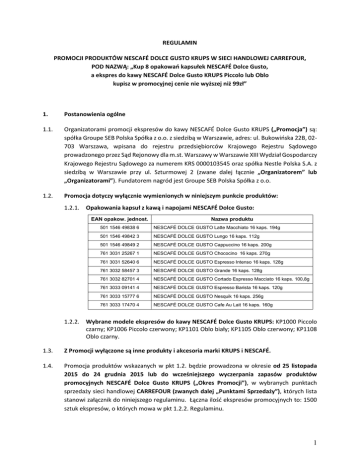 REGULAMIN PROMOCJI PRODUKTÓW NESCAFÉ DOLCE GUSTO KRUPS W SIECI HANDLOWEJ CARREFOUR, POD NAZWĄ: „Kup 8 opakowań kapsułek NESCAFÉ Dolce Gusto, a ekspres do kawy NESCAFÉ Dolce Gusto KRUPS Piccolo lub Oblo kupisz w promocyjnej cenie nie wyższej niż 99zł” 1. Postanowienia ogólne 1.1. Organizatorami promocji ekspresów do kawy NESCAFÉ Dolce Gusto KRUPS („Promocja”) są: spółka Groupe SEB Polska Spółka z o.o. z siedzibą w Warszawie, adres: ul. Bukowińska 22B, 02703 Warszawa, wpisana do rejestru przedsiębiorców Krajowego Rejestru Sądowego prowadzonego przez Sąd Rejonowy dla m.st. Warszawy w Warszawie XIII Wydział Gospodarczy Krajowego Rejestru Sądowego za numerem KRS 0000103545 oraz spółka Nestle Polska S.A. z siedzibą w Warszawie przy ul. Szturmowej 2 (zwane dalej łącznie „Organizatorem” lub „Organizatorami”). Fundatorem nagród jest Groupe SEB Polska Spółka z o.o. 1.2. Promocja dotyczy wyłącznie wymienionych w niniejszym punkcie produktów: 1.2.1. Opakowania kapsuł z kawą i napojami NESCAFÉ Dolce Gusto: EAN opakow. jednost. Nazwa produktu 501 1546 49838 6 NESCAFÉ DOLCE GUSTO Latte Macchiato 16 kaps. 194g 501 1546 49842 3 NESCAFÉ DOLCE GUSTO Lungo 16 kaps. 112g 501 1546 49849 2 NESCAFÉ DOLCE GUSTO Cappuccino 16 kaps. 200g 761 3031 25267 1 NESCAFÉ DOLCE GUSTO Chococino 16 kaps. 270g 761 3031 52640 6 NESCAFÉ DOLCE GUSTO Espresso Intenso 16 kaps. 128g 761 3032 58457 3 NESCAFÉ DOLCE GUSTO Grande 16 kaps. 128g 761 3032 82701 4 NESCAFÉ DOLCE GUSTO Cortado Espresso Macciato 16 kaps. 100,8g 761 3033 09141 4 NESCAFÉ DOLCE GUSTO Espresso Barista 16 kaps. 120g 761 3033 15777 6 NESCAFÉ DOLCE GUSTO Nesquik 16 kaps. 256g 761 3033 17470 4 NESCAFÉ DOLCE GUSTO Cafe Au Lait 16 kaps. 160g 1.2.2. Wybrane modele ekspresów do kawy NESCAFÉ Dolce Gusto KRUPS: KP1000 Piccolo czarny; KP1006 Piccolo czerwony; KP1101 Oblo biały; KP1105 Oblo czerwony; KP1108 Oblo czarny. 1.3. Z Promocji wyłączone są inne produkty i akcesoria marki KRUPS i NESCAFÉ. 1.4. Promocja produktów wskazanych w pkt 1.2. będzie prowadzona w okresie od 25 listopada 2015 do 24 grudnia 2015 lub do wcześniejszego wyczerpania zapasów produktów promocyjnych NESCAFÉ Dolce Gusto KRUPS („Okres Promocji”), w wybranych punktach sprzedaży sieci handlowej CARREFOUR (zwanych dalej „Punktami Sprzedaży”), których lista stanowi załącznik do niniejszego regulaminu. Łączna ilość ekspresów promocyjnych to: 1500 sztuk ekspresów, o których mowa w pkt 1.2.2. Regulaminu. 1 1.5. Informacja o wyczerpaniu zapasów produktów objętych Promocją będzie dostępna w Punktach Sprzedaży. 1.6. Miejscem Promocji jest terytorium Rzeczypospolitej Polskiej. 2. Zasady udziału w Promocji 2.1. Uczestnikami Promocji mogą być wyłącznie pełnoletnie osoby fizyczne, zamieszkałe na terytorium Rzeczypospolitej Polskiej, posiadające pełną zdolność do czynności prawnych oraz dokonujące zakupu produktu objętego Promocją jako osoba fizyczna, a nie jako przedsiębiorca w rozumieniu art. 4 Ustawy o swobodzie działalności gospodarczej („Uczestnik”). 2.2. Uczestnictwo w Promocji jest dobrowolne. 2.3. Każdy Uczestnik może wziąć udział w Promocji wielokrotnie, spełniając wszystkie warunki konieczne uczestnictwa w Promocji. 2.4. Warunkiem koniecznym udziału w Promocji jest dokonanie przez Uczestnika w okresie trwania Promocji, w jednym z Punktów Sprzedaży objętych promocją, jednorazowego zakupu 8 sztuk dowolnych opakowań kapsuł z kawą i napojami NESCAFÉ Dolce Gusto, wymienionych w pkt 1.2.1. niniejszego Regulaminu. 2.5. Po spełnieniu warunku wymienionego w punkcie 2.4. niniejszego Regulaminu, Uczestnikowi Promocji przysługuje prawo do zakupu ekspresu NESCAFÉ Dolce Gusto KRUPS, biorącego udział w Promocji (tj.: KP1000 Piccolo czarny; KP1006 Piccolo czerwony; KP1101 Oblo biały; KP1105 Oblo czerwony; KP1108 Oblo czarny) w promocyjnej cenie nie wyższej niż 99zł brutto. Aby Uczestnik uzyskał prawo do zakupu ekspresu w promocyjnej cenie, 8 opakowań kapsułek NESCAFÉ Dolce Gusto i ekspres NESCAFÉ Dolce Gusto KRUPS, biorące udział w Promocji muszą być zakupione w ramach jednorazowego zakupu. 3. Postępowanie reklamacyjne 3.1. Reklamacje dotyczące przebiegu Promocji mogą być zgłaszane na adres Serwisu Konsumenta Nestlé, ul. Łódzka 153, 62-800 Kalisz, telefonicznie na numer 800 174 902 lub mailowo na adres [email protected] 3.2. Prawo złożenia reklamacji przysługuje jedynie Uczestnikowi Promocji przez cały Okres Promocji oraz przez 21 dni kalendarzowych po zakończeniu Okresu Promocji. 3.3. Reklamacja powinna zawierać imię, nazwisko, numer telefonu lub adres e-mail Uczestnika Promocji jak również opis i wskazanie przyczyny reklamacji. 2 3.4. Reklamacje rozpatrywane będą przez Komisję powołaną przez Organizatorów Promocji w terminie 14 dni kalendarzowych od dnia otrzymania reklamacji. Uczestnik zostanie powiadomiony o decyzji Komisji w sprawie jego reklamacji telefonicznie lub mailowo. 3.5. Po wyczerpaniu postępowania reklamacyjnego Uczestnikowi przysługuje prawo do dochodzenia nieuwzględnionych roszczeń na drodze postępowania sądowego. 4. Przetwarzanie danych osobowych 4.1. Uczestnik Promocji, w celu złożenia reklamacji dotyczącej przebiegu Promocji, o czym mowa w pkt 3 Regulaminu, udostępnia Organizatorom swoje dane osobowe, tj.: imię, nazwisko, numer telefonu lub adres e-mail, w celu realizacji obowiązków wynikających z przeprowadzenia postępowania reklamacyjnego. Dane osobowe będą wykorzystane przez Organizatorów wyłącznie w celu przeprowadzenia postępowania reklamacyjnego, o którym mowa w pkt 3 Regulaminu. Udostępnienie danych osobowych na potrzeby związane z postępowaniem reklamacyjnym, jest dobrowolne, jednakże jest niezbędne w celu przeprowadzenia postępowania reklamacyjnego. 4.2. Przetwarzanie danych osobowych Uczestników Promocji będzie dokonywane zgodnie z ustawą z dnia 29 sierpnia 1997 roku o ochronie danyc