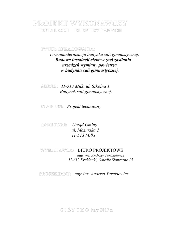 Termomodernizacja budynku sali gimnastycznej. Budowa instalacji elektrycznej zasilania urządzeń wymiany powietrza w budynku sali gimnastycznej. 11-513 Miłki ul. Szkolna 1. Budynek sali gimnastycznej. Projekt techniczny Urząd Gminy ul. Mazurska 2 11-513 Miłki BIURO PROJEKTOWE mgr inż. Andrzej Turakiewicz 11-612 Kruklanki, Osiedle Słoneczne 15 mgr inż. Andrzej Turakiewicz ZAWARTOŚĆ OPRACOWANIA 1. Opis techniczny 2. Rysunki : Instalacje elektryczne - schemat zasilania Instalacje elektryczne - obwody zasilania - rys. nr 1 - rys. nr 2 OPIS TECHNICZNY do projektu technicznego budowy, instalacji elektrycznych wnętrzowych do zasilania urządzeń wymiany powietrza budynku sali gimnastycznej w miejscowości Miłki ul. Szkolna 1. I. Podstawa opracowania 1. zlecenie Inwestora; 2. podkład budowlany; 3. obowiązujące przepisy i normy. II. Parametry techniczne 1. napięcie znamionowe 2. moc dodatkowo zainstalowana 4. współczynnik mocy 5. układ sieciowy 6. ochrona dodatkowa III. Un = 230/400 V Pi = 184 W cosφ = 0,93 TN-C; TN-S samoczynne wyłączanie zasilania Zakres opracowania Projekt obejmuje wykonanie następujących elementów: − − − − dobudowa aparatów w istniejącej tablicy T; wlz i tablica TW; instalacja odbiorcza aparatów wymiany powietrza; instalacja ochrony od porażeń i połączeń wyrównawczych; IV. Tablica T W istniejącej tablicy T sali gimnastycznej należy dobudować : − szynę PEN – blok rozdzielczy jednobiegunowy 1x35; 1x16; 6x6; − wykonać uziemienie tablicy zgodnie z rys. 1 i 2; − w istniejących gniazdach bezpiecznikowych (obwód wentylator dachowy) zainstalować wkładki topikowe Bi 10A; − z ww. gniazd bezpiecznikowych wyprowadzić zasilanie projektowanej tablicy TW. Wyposażenie wg rys. nr 1. V. Wlz i tablica TW Z istniejącej tablicy T projektuje się wykonanie zasilanie tablicy TW przewodem YDYżo5x2,5 mm2 w rurce osłonowej RL 18 p/t. Tablicę TW zainstalować na wysokość 1,6m od podłogi przy istniejącej tablicy T. Tablicę TW wykonać na bazie typowych prefabrykowanych rozdzielnic IP 54, 2x12 wyposażając ją w: − rozłącznik instalacyjny 40 A; − wyłącznik ochronny różnicowoprądowy trójfazowy 25A; I∆N= 30 mA; − wyłączniki instalacyjne nadmiarowe jednofazowe B 6 A; − wyłącznik silnikowy prąd nastawy Inast= 0,61-1,0 A; − przełączniki instalacyjne dwupołożeniowe 25 A. Wyposażenie tablicy wg rys. nr 1. VI. Obwody odbiorcze Instalacje do urządzeń wentylacji należy wykonać przewodami YDYżo 5x1,5/750V do wentylatora i YDYżo 4x1,5/750V do siłowników - w rurce osłonowej RL 18 n/u. Przewidziano zastosowanie osprzętu bryzgoszczelnego. VII. Instalacja odgromowa W związku z występującą wymianą istniejących urządzeń wentylacyjnych na dachu sali gimnastycznej należy istniejące połączenia instalacji odgromowej z wentylatorami odłączyć, a po zainstalowaniu nowych wentylatorów ponownie je podłączyć za pomocą uchwytów do połączenia przewodów z blachą. VIII. Instalacja ochrony od porażeń Zgodnie z postanowieniami Polskiej Normy PN-IEC 60364 „Instalacje elektryczne w obiektach budowlanych” jako środek ochrony przeciwporażeniowej projektuje się szybkie wyłączenie zasilania w układzie sieciowym TN-S. Przy budynku należy wykonać uziom typu galmar 14 mm o rezystancji nie większej niż 30 Ω i wykonać połączenie uziomu z zaciskiem PEN w tablicy T przewodem LgY 35 w RL 18 n.u. Rys. 2. Ochrona przez zastosowanie szybkiego wyłączenia jest realizowana za pomocą wyłączników instalacyjnych nadmiarowo-prądowych, zastosowanych w poszczególnych obwodach instalacyjnych oraz wyłącznika różnicowoprądowego typu o prądzie zadziałania I∆N= 30 mA, zainstalowanych w tablicy TW. IX. Uwagi końcowe 1. Po wykonaniu instalacji wykonać pomiary rezystancji izolacji obwodów, skuteczności ochrony przeciwporażeniowej i rezystancji uziemienia. 2. Całość robót wykonać zgodnie z obowiązującymi przepisami i normami oraz opracowaniem "Instalacje elektryczne - warunki techniczne z komentarzami, wymagania odbioru i eksploatacji, przepisy prawne i normy" wyd. COBO-PROFIL Warszawa, 1997r. OPRACOWAŁ: Andrzej Turakiewicz