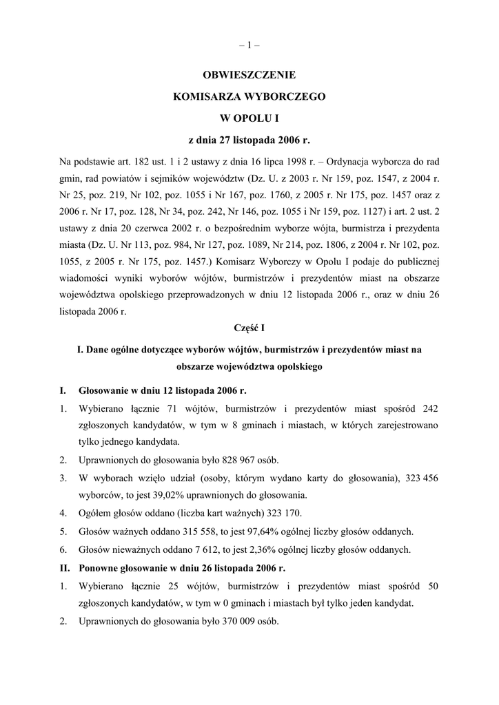 –1– OBWIESZCZENIE KOMISARZA WYBORCZEGO W OPOLU I z dnia 27 listopada 2006 r. Na podstawie art. 182 ust. 1 i 2 ustawy z dnia 16 lipca 1998 r. – Ordynacja wyborcza do rad gmin, rad powiatów i sejmików województw (Dz. U. z 2003 r. Nr 159, poz. 1547, z 2004 r. Nr 25, poz. 219, Nr 102, poz. 1055 i Nr 167, poz. 1760, z 2005 r. Nr 175, poz. 1457 oraz z 2006 r. Nr 17, poz. 128, Nr 34, poz. 242, Nr 146, poz. 1055 i Nr 159, poz. 1127) i art. 2 ust. 2 ustawy z dnia 20 czerwca 2002 r. o bezpośrednim wyborze wójta, burmistrza i prezydenta miasta (Dz. U. Nr 113, poz. 984, Nr 127, poz. 1089, Nr 214, poz. 1806, z 2004 r. Nr 102, poz. 1055, z 2005 r. Nr 175, poz. 1457.) Komisarz Wyborczy w Opolu I podaje do publicznej wiadomości wyniki wyborów wójtów, burmistrzów i prezydentów miast na obszarze województwa opolskiego przeprowadzonych w dniu 12 listopada 2006 r., oraz w dniu 26 listopada 2006 r. Część I I. Dane ogólne dotyczące wyborów wójtów, burmistrzów i prezydentów miast na obszarze województwa opolskiego I. Głosowanie w dniu 12 listopada 2006 r. 1. Wybierano łącznie 71 wójtów, burmistrzów i prezydentów miast spośród 242 zgłoszonych kandydatów, w tym w 8 gminach i miastach, w których zarejestrowano tylko jednego kandydata. 2. Uprawnionych do głosowania było 828 967 osób. 3. W wyborach wzięło udział (osoby, którym wydano karty do głosowania), 323 456 wyborców, to jest 39,02% uprawnionych do głosowania. 4. Ogółem głosów oddano (liczba kart waŜnych) 323 170. 5. Głosów waŜnych oddano 315 558, to jest 97,64% ogólnej liczby głosów oddanych. 6. Głosów niewaŜnych oddano 7 612, to jest 2,36% ogólnej liczby głosów oddanych. II. Ponowne głosowanie w dniu 26 listopada 2006 r. 1. Wybierano łącznie 25 wójtów, burmistrzów i prezydentów miast spośród 50 zgłoszonych kandydatów, w tym w 0 gminach i miastach był tylko jeden kandydat. 2. Uprawnionych do głosowania było 370 009 osób. –2– 3. W wyborach wzięło udział (osoby, którym wydano karty do głosowania), 121 113 wyborców, to jest 32,73% uprawnionych do głosowania. 4. Ogółem głosów oddano (liczba kart waŜnych) 121 091. 5. Głosów waŜnych oddano 119 529, to jest 98,71% ogólnej liczby głosów oddanych. 6. Głosów niewaŜnych oddano 1 562, to jest 1,29% ogólnej liczby głosów oddanych. III. Wyniki wyborów wójtów, burmistrzów i prezydentów miast 1. Wybierano łącznie 71 wójtów, burmistrzów i prezydentów miast, z czego: a) w głosowaniu w dniu 12 listopada 2006 r. 71 wójtów, burmistrzów i prezydentów miast, b) w ponownym głosowaniu w dniu 26 listopada 2006 r. 25 wójtów, burmistrzów i prezydentów miast. 2. Wybrano łącznie 71 wójtów, burmistrzów i prezydentów miast, w tym: 1) 58 wójtów i burmistrzów w gminach liczących do 20 tys. mieszkańców, z czego: a) w głosowaniu w dniu 12 listopada 2006 r. 42 wójtów i burmistrzów, b) w ponownym głosowaniu w dniu 26 listopada 2006 r. 16 wójtów i burmistrzów, 2) 12 burmistrzów, prezydentów miast w gminach liczących powyŜej 20 tys. mieszkańców, z czego: a) w głosowaniu w dniu 12 listopada 2006 r. 3 burmistrzów, b) w ponownym głosowaniu w dniu 26 listopada 2006 r. 9 burmistrzów, prezydentów miast, 3) 3. 1 burmistrzów i prezydentów miast w miastach na prawach powiatu, z czego: a) w głosowaniu w dniu 12 listopada 2006 r. 1 prezydentów miast, b) w ponownym głosowaniu w dniu 26 listopada 2006 r. 0. W głosowaniu w dniu 12 listopada 2006 r. nie wybrano wójtów, burmistrzów i prezydentów miast w 25 gminach i miastach, w tym z następujących powodów: 1) nie przeprowadzono wyborów w 0 gminach i miastach, w których nie zarejestrowano Ŝadnego kandydata na wójta, burmistrza lub prezydenta miasta, w tym: a) 0 w gminach liczących do 20 tys. mieszkańców, b) 0 w gminach liczących powyŜej 20 tys. mieszkańców, c) 0 w miastach na prawach powiatu. –3– 2) w 0 gminach i miastach zarejestrowano tylko jednego kandydata na wójta, burmistrza lub prezydenta miasta, który w wyniku głosowania nie uzyskał więcej niŜ połowy waŜnie oddanych głosów za wyborem, w tym: 4. a) 0 w gminach liczących do 20 tys. mieszkańców, b) 0 w gminach liczących powyŜej 20 tys. mieszkańców, c) 0 w miastach na prawach powiatu. W 25 gminach i miastach, w tym: a) 16 w gminach liczących do 20 tys. mieszkańców, b) 9 w gminach liczących powyŜej 20 tys. mieszkańców, c) 0 w miastach na prawach powiatu, przeprowadzono ponowne głosowanie w dniu 26 listopada 2006 r., z uwagi na nieuzyskanie przez kandydata na wójta, burmistrza lub prezydenta miasta, wymaganej większości waŜnie oddanych głosów za wyborem w głosowaniu przeprowadzonym w dniu 12 listopada 2006 r. 5. W 0 gminach i miastach w ponownym głosowaniu nie został wybrany wójt, burmistrz lub prezydent miasta, poniewaŜ nie uzyskał większości waŜnych głosów za jego wyborem. 6. Łącznie - z powodu braku kandydatów oraz nieuzyskania przez kandydata więcej niŜ połowy głosów waŜnych za jego wyborem - w 0 gminach i miastach nie dokonano wyboru wójtów, burmistrzów i prezydentów miast, z czego: 7. 1) 0 w gminach liczących do 20 tys. mieszkańców, 2) 0 w gminach liczących powyŜej 20 tys. mieszkańców, 3) 0 w miastach na prawach powiatu. W gminach, o których mowa w pkt 3 i 5 nie dokonano wyboru wójtów, burmistrzów i prezydentów miast i, w związku z art. 11 ust. 4 ustawy z dnia 20 czerwca 2002 r. o bezpośrednim wyborze wójta, burmistrza i prezydenta miasta, wyboru dokonają rady gmin. 8. W 0 gminach odroczono ponowne głosowanie do dnia (art. 4 ust. 4 ustawy o bezpośrednim wyborze wójta, burmistrza i prezydenta miasta). Część II Szczegółowe wyniki wyborów wójtów, burmistrzów i prezydentów miast na obszarze województwa opolskiego WYBORY BURMISTRZA MIASTA BRZEGU –4– 1. Wyboru dokonano, poniewaŜ: - w wyborach, w głosowaniu ponownym, wymaganą liczbę głosów uzyskał HUCZYŃSKI Wojciech zgłoszony prze