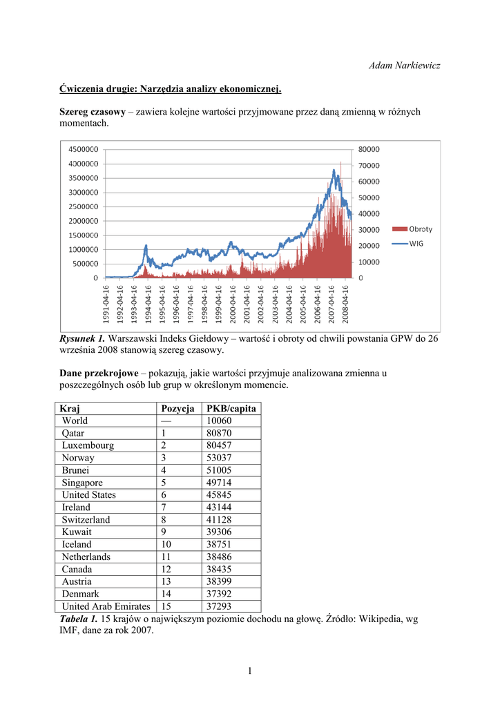 Adam Narkiewicz Ćwiczenia drugie: Narzędzia analizy ekonomicznej. Szereg czasowy – zawiera kolejne wartości przyjmowane przez daną zmienną w róŜnych momentach. Rysunek 1. Warszawski Indeks Giełdowy – wartość i obroty od chwili powstania GPW do 26 września 2008 stanowią szereg czasowy. Dane przekrojowe – pokazują, jakie wartości przyjmuje analizowana zmienna u poszczególnych osób lub grup w określonym momencie. Kraj Pozycja PKB/capita World — 10060 Qatar 1 80870 Luxembourg 2 80457 Norway 3 53037 Brunei 4 51005 Singapore 5 49714 United States 6 45845 Ireland 7 43144 Switzerland 8 41128 Kuwait 9 39306 Iceland 10 38751 Netherlands 11 38486 Canada 12 38435 Austria 13 38399 Denmark 14 37392 United Arab Emirates 15 37293 Tabela 1. 15 krajów o największym poziomie dochodu na głowę. Źródło: Wikipedia, wg IMF, dane za rok 2007. 1 Istnieje jeszcze jeden rodzaj uporządkowania danych, łączący w sobie szeregi czasowe i dane przekrojowe. Nosi on nazwę danych panelowych. Przykładem takiego zbioru danych moŜe być tabela zawierające informacje dotyczące zmian PKB/capita 15 najbogatszych krajów w ciągu ostatnich 10 lat. Dane panelowe mają (zazwyczaj) dwa wymiary: przekrojowy i czasowy. Wskaźnik – wyraŜa względną wartość danej zmiennej, odniesioną do jej wartości w okresie podstawowym (bazowym). Przykład: gru-88 sty-89 lut-89 mar-89 kwi-89 maj-89 cze-89 lip-89 sie-89 wrz-89 paź-89 lis-89 gru-89 sty-90 lut-90 mar-90 kwi-90 maj-90 cze-90 lip-90 sie-90 wrz-90 paź-90 lis-90 gru-90 100 111,00 119,77 129,47 142,16 152,39 161,69 177,05 246,99 331,95 513,86 628,96 740,29 1329,55 1645,99 1716,76 1845,52 1930,41 1996,05 2067,91 2105,13 2201,96 2327,48 2441,52 2585,57 Tabela 1. Wskaźnik poziomu cen w Polsce w latach 1989-1990 (grudzień 1988 = 100) Wskaźnik ceny średniej – wskaźnik skonstruowany na podstawie wskaźników cen poszczególnych dóbr słuŜący do badania zachowania ogółu tych dóbr z uwzględnieniem znaczenia poszczególnych dóbr. Przykład: Wyszczególnienie 1998 2001 2004 Cena aluminium 1400 1500 1700 Cena miedzi 1810 1700 3000 Wskaźnik cen aluminium (2001 = 100) 93 100 113 Wskaźnik cen miedzi (2001 = 100) 106 100 176 Wskaźnik cen metali (2001 = 100) 103,4 100 163,4 Tabela 2. Ceny metali w $/tonę. Wskaźniki cen poszczególnych metali oraz wskaźnik ceny średniej. PoniewaŜ zuŜycie miedzi jest zazwyczaj czterokrotnie większe niŜ zuŜycie aluminium, 2 przy obliczaniu wskaźnika cen metali posłuŜymy się średnią waŜoną. Musimy to zrobić, bo zmiana ceny miedzi jest o wiele waŜniejsza niŜ zmiana ceny aluminium dla całokształtu handlu metalami. Miedzi przypiszemy wagę 0,8, a aluminium 0,2. W ten sposób obliczamy wskaźnik ceny średniej metali dla roku 1998: 0,8 × 106 + 0,2 × 93 = 103,4. W roku 2001: 0,8 × 100 + 0,2 × 100 = 100. I w roku 2004: 0,8 × 176 + 0,2 × 113 = 163,4. Wskaźnik cen detalicznych – (ang. consumer price index – CPI), inaczej „wskaźnik cen towarów konsumpcyjnych i usług”. Uwzględnia się w nim cały szereg dóbr waŜonych tym, jak często są kupowane. Wskaźnik ten słuŜy do obliczania inflacji. Wartości nominalne – wartości wyraŜone w cenach bieŜących. Wartości realne – powstają po skorygowaniu wartości nominalnych o poziom cen. Przykład: ZałóŜmy, Ŝe w gospodarce są dwa dobra: banany i pomarańcze. W roku 2006 banany kosztowały po 10 zł za sztukę, a pomarańcze po 5 złotych za sztukę. W roku 2007 cena bananów wzrosła do 12 złotych za sztukę, a cena pomarańczy do 10 złotych za sztukę. Widzimy zatem, Ŝe nominalna wartość bananów wzrosła o 20% podczas gdy nominalna wartość pomarańczy wzrosła o 100%. W roku 2006 za jednego banana moŜna było dostać 2 pomarańcze, zaś w 2007 za jednego banana otrzymamy juŜ tylko 1,2 pomarańczy. Zatem realna wartość banana spadła o 40%. W 2006 za jedną pomarańczę moŜna było dostać 0,5 banana, a w 2007 za jedną pomarańczę moŜna było dostać 5/6 banana. Zatem wartość realna pomarańczy wzrosła o ok. 66%. Wartość realna informuje nas jak konsument ceni sobie dane dobro w porównaniu z innymi dobrami. Siła nabywcza pieniądza – jest to wskaźnik ilości dóbr, które moŜna nabyć za jednostkę pieniądza. Przykład: Według oficjalnego kursu wymiany, jeden juan jest wart obecnie około 15 centów. Okazuje się jednak, Ŝe siła nabywcza juana jest większa. Oznacza to, Ŝe za juana w Chinach moŜna kupić o wiele więcej niŜ na 15 centów w Stanach Zjednoczonych. Dokładniej, za juana moŜna kupić w Chinach ponad trzy razy więcej porównywalnych dóbr niŜ za 15 centów w USA. Właśnie dzięki temu import z Chin jest taki opłacalny – towary kupowane tam po oficjalnym kursie są bardzo tanie. Z kolei eksport do Chin jest mniej opłacalny, Chińczycy muszą zapłacić za towary zagraniczne bardzo duŜo, co napędza w ich kraju inflację. Ekonomia jest nauką, w której często nie moŜna przeprowadzić eksperymentu weryfikującego teorię. W tych sytuacjach jedyne co pozostaje ekonomistom to zbieranie danych, analizowanie ich, szykanie zaleŜności oraz weryfikowanie czy odkryte zaleŜności są prawdziwe, a jeŜeli tak, to w jakich warunkach. Odkryta zaleŜność często nazywana jest „modelem”. Model zawiera zazwyczaj mnóstwo uproszczeń dotyczących opisywanych zdarzeń. W trakcie zajęć będziemy właśnie poznawać kolejne modele, opisujące zachowanie jednostek w gospodarce (modelem jest np. krzywa moŜliwości produkcyjnych). Oczywiście pojedyncza jednostka wcale nie musi się zachowywać zgodnie z modelem. ceteris paribus – pozostałe czynniki niezmienione. 3 Przykład: Wynajęliśmy biuro o powierzchni 40 metrów kwadratowych. Wówczas funkcja produkcji tego biura (tzn. wydajność pracy pracowników), w zaleŜności od liczby zatrudnionych wykazuje ceteris paribus malejące korzyści skali. Ceteris paribus w powyŜszym zdaniu oznacza, Ŝe inne czynniki takie jak powier