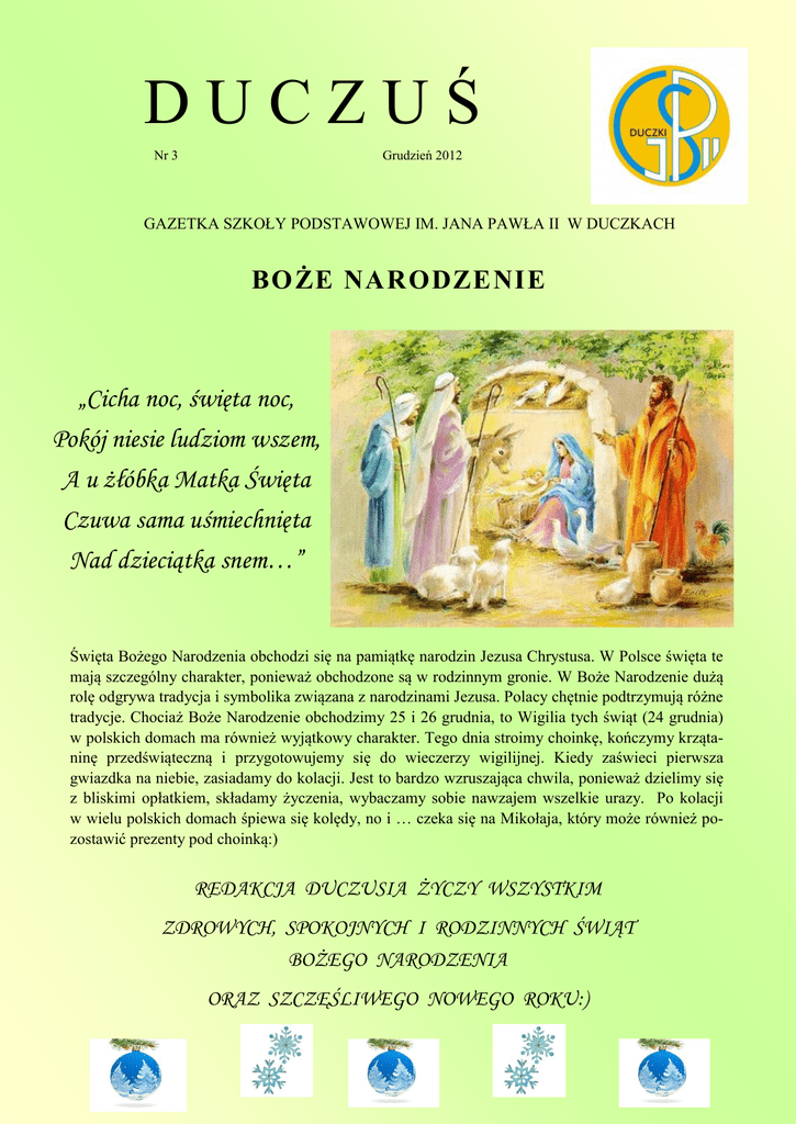 DUCZUŚ Nr 3 Grudzień 2012 GAZETKA SZKOŁY PODSTAWOWEJ IM. JANA PAWŁA II W DUCZKACH BOŻE NARODZENIE „Cicha noc, święta noc, Pokój niesie ludziom wszem, A u żłóbka Matka Święta Czuwa sama uśmiechnięta Nad dzieciątka snem…” Święta Bożego Narodzenia obchodzi się na pamiątkę narodzin Jezusa Chrystusa. W Polsce święta te mają szczególny charakter, ponieważ obchodzone są w rodzinnym gronie. W Boże Narodzenie dużą rolę odgrywa tradycja i symbolika związana z narodzinami Jezusa. Polacy chętnie podtrzymują różne tradycje. Chociaż Boże Narodzenie obchodzimy 25 i 26 grudnia, to Wigilia tych świąt (24 grudnia) w polskich domach ma również wyjątkowy charakter. Tego dnia stroimy choinkę, kończymy krzątaninę przedświąteczną i przygotowujemy się do wieczerzy wigilijnej. Kiedy zaświeci pierwsza gwiazdka na niebie, zasiadamy do kolacji. Jest to bardzo wzruszająca chwila, ponieważ dzielimy się z bliskimi opłatkiem, składamy życzenia, wybaczamy sobie nawzajem wszelkie urazy. Po kolacji w wielu polskich domach śpiewa się kolędy, no i … czeka się na Mikołaja, który może również pozostawić prezenty pod choinką:) REDAKCJA DUCZUSIA ŻYCZY WSZYSTKIM ZDROWYCH, SPOKOJNYCH I RODZINNYCH ŚWIĄT BOŻEGO NARODZENIA ORAZ SZCZĘŚLIWEGO NOWEGO ROKU:) Str. 2 Duczuś, nr 3 Czy wiecie, że... Tradycja obchodów Świąt Bożego Narodzenia jest głęboko zakorzeniona nie tylko w narodzie polskim. Na całym świecie katolicy świętują narodzenie Jezusa, ale w każdym kraju panują nieco odmienne zwyczaje. Do rozpowszechniania zwyczaju budowania żłóbków i szopek najwięcej przyczynił się św. Franciszek z Asyżu i jego bracia. To on, chcąc przypomnieć narodziny Pana Jezusa, nakazał nanieść do groty siana i przyprowadzić wołu i osła. Zawołał braci i pobożnych ludzi. Tam odczytał im Ewangelię o narodzeniu Zbawiciela i wygłosił kazanie o wcieleniu Słowa. O tradycjach bożonarodzeniowych w różnych krajach W Wielkiej Brytanii wigilijny posiłek zaczyna się w południe w ścisłym gronie rodzinnym. Świąteczny obiad składa się z pieczonego indyka i "płonącego puddingu". Wieczorem w Wigilię angielskie dzieci wywieszają swoje pończochy za drzwi, by nazajutrz rano odnaleźć je wypełnione prezentami. Tu narodził się zwyczaj pocałunków pod jemiołą wiszącą u sufitu. W Grecji na prawie każdym stole można znaleźć Christopsomo (Chleb Chrystusa). Jest to okrągły bochenek ozdobiony na szczycie krzyżem, wokół którego ludzie stawiają symbole z ciasta przedstawiające wszystko to, co oznacza długotrwałość. Jeśli biesiadnicy pochodzą z wyspy i są rybakami na ich stole zobaczysz chleb z rybą. Choinki nie są powszechnie używane w Grecji, a prezenty są wręczane 1 stycznia. Prawdziwe święta zaczynają się w Niemczech 25 grudnia. 24 grudnia jest dniem jeszcze wypełnionym ostatnimi przygotowaniami do Świąt. W niemieckich kościołach nie ma tradycyjnej pasterki, na nabożeństwo chodzi się po południu. Po przyjściu z kościoła zaczyna się wieczerza. Dzieci otrzymują pełen talerz słodyczy i owoców. Życzenia składa się bez dzielenia się opłatkiem. Przy kolacji każdy pod talerzem znajduje jakiś pieniążek, co zapewnić ma rodzinie dostatek przez cały rok. To właśnie z tego kraju przyszedł do nas zwyczaj strojenia choinki. W Hiszpanii odpowiednikiem opłatka jest chałwa. Przed Bożym Narodzeniem każda rodzina hiszpańska zaopatruje się w nową szopkę. Święta Bożego Narodzenia pełnią we Francji bardzo ważną rolę. Są to święta rodzinne. Francuzi wręczają sobie ręcznie robione kartki świąteczne oraz kupują prezenty. We Francji, w przeciwieństwie do Polski, nie ma Wigilii. Francuzi biorą udział we mszy, a 25 grudnia siadają do wspólnego obiadu. W ten dzień je się indyka nadziewanego kasztanami i pije dużo szampana. We Francji dzieci wierzą, że to mały Jezus przynosi im prezenty, które w wigilijną noc wkłada do bucików ustawionych przy kominku. W Szwecji Święta Bożego Narodzenia rozpoczynają się w pierwszą niedzielę adwentu. Tradycyjna szwedzka uczta składa się z rozmoczonej suszonej ryby , galaretki wieprzowej, głowizny i chleba, a na deser podaje się pierniczki. Nie stawia się wolnego nakrycia na stole, ale za to odwiedza się samotnych. Szwedzi nie śpiewają kolęd, lecz tańczą wokół choinki. Nr 3 Duczuś, nr3 Co na to dzieci? Przeprowadziłyśmy wywiad z uczniami klasy O¹ na temat świąt Bożego Narodzenia. Okazało się, że dzieci wiedzą bardzo dużo… Oto, co nam powiedziały: 1. Czy wiecie jakie święta się zbliżają? - Mikołajki; Prezenty; Boże Narodzenie; 2. A z czym kojarzą Wam się Święta Bożego Narodzenia? - Z Mikołajem; Z prezentami; Z choinką… 3. O jakich prezentach marzycie? - O grze; O lalce Barbie; O lalce Monster High; O lalce Hello Kitty; 4. Wiecie kto je wam daje? - Święty Mikołaj; 5. A jak wygląda Święty Mikołaj ? - Ma brodę; Ma czerwone ubranie i czapkę; Ma czarne buty; Pasek; Worek z prezentami; Ma pompon; 6. A co chcielibyście podarować Mikołajowi? - List; Ubrania; Nową czapkę; Cukierki; Rękawiczki; Ciastka i mleko; Wierszyki i piosenki; 7. A jak myślicie, co Św. Mikołaj chciałby dostać na prezent? - Ciepłe ubrania; Nowy pasek; Kolorową czapkę; Nowe buty; 8. Lubicie ubierać choinkę? -Taaak; 9. Jakie ozdoby najczęściej na niej wieszacie? - Bombki; Świeczki; Łańcuch; Gwiazdę; 10. Jakie znacie kolędy? - Pójdźmy wszyscy; Wesołą nowinę; Chwała na wysokości; 11. Jakie potrawy świąteczne najbardziej lubicie ? - Słodycze; Babeczki; Ciasteczka; Kapusta; Karp; Barszcz; Pierogi z kapustą; 12. Co robicie w święta ? - Rozpakowujemy prezenty; Zjeżdżamy na sankach; Bawimy się prezentami; Jeździmy na lodowisko; Grzecznie się zachowujemy; Spotykamy się z rodziną; Cała prawda o Świętym Mikołaju Tak naprawdę, to Święty Mikołaj był biskupem, który pomagał bied