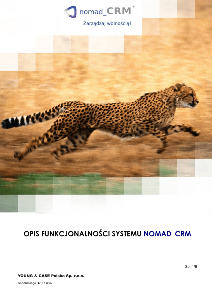 OPIS FUNKCJONALNOŚCI SYSTEMU NOMAD_CRM Str. 1/9 YOUNG & CASE Polska Sp. z.o.o. Godebskiego 32 Raszyn System zarządzania relacjami CRM to narzędzie niezbędne w każdym przedsiębiorstwie. System CRM pozwala na wsparcie strategii zarządzania przedsiębiorstwem oraz skupienie się na kliencie i jego potrzebach. Stanowi on również doskonały sposób na oszczędzanie czasu i podniesienie efektywności pracowników. Wychodząc naprzeciw Państwa oczekiwaniom firma JNS pragnie przedstawić Państwu System NOMAD_CRM. I. OPIS SYSTEMU CRM NOMAD_CRM to system pracy grupowej dostępny poprzez sieć Internet z każdego miejsca na świecie. Został on stworzony w celu usprawnienia zarządzania relacjami. Dzięki jego interfejsowi internetowemu jest łatwo dostępny i niezwykle prosty w obsłudze. System CRM NOMAD_CRM posiada zbiór narzędzi i procedur istotnych w zarządzaniu kontaktami z klientem. Jego wdrożenie pozwala na lepszą organizację czasu pracy w firmie, wgląd w terminy wykonywanych zadań, bazę klientów. Wszystkie moduły zawarte w systemie są ze sobą powiązane. System CRM NOMAD_CRM charakteryzuje szeroka funkcjonalność, co pozwala na jego zastosowanie w przedsiębiorstwach z każdej branży. II. SYSTEM CRM NOMAD_CRM - SPOSÓB KORZYSTANIA Użytkownik może korzystać z systemu CRM NOMAD_CRM poprzez stronę internetową - wystarczy posiadać dowolną przeglądarkę. W systemie można tworzyć konta zwykłych użytkowników, jak i administratorów i ograniczać widoczności niektórych modułów dla wybranych grup użytkowników. Str. 2/9 YOUNG & CASE Polska Sp. z.o.o. Godebskiego 32 Raszyn III. NAJWAŻNIEJSZE MODUŁY SYSTEMU NAZWA MODUŁU OPIS Potencjalni Klienci Baza potencjalnych klientów, z którymi możliwe jest nawiązanie współpracy. Przy nawiązaniu współpracy klient, który znajdował się w module Potencjalni Klienci staje się kontrahentem. Moduł daje możliwość podglądu przyszłych wydarzeń, dokumentów, produktów związanych z potencjalnym klientem. Znajdują się tutaj następujące dane: imię, nazwisko, nazwa firmy, numery telefonów, adres e-mail, stron www, informacje adresowe. Można również zapisać w systemie dodatkowe informacje na temat potencjalnego klienta, notatki i komentarze. Kontrahenci Kontakty Produkty Dokumenty Poczta Mail Szanse sprzedaży Baza firm, osób, z którymi współpraca już została nawiązana i trwa. Moduł ten umożliwia zarządzanie bazą klientów, podgląd m. in. kontaktów, ofert, szans sprzedaży, faktur związanych z danym kontrahentem. Moduł jest bardzo przejrzysty i pozwala w prosty i intuicyjny sposób przeszukać bazę. Posiada również możliwość sortowania po danych kontaktowych i zawiera podstawowe dane dotyczące kontrahenta tj. imię, nazwisko, nazwę firmy, jak i numery telefonów, adres e-mail itp. Moduł ten stanowi bazę posiadanych kontaktów związanych z potencjalnymi klientami i kontrahentami. Istnieje możliwość dopisania kilku kontaktów do danego potencjalnego klienta lub kontrahenta, a także przeglądu szans sprzedaży, umów faktur, ofert, projektów powiązanych z danym kontaktem. Moduł zawiera wszelkie dane kontaktowe do kontrahentów i potencjalnych klientów, umożliwia dodanie notatek, komentarzy, jak i zdjęć. Stanowi zestawienie produktów oferowanych przez firmę, wraz ze stanem magazynowym, ceną i innymi opisami dotyczącymi produktu. Moduł oferuje następujące narzędzia dodatkowe: utworzenie oferty, utworzenie faktury, utworzenie zamówienia do dostawcy, utworzenie zamówienia od klientów. Stanowi bazę dokumentów (dowolnych plików) zgromadzonych w systemie. Użytkownik systemu ma możliwość podłączenia dokumentów m.in. pod kontrahentów, oferty, projekty, zadania, zgłoszenia, usługi. Baza plików prowadzona w systemie pozwala w każdej chwili na szybkie odnalezienie i, w razie potrzeby, pobranie potrzebnego dokumentu przez użytkownika. Każdy dokument jest przypisany pod konkretnego użytkownika lub grupę użytkowników. Klient poczty www stanowi intuicyjny system pocztowy. Umożliwia on wysyłanie wiadomości do kontaktów, kontrahentów, potencjalnych klientów, jak i użytkowników systemu. Użytkownik może tworzyć szablony wiadomości wysyłanych do potencjalnych klientów, kontrahentów, kontaktów, jak i wiadomości wysyłanych w sprawie zgłoszeń. Pozwala na tworzenie szans sprzedaży wraz z planowanym przychodem, przewidywanym czasem trwania, aktualnym etapem sprzedaży i prawdopodobieństwem sukcesu. W trakcie realizacji danego działania użytkownik systemu może modyfikować m. in. etap, przychód. Szanse sprzedaży umożliwiają przegląd aktualnie prowadzonych, jak i zakończonych działań, jak również usprawniają prowadzenie działań w przyszłości. Str. 3/9 YOUNG & CASE Polska Sp. z.o.o. Godebskiego 32 Raszyn Oferty Faktury Kalendarz Umowy Projekty Raporty Moduł ten stanowi bazę ofert przygotowywanych dla klientów powiązanych m. in. z zamówieniami od klientów, dokumentami. Z poziomu oferty można generować faktury, bądź zamówienia od klienta. Każda oferta zawiera informacje dotyczące tematu, numeru, sposobu wysyłki, osoby odpowiedzialnej, osoby kontaktowej, kontrahenta, do którego jest skierowana, informacje adresowe, ustalenia i warunki oferty, listę produktów oferowanych w ramach oferty wraz z cenami, rabatem i kwotą do zapłaty. Moduł jest powiązany z usługami, produktami, zamówieniami i dokumentami wprowadzonymi do systemu. Stanowi rejestr wystawionych faktur powiązanych z dokumentami, produktami. Użytkownik może wystawić fakturę do oferty, dopisać fakturę do Kontrahenta. Każda faktura zawiera informacje dotyczące m. in. tematu, osoby kontaktowej, terminu płatności, kontrahenta, prowizji od sprzedaży, informacji adresowych, warunków i ustaleń, jak i kwoty do zapłaty. Stanowi terminarz, który umożliwia planowanie nadchodzących wydarzeń, delegowanie zadań do wykonania dla danej osoby b