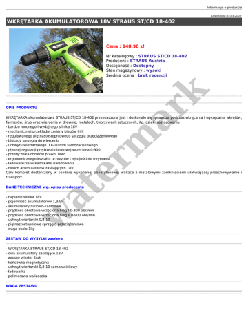 Informacje o produkcie Utworzono 03-03-2017 WKRĘTARKA AKUMULATOROWA 18V STRAUS ST/CD 18-402 Cena : 148,90 zł er m ar k Nr katalogowy : STRAUS ST/CD 18-402 Producent : STRAUS Austria Dostępność : Dostępny Stan magazynowy : wysoki Średnia ocena : brak recenzji OPIS PRODUKTU WKRĘTARKA akumulatorowa STRAUS ST/CD 18-402 przeznaczona jest i doskonale się sprawdza podczas wkręcania i wykręcania wkrętów, farmerów, śrub oraz wiercenia w drewnie, metalach, tworzywach sztucznych, itp. dzięki zastosowaniu: - bardzo mocnego i wydajnego silnika 18V - mechanicznej przekładni zmiany biegów I i II - regulowanego piętnastostopniowego sprzęgła przeciążeniowego - blokady sprzęgła do wiercenia - uchwytu wiertarskiego 0,8-10 mm samozaciskowego - płynnej regulacji prędkości obrotowej wrzeciona 0-900 - przełącznika obrotów prawo lewo - ergonomicznego kształtu uchwytów i rękojości do trzymania - ładowarki ze wskaźnikami naładowania - dwóch akumulatorów zasilających 18V Cały komplet dostarczony w solidnie wykonanej polietylenowej walizce z metalowymi zamknięciami ułatwiającej przechowywanie i transport. at DANE TECHNICZNE wg. opisu producenta w - napięcie silnika 18V - pojemność akumulatorów 1,3Ah - akumulatory niklowo-kadmowe - prędkość obrotowa wrzeciona bieg I 0-300 obr/min - prędkość obrotowa wrzeciona bieg II 0-900 obr/min - uchwyt wiertarski 0,8-10 - piętnastostopniowe sprzęgło przeciążeniowe - waga około 1kg ZESTAW DO WYSYŁKI zawiera - WKRĘTARKA STRAUS ST/CD 18-402 - dwa akumulatory zasilające 18V - zestaw wierteł 6szt - końcówka magnetyczna - uchwyt wiertarski 0,8-10 samozaciskowy - ładowarka - polimerowa walizeczka WAGA ZESTAWU