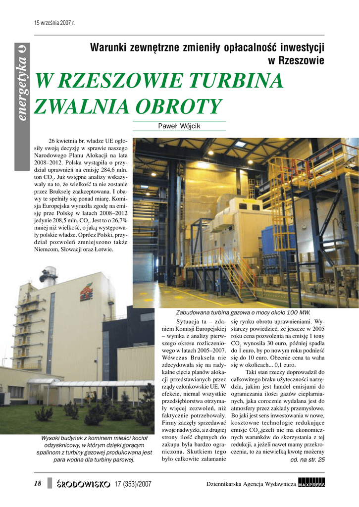 15 wrzeœnia 2007 r. Warunki zewnêtrzne zmieni³y op³acalnoœæ inwestycji w Rzeszowie energetyka  W RZESZOWIE TURBINA ZWALNIA OBROTY Pawe³ Wójcik 26 kwietnia br. w³adze UE og³osi³y swoj¹ decyzjê w sprawie naszego Narodowego Planu Alokacji na lata 2008–2012. Polska wyst¹pi³a o przydzia³ uprawnieñ na emisjê 284,6 mln. ton CO2. Ju¿ wstêpne analizy wskazywa³y na to, ¿e wielkoœæ ta nie zostanie przez Brukselê zaakceptowana. I obawy te spe³ni³y siê ponad miarê. Komisja Europejska wyrazi³a zgodê na emisjê prze Polskê w latach 2008–2012 jedynie 208,5 mln. CO2. Jest to o 26,7% mniej ni¿ wielkoœæ, o jak¹ wystêpowa³y polskie w³adze. Oprócz Polski, przydzia³ pozwoleñ zmniejszono tak¿e Niemcom, S³owacji oraz £otwie. Wysoki budynek z kominem mieœci kocio³ odzysknicowy, w którym dziêki gor¹cym spalinom z turbiny gazowej produkowana jest para wodna dla turbiny parowej. 18 ŒRODOWISKO 17 (353)/2007 Zabudowana turbina gazowa o mocy oko³o 100 MW. Sytuacja ta – zda- siê rynku obrotu uprawnieniami. Wyniem Komisji Europejskiej starczy powiedzieæ, ¿e jeszcze w 2005 – wynika z analizy pierw- roku cena pozwolenia na emisjê 1 tony szego okresu rozliczenio- CO2 wynosi³a 30 euro, póŸniej spad³a wego w latach 2005–2007. do 1 euro, by po nowym roku podnieœæ Wówczas Bruksela nie siê do 10 euro. Obecnie cena ta waha zdecydowa³a siê na rady- siê w okolicach... 0,1 euro. kalne ciêcia planów alokaTaki stan rzeczy doprowadzi³ do cji przedstawianych przez ca³kowitego braku u¿ytecznoœci narzêrz¹dy cz³onkowskie UE. W dzia, jakim jest handel emisjami do efekcie, niemal wszystkie ograniczania iloœci gazów cieplarniaprzedsiêbiorstwa otrzyma- nych, jaka corocznie wydalana jest do ³y wiêcej zezwoleñ, ni¿ atmosfery przez zak³ady przemys³owe. faktycznie potrzebowa³y. Bo jaki jest sens inwestowania w nowe, Firmy zaczê³y sprzedawaæ kosztowne technologie redukuj¹ce swoje nadwy¿ki, a z drugiej emisje CO2,je¿eli nie ma ekonomiczstrony iloœæ chêtnych do nych warunków do skorzystania z tej zakupu by³a bardzo ogra- redukcji, a je¿eli nawet mamy przekroniczona. Skutkiem tego czenia, to za niewielk¹ kwotê mo¿emy by³o ca³kowite za³amanie cd. na str. 25 Dziennikarska Agencja Wydawnicza cd. ze str. 18 dokupiæ sobie uprawnieñ... Tylko przewaga popytu nad poda¿¹ uprawnieñ mo¿e przywróciæ sens istnienia handlu emisjami i sprawiæ, ¿e instrument ten bêdzie wp³ywa³ na ograniczenie emisji gazów cieplarnianych do atmosfery. Najlepszym przyk³adem ekonomicznego rozk³adu systemu handlu emisjami jest inwestycja w Elektrociep³owni Rzeszów. W maju 2003 roku uruchomiony tam zosta³ blok parowogazowy o mocy elektrycznej 96 MWe i cieplnej 76 MWt. Projekt ten przyniós³ bardzo du¿y efekt ekologiczny przy wykorzystaniu m.in, transferu technologii, rozwi¹zañ technicznych, które stanowi³y wzorzec dla tego typu projektów energetycznych w Polsce. Elektrociep³ownia (EC) Rzeszów jest podstawowym Ÿród³em ciep³a dla aglomeracji miejskiej Rzeszowa. Do momentu modernizacji, w EC Rzeszów funkcjonowah kot³y opalane wêglem (zainstalowana moc cieplna – 396 MW), w których rocznie zu¿ywano 119 tys. ton wêgla. Praca tych tradycyjnych kot³ów by³a Ÿród³em znacznej emisji zanieczyszczeñ gazowo-py³owych do œrodowiska. W ramach projektu zbudowano blok gazowo-parowy, który przej¹³ podstawowe obci¹¿enie cieplne elektrociep³owni i dodatkowo produkuje energiê elektryczn¹. W sezonie grzewczym blok wypiera istniej¹ce kot³y wodne do pracy podszczytowej i szczytowej, zaœ w okresie letnim – w za³o¿eniu – mia³ ca³kowicie pokrywaæ potrzeby mieszkañców miasta na dostawê ciep³ej wody u¿ytkowej. Zastosowanie cyklu kombinowanego pozwoli³o na uzyskanie wysokich sprawnoœci: elektrycznej w granicach 50% oraz sprawnoœci ca³kowitej wykorzystania energii cieplnej paliwa na poziomie 89%. Na marginesie warto zauwa¿yæ, ¿e sprawnoœæ wykorzystania energii cieplnej zawartej w paliwie przy jednostkach pracuj¹cych nie w kogeneracji, a jedynie jako instalacje cieplne wynosi jedynie 60%, a przed instalacj¹ bloku gazowo-parowego przedsiêbiorstwo by³o jedynie ciep³owni¹. Koszt ca³ej inwestycji by³ niebagatelny i wynosi³ oko³o 300 mln. z³otych, z czego 29,6 mln w formie dotacji przekaza³a Fundacja EkoFundusz. – Dla nas inwestycja w EC Rzeszów ma istotny walor transferu na teren Polski i do naszej gospodarki naj- Dziennikarska Agencja Wydawnicza nowoczeœniejszych technologii. Sfinansowaliœmy w niej najwa¿niejsz¹ czêœæ, turbinê, która jest w zasadzie odpowiednikiem silnika odrzutowego. Inwestycja ta by³a wrêcz wzorcowa dla wielu innych instalacji wykorzystuj¹cych cd. ze str. 16 turbiny gazowe – powiedzia³ prof. szego kraju w przygotowanie Maciej Nowicki, prezes EkoFunduszu. Realizacja projektu przynios³a Ba³tyckiego Planu Dzia³ania. bardzo du¿¹ redukcjê emisji zanieczyszTen dokument, nad którym czeñ do powietrza. Emisja py³u spad³a z koñcz¹ siê ju¿ prace, ma re300 ton rocznie do 150 (redukcja o 50%), gulowaæ kwestiê ochrony naemisja dwutlenku siarki analogicznie z szego morza. 1705 ton rocznie do 480 (redukcja o 17 wrzeœnia eksperci HEL72%), emisja tlenków azotu spad³a z 875 COM, organizacji z³o¿onej z ton rocznie do 375 (redukcja o 57%). O delegatów krajów nadba³tyc461 tys. ton rocznie spad³a emisja dwukich, spotkaj¹ siê, by omówiæ tlenku wêgla. Ograniczenie emisji zanieostateczne postanowienia w czyszczeñ by³o bardzo istotne, m.in. ze wzglêdu na s¹siedztwo licznych obszasprawie Ba³tyckiego Planu rów specjalnie chronionych, w tym 7 reDzia³ania. Wiadomo, ¿e Polska zerwatów przyrody oraz obszarów chroswoj¹ biernoœæ bêdzie próbonionego krajobrazu. wa³a t³umaczyæ jednym arguW za³o¿eniu, blok parowo-gazomentem: nie staæ nas na ekowy mia³ pracowaæ w podstawie, a w zilogiczne dzia³ania. mowym sezonie grzewczym mia³ byæ – Tymczasem UE na wszystwspiera