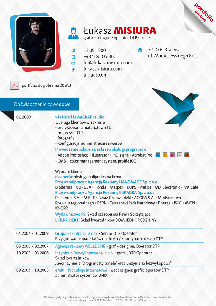 po li o fo ine -l on rt Łukasz Misiura grafik • fotograf • operator DTP • trener 13.09.1980 +48.504105588 [email protected] lukaszmisiura.com lm-ads.com 30-376, Kraków ul. Moraczewskiego 8/12 portfolio do pobrania 20 MB Doświadczenie zawodowe 01.2009- właściciel LuMiGRAF studio Obsługa klientów w zakresie: - projektowania materiałów BTL - prepress i DTP - fotografia - konfiguracja, administracja serwerów Prowadzenie szkoleń z zakresu obsługi programów: - Adobe Photoshop • Illustrator • InDisigne • Acrobat Pro - CMS – color management system, profile ICC Wybrani klienci: cleaneria: obsługa poligraficzna firmy Przy współpracy z Agencją Reklamy HANDMADE Sp. z o.o.: Bioderma • NORDEA • Honda • Maspex • KUPS • Philips • MIX Electronic • MK Cafe Przy współpracy z Agancja Reklamy ESKADRA Sp. z o.o.: Polcomtel S.A. • MIELE • Pasaz Grunwaldzki • AGORA S.A. • Ministerstwo Rozwoju regionalnego • PZPN • Tatrzański Park Narodowy • Energa • P&G • AVON • KNORR Wydawnictwo FS: Skład czasopisma Firma Sprzątająca LK&PROJEKT: Skład kwartalników DOM JEDNORODZINNY 04.2007-01.2009 Grupa Eskadra sp. z o.o. • Senior DTP Operator Przygotowanie materiałów do druku / koordynator działu DTP 03.2006-02.2007 Agencja reklamy WELLDONE • grafik designer, Operator DTP 10.2005-03.2006 I nżynieria Bezwykopowa sp. z o.o. • grafik, DTP Operator Skład kwartalników: „Geoinżynieria: Drogi mosty tunele” oraz „Inżynieria bezwykopowa” 09.2003-10.2005 eMKI - Produkcje Internetowe • webdesigner, grafik, operator DTP, administrator systemów UNIX Wyrażam zgodę na przetwarzanie moich danych osobowych zawartych w ofercie pracy dla potrzeb procesu rekrutacji zgodnie z ustawą z dnia 29.08.1997r. Dz. U. z 2002 r., Nr 101, poz. 923 ze zm. Łukasz Misiura Umiejętności grafik • fotograf • operator DTP BEGINNER FAMILIAR ADVANCED EXPERT Windows Linux MAC Office ADOBE® Photoshop Illustrator InDesign Acrobat Pro Bridge Premiere Flash After Effect Dreamweaver Lightroom P raca w zespole oraz pod presją czasu, nie tracę zimnej krwi Sumienność, dokładność, samodzielność Umiejetnosc robienia zdjec plenerowych, studyjnych oraz przedmiotow do reklamy Bardzo dobra znajomość zagadnień DTP i PrePress Kursy i szkolenia Prawo jazdy kat.B :-) Uprawnienia SPE do 1kV 2011 ADOBE® Certified Expert – InDesign® CS5 ADOBE® Certified Expert – Illustrator® CS4 &CS5 ADOBE® Certified Expert – Photoshop® CS5 Mobilność możliwość przeprowadzki. Wyrażam zgodę na przetwarzanie moich danych osobowych zawartych w ofercie pracy dla potrzeb procesu rekrutacji zgodnie z ustawą z dnia 29.08.1997r. Dz. U. z 2002 r., Nr 101, poz. 923 ze zm. Łukasz Misiura Referencje grafik • fotograf • operator DTP HAND MADE od 06.2011 Fachowiec w kazdym calu, jak ktos czegos nie wie, to on bedzie wiedział. Marcin Janik (współpracownik) wystawiono 2013-05-17 Łukasz dobrze wykonuje swoje zadania - nawet, gry zli akanci prosza go o cos niemozliwego do realizacji, zaklnie pod nosem i zadanie wykona. Posiada tez ogrom wiedzy spoza scisłych granic obowiazków operatora DTP, co na pewno jest godne docenienia :) Bez DTP zycie w naszej firmie było by koszmarem. Poprawia, naprawia, i skoryguja. Szybko i z klasa. Polecam bo dziabia to spójnie i porzadnie. Dzieki Łukasz. Łukasz Kułakowski (współpracownik) wystawiono 2011-12-11 Kuba Przyborowski (współpracownik) wystawiono 2012-09-15 LuMiGRAF studio grafiki od 01.2009 Łukasz Misiura to wszechstronnie utalentowany człowiek. Sprawdza sie jako grafik, fotograf i twórca stron internetowych. Podczas naszej współpracy wykazał sie profesjonalizmem, kreatywnoscia i precyzja godna Sherlocka Holmesa :) Marzena Daniel (współpracownik) wystawiono 2012-09-16 Szybko, sprawnie, bez wydziwiania i fochów – zawsze konkret w pracy. Biznesowy partner wart polecenia! Marek Tobolewski (współpracownik) wystawiono 2012-09-15 Grupa Eskadra sp. z o.o. od 04.2007 do 04.2011 Profesjonalista w kazdym calu! Doskonale wykonuje swoja prace, a co najwazniejsze kocha to co robi. Sabina Kornblit (współpracownik) wystawiono 2013-01-03 Chetny do pomocy, otwarty, pomysłowy i z pozytywnym nastawieniem - taki jest Łukasz i dlatego fajnie ie z nim pracuje! Barbara Labudda (współpracownik) wystawiono 2012-11-19 Inne referencje dostępne są na stronie: lukaszmisiura.com Wyrażam zgodę na przetwarzanie moich danych osobowych zawartych w ofercie pracy dla potrzeb procesu rekrutacji zgodnie z ustawą z dnia 29.08.1997r. Dz. U. z 2002 r., Nr 101, poz. 923 ze zm.