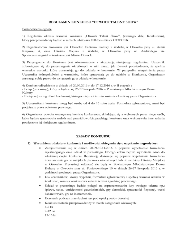REGULAMIN KONKURSU "OTWOCK TALENT SHOW" Postanowienia ogólne 1) Regulamin określa warunki konkursu „Otwock Talent Show”, (zwanego dalej Konkursem), który przeprowadzony będzie w ramach jubileuszu 100-lecia miasta OTWOCK. 2) Organizatorem Konkursu jest Otwockie Centrum Kultury z siedzibą w Otwocku przy ul. Armii Krajowej 4, oraz Oświata Miejska z siedzibą w Otwocku przy ul. Andriollego 76. Sponsorem nagród w konkursie jest Miasto Otwock. 3) Przystąpienie do Konkursu jest równoznaczne z akceptacją niniejszego regulaminu. Uczestnik zobowiązuje się do przestrzegania określonych w nim zasad, jak również potwierdzenia, że spełnia wszystkie warunki, które uprawniają go do udziału w konkursie. W przypadku niespełnienia przez Uczestnika któregokolwiek z warunków, które uprawniają go do udziału w Konkursie, Organizator zastrzega sobie prawo do wyłączenia go z udziału w konkursie. 4) Konkurs odbędzie się w dniach od 20.09.2016 r. do 17.12.2016 r. w II etapach : - I etap (precasting), który odbędzie się 26-27 listopada 2016 w Powiatowym Młodzieżowym Domu Kultury, - II etap – (casting i finał konkursu), którego miejsce i termin zostanie określony przez Organizatora. 5) Uczestnikami konkursu mogą być osoby od 4 do 16 roku życia. Formularz zgłoszeniowy, musi być podpisany przez opiekuna prawnego. 6) Organizator powoła wewnętrzną komisję konkursową składającą się z wybranych przez niego osób, która będzie sprawowała nadzór nad prawidłowością przebiegu konkursu oraz wykonywała inne zadania powierzone jej niniejszym regulaminem. ZASADY KONKURSU 1) Warunkiem udziału w konkursie i możliwości ubiegania się o uzyskanie nagrody jest: Zarejestrowanie się w dniach 20.09-10.11.2016 r. poprzez wypełnienie formularza rejestracyjnego oraz udział w precastingu, którego celem będzie wyłonienie osób do właściwej części konkursu. Rejestrację dokonuje się poprzez wypełnienie formularza i dostarczenie go do miejskich placówek oświatowych lub do siedzimy Oświaty Miejskiej w Otwocku. Precastingi odbywać się będą w Powiatowym Młodzieżowym Domu Kultury w Otwocku przy ul. Poniatowskiego 10 w dniach 26-27 listopada 2016 r. w godzinach podanych przez Organizatora. Dla uczestników, którzy wypełnią formularz zgłoszeniowy i spełnią warunki udziału w konkursie, komisja konkursowa wskaże termin i godzinę precastingu. Udział w precastingu będzie polegał na zaprezentowaniu jury swojego talentu np.: śpiewu, tańca, umiejętności gawędziarskich, gry aktorskiej, sprawności fizycznej, treści kabaretowych, gry na instrumencie. Uczestnik podczas przesłuchań jest pod opieką osoby dorosłej. Konkurs zostanie przeprowadzony w trzech kategoriach wiekowych: 4-6 lat 7-12 lat 13-16 lat Podczas precastingu zostanie wyłonionych 30 uczestników, którzy wezmą udział w II etapie konkursu. W II etapie konkursu uczestnicy zaprezentują swój talent 3-osobowemu jury z udziałem Rafała Maseraka. II etap konkursu odbędzie się w miejscu i terminie określonym przez Organizatora na głównej scenie wydarzenia, podczas którego jury ogłosi dziewięciu finalistów /po 3 z każdej grupy wiekowej/ Finał Konkursu i występy laureatów odbędą się w dniu castingu, po ogłoszeniu jego wyników. Opiekun prawny uczestnika wyraża dobrowolną zgodę na : - przetwarzanie danych osobowych przez Organizatora Konkursu w celach związanych z organizacją i przeprowadzeniem konkursu zgodnie z Ustawą o ochronie danych osobowych Dz.U. 2014 poz. 1182 ze zm. - umieszczenie danych osobowych uczestnika, jak również danych przekazanych w trakcie uczestnictwa w konkursie, w bazie danych organizatora zgodnie z ustawą o ochronie danych osobowych. - wykorzystanie i upublicznienie swojego wizerunku do celów realizacji konkursu oraz wyrażenia zgody na jego wykorzystanie przez Organizatora przez okres 12 miesięcy. 2) Informacje ogólne Występ nie może zawierać treści dyskryminujących lub wulgarnych Podczas występu uczestnik nie może być ubrany prowokacyjnie Prezentacja w precastingu nie może być dłuższa niż 1 minuta. Prezentacja w II etapie konkursu nie może być dłuższa niż 5 minut. Uczestnicy są także zobowiązani dostarczyć przed występem wolny od wad fizycznych nośnik z nagraniem podkładu muzycznego. Uczestnik ma prawo wystąpić sam lub w towarzystwie zespołu, chóru, orkiestry. Uczestnik ma dostosować swój pokaz do możliwości technicznych sceny. Organizator nie bierze odpowiedzialności za w/w elementy występu. Organizator zapewnia sprzęt nagłaśniający i oświetleniowy, mikrofon, odtwarzacz CD, rzutnik multimedialny - potrzeby w tym zakresie należy wpisać w karcie zgłoszeń. Zabezpieczenie wszystkich pozostałych rekwizytów niezbędnych do występu leży po stronie uczestnika. Uczestnik może brać udział w jednej z kategorii 3) Nagrody Nagrodą główną dla każdego z trzech Laureatów konkursu/jednego z każdej kategorii wiekowej/ będzie nagroda w postaci voucherów. Pozostali finaliści konkursu otrzymają nagrody rzeczowe. Laureatom nie przysługuje prawo do zastrzeżenia szczególnych właściwości nagród ani do otrzymania ich ekwiwalentu pieniężnego. Organizator nie ponosi odpowiedzialności za jakość i użyteczność nagrody. Nabycie nagrody w konkursie nastąpi na podstawie protokołu przekazania po potwierdzeniu przez organizatora zgodności danych osobowych. 4) Postanowienia końcowe Organizator zastrzega sobie prawo zmiany postanowień niniejszego regulaminu w dowolnym terminie bez podania przyczyn przy zastosowaniu odpowiednich form informacji. Organizator ma prawo żądać złożenia przez uczestników stosowanych oświadczeń niezbędnych dla prawidłowego przebiegu konkursu. Regulamin konkursu będzie dostępny w siedzibie organizatora: Oświacie Miejskiej, podległych placówkach oświatowych, Otwockim Centrum Kultury jak również na ich stronach www oraz na stronie www.otwock.pl Organizat
