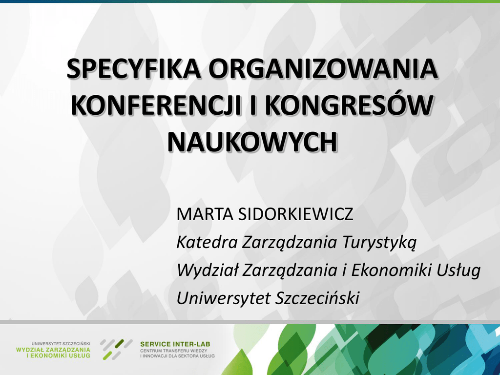 SPECYFIKA ORGANIZOWANIA KONFERENCJI I KONGRESÓW NAUKOWYCH MARTA SIDORKIEWICZ Katedra Zarządzania Turystyką Wydział Zarządzania i Ekonomiki Usług Uniwersytet Szczeciński PLAN PREZENTACJI 1. Uzasadnienie wyboru tematu 2. Teoretyczne aspekty dotyczące konferencji i kongresów 3. Logistyczna procedura organizowania wydarzeń o charakterze naukowym, czyli ich specyfika 4. Podsumowanie UZASADNIENIE WYBORU TEMATU • Uczestnictwo w różnego rodzaju wydarzeniach o charakterze teoretycznym stanowi dla pracowników nauki jeden z najważniejszych nierutynowych obowiązków służbowych, • Branie udziału w takich spotkaniach to swego rodzaju narzędzie pracy, którego celem jest rozwój naukowy, • Celem opracowania jest próba zdiagnozowania obszarów merytorycznych różniących konferencje i kongresy naukowe od pozostałych imprez tego typu, czyli wskazanie specyfiki spotkań naukowych, szczególnie w kontekście ich organizowania. TEORETYCZNE ASPEKTY DOTYCZĄCE KONFERENCJI I KONGRESÓW • Uczestnictwo w konferencjach i kongresach różnego rodzaju składa się na ruch turystyczny określany mianem turystyki konferencyjno-kongresowej. • Turystyka ta jest określana jako kompleksowa obsługa wydarzeń oraz całkowite zabezpieczenie potrzeb bytowych i rekreacyjnych uczestników i spraw związanych z organizacją obrad. • Turystyka ta ma zwykle charakter grupowy, krótkoterminowy i elitarny. MNOGOŚĆ RODZAJÓW SPOTKAŃ… • to konferencje, kongresy, seminaria, szkolenia, sympozja, narady, posiedzenia, zjazdy itp. • z pewnością najpopularniejszymi wydarzeniami wchodzącymi w skład turystyki konferencyjnokongresowej są konferencje i kongresy. KONFERENCJA KONTRA KONGRES • kongres od konferencji różni znaczna liczba uczestników, organizowany jest zwykle co kilka lat, a wyniki prac kongresów, ze względu na swoją doniosłość, są szeroko popularyzowane. • natomiast od strony praktycznej (organizacja imprezy, elementy składające się na wydarzenie, przebieg obrad) są bardzo podobne. • zarówno konferencja, jak i kongres, są spotkaniami tematyczno – merytorycznymi, mającymi określoną budowę, którą zależnie od wizji organizatorów można zmieniać. INICJATORAMI KONFERENCJI I KONGRESÓW SĄ: • organizacje formalne, • partie polityczne, • instytucje publiczne i naukowe, • szkolnictwo, • przedsiębiorstwa, • grupy interesów (komercyjne, religijne, środowiskowe). LOGISTYCZNA PROCEDURA ORGANIZOWANIA WYDARZENIA O CHARAKTERZE NAUKOWYM • Zagadnienia wstępne 1. Pomysł na wydarzenie, czyli koncepcja Rady Naukowej; 2. Zaplecze konferencyjne, czyli Komitet Organizacyjny; 3. Długość przygotowań. ETAPY ORGANIZACJI WYDARZENIA O CHARAKTERZE NAUKOWYM 1. Określenie warunków wydawniczych dla uczestników konferencji; 2. Wybór miejsca konferencji/kongresu naukowego; 3. Patronat honorowy/medialny i sponsoring; 4. Bieżący kontakt z uczestnikami; 5. Negocjacje z dostawcami usług; 6. Realizacja wydarzenia. RÓŻNICE I PODOBIEŃSTWA POMIĘDZY KONFERENCJAMI I KONGRESAMI NAUKOWYMI A POZOSTAŁYMI IMPREZAMI DO OBSZARÓW RÓŻNIĄCYCH WYDARZENIA NAUKOWE OD INNYCH NALEŻĄ: • długość organizowania spotkania, • zleceniodawca/organizator spotkania, • uczestnicy spotkania, • relacja uczestników ze zleceniodawcą/organizatorem, • miejsce spotkania, • budżet spotkania, • materiały konferencyjne, • wizja spotkania. OBSZARY PODOBNE TO: • cel spotkania, • liczba uczestników spotkania, • miejsce spotkania, • czas trwania spotkania, • trendy w zakresie organizowania spotkania. PODSUMOWANIE • Procedura organizacji wydarzenia o charakterze naukowym jest bardzo rozbudowana. • Wiele działań, czyli procesów logistycznych prowadzonych jest równolegle z innymi. • Im większa liczba uczestników spotkania, tym wyraźniejszy jest podział na poszczególne zadania personelu obsługującego imprezę i tym wyraźniejsze rozwiązania logistyczne. • Procedura organizowania spotkania jest swoistym systemem logistycznym, który stawia zadania, określa środki i warunki niezbędne do wykonywania zadnia, wdraża je w życie, a później kontroluje. TROCHĘ AUTOREKLAMY, ale związanej z tematem SERVICE INTER-LAB CENTRUM TRANSFERU WIEDZY I INNOWACJI DLA SEKTORA USŁUG • to nowoczesny ośrodek wsparcia innowacyjności przedsiębiorstw, którego celem jest wieloaspektowy i wielokierunkowy transfer wiedzy pomiędzy nauką i biznesem; • dzięki rozbudowanej infrastrukturze i dostępowi do informacji w SIL można będzie świadczyć usługi na rzecz przedsiębiorców, studentom umożliwiać naukę przez praktykę, a naukowcom dostęp do najświeższych danych; • to zaawansowana technologicznie infrastruktura oraz dostęp do najbardziej aktualnej wiedzy. CENTRUM EDUKACJI BIZNESOWEJ • zespół kilkunastu sal konferencyjnych różnej wielkości, z możliwością łączenia i podziałów, wyposażonych w sprzęt do wideokonferencji, sprzęt wizualizacyjny oraz specjalistyczne oprogramowanie… https://www.youtube.com/watch?v=kSNnRD0sd3Q#t=17 Dziękuję za uwagę Marta Sidorkiewicz email: [email protected]