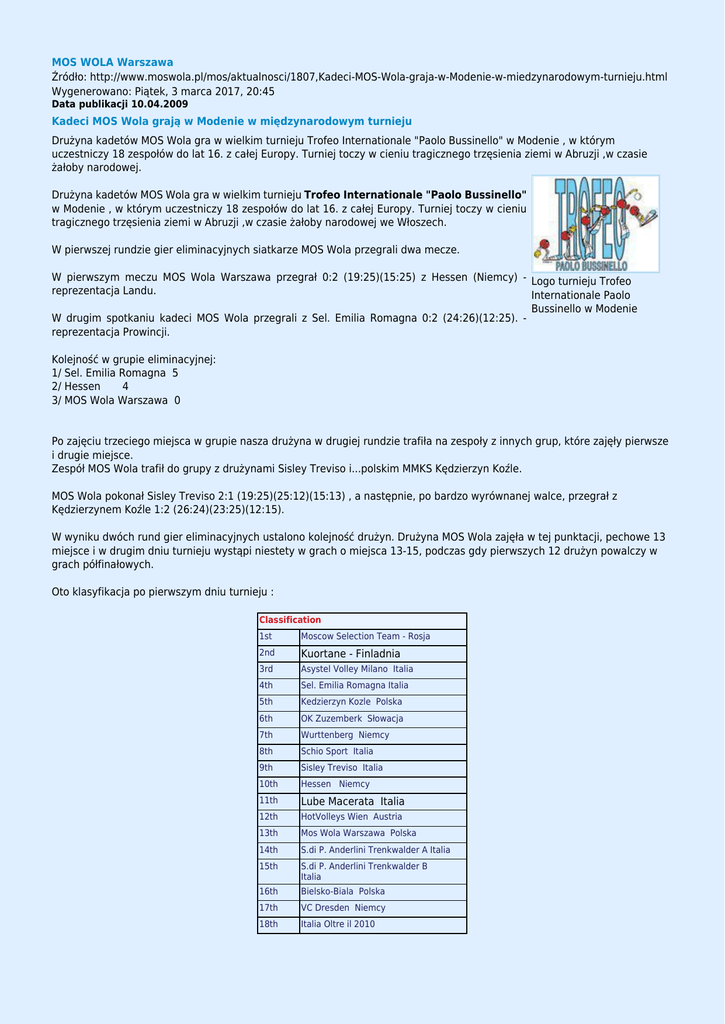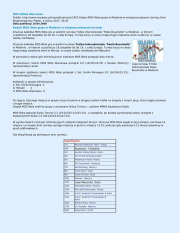 MOS WOLA Warszawa Źródło: http://www.moswola.pl/mos/aktualnosci/1807,Kadeci-MOS-Wola-graja-w-Modenie-w-miedzynarodowym-turnieju.html Wygenerowano: Piątek, 3 marca 2017, 20:45 Data publikacji 10.04.2009 Kadeci MOS Wola grają w Modenie w międzynarodowym turnieju Drużyna kadetów MOS Wola gra w wielkim turnieju Trofeo Internationale "Paolo Bussinello" w Modenie , w którym uczestniczy 18 zespołów do lat 16. z całej Europy. Turniej toczy w cieniu tragicznego trzęsienia ziemi w Abruzji ,w czasie żałoby narodowej. Drużyna kadetów MOS Wola gra w wielkim turnieju Trofeo Internationale "Paolo Bussinello" w Modenie , w którym uczestniczy 18 zespołów do lat 16. z całej Europy. Turniej toczy w cieniu tragicznego trzęsienia ziemi w Abruzji ,w czasie żałoby narodowej we Włoszech. W pierwszej rundzie gier eliminacyjnych siatkarze MOS Wola przegrali dwa mecze. W pierwszym meczu MOS Wola Warszawa przegrał 0:2 (19:25)(15:25) z Hessen (Niemcy) - Logo turnieju Trofeo reprezentacja Landu. Internationale Paolo Bussinello w Modenie W drugim spotkaniu kadeci MOS Wola przegrali z Sel. Emilia Romagna 0:2 (24:26)(12:25). reprezentacja Prowincji. Kolejność w grupie eliminacyjnej: 1/ Sel. Emilia Romagna 5 2/ Hessen 4 3/ MOS Wola Warszawa 0 Po zajęciu trzeciego miejsca w grupie nasza drużyna w drugiej rundzie trafiła na zespoły z innych grup, które zajęły pierwsze i drugie miejsce. Zespół MOS Wola trafił do grupy z drużynami Sisley Treviso i...polskim MMKS Kędzierzyn Koźle. MOS Wola pokonał Sisley Treviso 2:1 (19:25)(25:12)(15:13) , a następnie, po bardzo wyrównanej walce, przegrał z Kędzierzynem Koźle 1:2 (26:24)(23:25)(12:15). W wyniku dwóch rund gier eliminacyjnych ustalono kolejność drużyn. Drużyna MOS Wola zajęła w tej punktacji, pechowe 13 miejsce i w drugim dniu turnieju wystąpi niestety w grach o miejsca 13-15, podczas gdy pierwszych 12 drużyn powalczy w grach półfinałowych. Oto klasyfikacja po pierwszym dniu turnieju : Classification 1st Moscow Selection Team - Rosja 2nd Kuortane - Finladnia 3rd Asystel Volley Milano Italia 4th Sel. Emilia Romagna Italia 5th Kedzierzyn Kozle Polska 6th OK Zuzemberk Słowacja 7th Wurttenberg Niemcy 8th Schio Sport Italia 9th Sisley Treviso Italia 10th Hessen Niemcy 11th Lube Macerata Italia 12th HotVolleys Wien Austria 13th Mos Wola Warszawa Polska 14th S.di P. Anderlini Trenkwalder A Italia 15th S.di P. Anderlini Trenkwalder B Italia 16th Bielsko-Biala Polska 17th VC Dresden Niemcy 18th Italia Oltre il 2010 Kadeci MOS Wola zagrają jutro w grupie z dwoma zespołami gospodarzy, Scuola di Pallavolo Anderlini A i B. Komentarz (0) dodaj komentarz Brak komentarzy dodaj komentarz