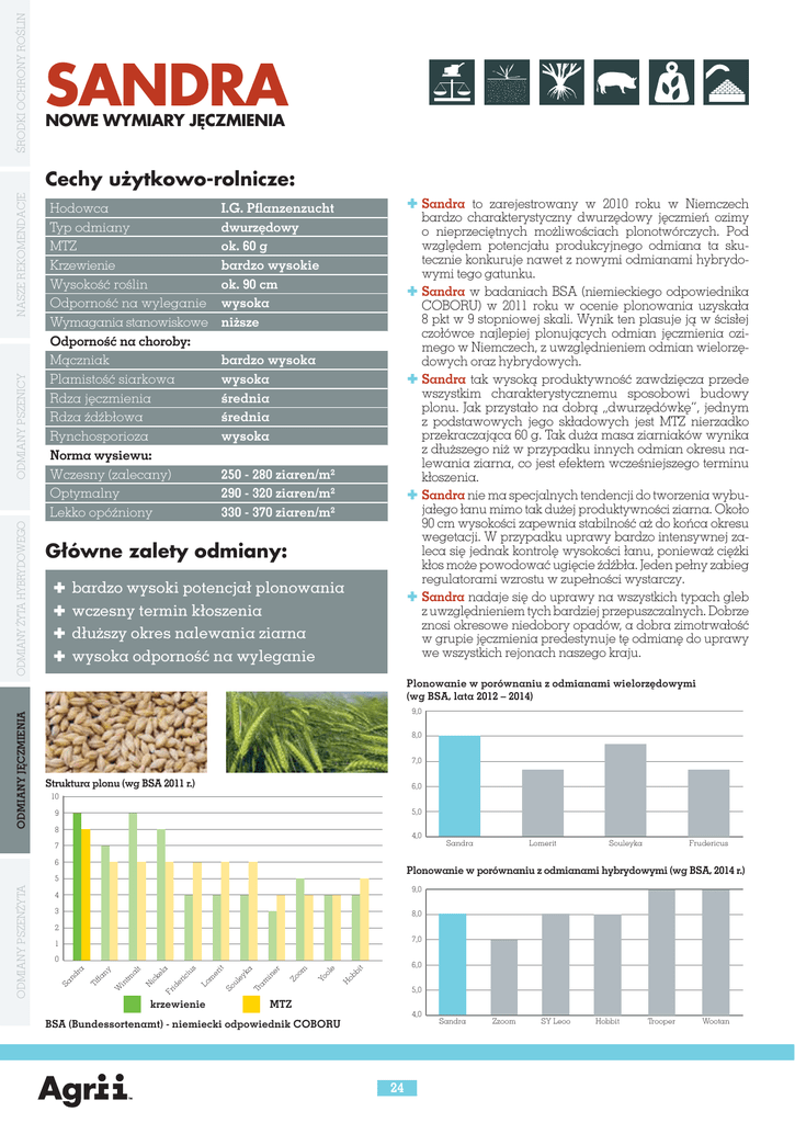 ŚRODKI OCHRONY ROŚLIN SANDRA NOWE WYMIARY JĘCZMIENIA ODMIANY ŻYTA HYBRYDOWEGO ODMIANY PSZENICY NASZE REKOMENDACJE Cechy użytkowo-rolnicze: ®® Sandra to zarejestrowany w 2010 roku w Niemczech bardzo charakterystyczny dwurzędowy jęczmień ozimy o nieprzeciętnych możliwościach plonotwórczych. Pod względem potencjału produkcyjnego odmiana ta skutecznie konkuruje nawet z nowymi odmianami hybrydowymi tego gatunku. ®® Sandra w badaniach BSA (niemieckiego odpowiednika COBORU) w 2011 roku w ocenie plonowania uzyskała 8 pkt w 9 stopniowej skali. Wynik ten plasuje ją w ścisłej czołówce najlepiej plonujących odmian jęczmienia ozimego w Niemczech, z uwzględnieniem odmian wielorzędowych oraz hybrydowych. ®®Sandra tak wysoką produktywność zawdzięcza przede wszystkim charakterystycznemu sposobowi budowy plonu. Jak przystało na dobrą „dwurzędówkę”, jednym z podstawowych jego składowych jest MTZ nierzadko przekraczająca 60 g. Tak duża masa ziarniaków wynika z dłuższego niż w przypadku innych odmian okresu nalewania ziarna, co jest efektem wcześniejszego terminu kłoszenia. ®® Sandra nie ma specjalnych tendencji do tworzenia wybujałego łanu mimo tak dużej produktywności ziarna. Około 90 cm wysokości zapewnia stabilność aż do końca okresu wegetacji. W przypadku uprawy bardzo intensywnej zaleca się jednak kontrolę wysokości łanu, ponieważ ciężki kłos może powodować ugięcie źdźbła. Jeden pełny zabieg regulatorami wzrostu w zupełności wystarczy. ®® Sandra nadaje się do uprawy na wszystkich typach gleb z uwzględnieniem tych bardziej przepuszczalnych. Dobrze znosi okresowe niedobory opadów, a dobra zimotrwałość w grupie jęczmienia predestynuje tę odmianę do uprawy we wszystkich rejonach naszego kraju. I.G. Pflanzenzucht dwurzędowy ok. 60 g bardzo wysokie ok. 90 cm wysoka niższe Hodowca Typ odmiany MTZ Krzewienie Wysokość roślin Odporność na wyleganie Wymagania stanowiskowe Odporność na choroby: Mączniak Plamistość siarkowa Rdza jęczmienia Rdza źdźbłowa Rynchosporioza Norma wysiewu: Wczesny (zalecany) Optymalny Lekko opóźniony bardzo wysoka wysoka średnia średnia wysoka 250 - 280 ziaren/m² 290 - 320 ziaren/m² 330 - 370 ziaren/m² Główne zalety odmiany: ® bardzo wysoki potencjał plonowania ® wczesny termin kłoszenia ® dłuższy okres nalewania ziarna ® wysoka odporność na wyleganie ODMIANY JĘCZMIENIA Plonowanie w porównaniu z odmianami wielorzędowymi (wg BSA, lata 2012 – 2014) 9,0 8,0 7,0 Struktura plonu (wg BSA 2011 r.) 6,0 10 5,0 9 8 4,0 7 6 Lomerit Souleyka Frudericus Plonowanie w porównaniu z odmianami hybrydowymi (wg BSA, 2014 r.) 5 9,0 4 3 8,0 2 7,0 1 krzewienie ob b e it 6,0 H Yo ol m er Zo o m in Tr a So ul ey k a it s iu Lo m er ic er id Fr t ke la al tm ic N an y W in Ti ff nd ra 0 Sa ODMIANY PSZENŻYTA Sandra 5,0 MTZ 4,0 BSA (Bundessortenamt) - niemiecki odpowiednik COBORU 24 Sandra Zzoom SY Leoo Hobbit Trooper Wootan