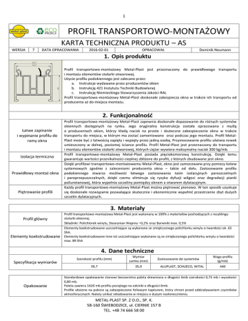 1 PROFIL TRANSPORTOWO-MONTAŻOWY KARTA TECHNICZNA PRODUKTU – AS WERSJA 7 DATA OPRACOWANIA 2016-02-01 OPRACOWAŁ Dominik Neumann 1. Opis produktu Profil transportowo-montażowy Metal-Plast jest przeznaczony do prawidłowego transportu i montażu elementów stolarki otworowej. Użycie profilu podokiennego jest zalecane przez: a. Instrukcje wydawane przez producentów okien b. Instrukcję 421 Instytutu Techniki Budowlanej c. Instrukcję Niemieckiego Stowarzyszenia Jakości RAL Profil transportowo-montażowy Metal-Plast doskonale zabezpiecza okna w trakcie ich transportu od producenta aż do miejsca montażu. 2. Funkcjonalność Łatwe zapinanie i wypinanie profilu do ramy okna Izolacja termiczna Prawidłowy montaż okna Piętrowanie profili Profil transportowo-montażowy Metal-Plast zapewnia doskonałe dopasowanie do różnych systemów okiennych dostępnych na rynku. Jego oryginalna konstrukcja została opracowana z myślą o producentach okien, którzy kładą nacisk na proste i skuteczne zabezpieczenie okna w trakcie transportu do miejsca, w którym ma zostać zamontowane oraz podczas jego montażu. Profil MetalPlast może być z łatwością zapięty i wypięty przez jedną osobę. Przymocowanie profilu ułatwia rowek umieszczony w dolnej, poziomej ściance profilu. Profil Metal-Plast jest przeznaczony do transportu i montażu elementów stolarki otworowej, których ciężar wywiera maksymalny nacisk 300 kg/mb. Profil transportowo-montażowy Metal-Plast posiada pięciokomorową konstrukcję. Dzięki temu gwarantuje wartości przenikalności cieplnej zbliżone do profili, z których zbudowane jest okno. Dzięki profilowi transportowo-montażowemu Metal-Plast, okno jest zamocowane przy pomocy kotew systemowych zgodnie z zaleceniami producenta okna – także od dołu. Zastosowanie profilu podokiennego stwarza możliwość łatwego zastosowania taśm izolacyjnych paroszczelnych i paroprzepuszczalnych, dzięki czemu eliminuje się ryzyko dyfuzji wilgoci oraz degradacji pianki poliuretanowej, która wypełnia szczeliny pomiędzy oknem a otworem dylatacyjnym. Każdy profil transportowo-montażowy Metal-Plast można piętrować pionowo. W ten sposób uzyskuje się doskonałe rozwiązanie pozwalające skutecznie i ekonomicznie wypełnić przestrzenie zbyt dużych szczelin dylatacyjnych. 3. Materiały Profil główny Elementy koekstrudowane Profil transportowo-montażowy Metal-Plast jest wykonany w 100% z materiałów pochodzących z recyklingu stolarki okiennej. Składniki: Polichlorek winylu, Stearynian Wapnia ~0,2% oraz Barwniki max. 0,5% Elementy koekstrudowane uszczelniające są wykonane ze zmiękczonego polichlorku winylu o twardości ok. 65 ShA. Elementy koekstrudowane inne niż uszczelniające wykonane są ze zmiękczonego polichlorku winylu o twardości max. 89 ShA 4. Dane techniczne Specyfikacja wymiarów Opakowanie Szerokość profilu (mm) Wymiar zamka (mm) 39,7 35,9 Zastosowanie do systemów ALUPLAST, SCHUECO, WITAL Waga profilu (g/mb) 440 Standardowe opakowanie stanowi bezzwrotna paleta drewniana o długości 6mb szerokości 0,75 mb i wysokości 0,80 mb. Paleta zawiera 1620 mb profilu pociętego na odcinki o długości 6mb. Profile ułożone na palecie są zabezpieczone foliowym kapturem, który chroni przed oddziaływaniem czynników atmosferycznych. Należy unikać składowania w miejscu o dużym nasłonecznieniu. METAL-PLAST SP. Z O.O., SP. K. 58-160 ŚWIEBODZICE, ul. CIERNIE 157 B TEL. +48 74 666 58 00 2 Opis badania Przynajmniej 12 godzin przed docinaniem na wymiar okna i montażem do ramy należy zapewnić składowanie profilu w temperaturze powyżej 10˚C. Wykonana badanie termowizyjne, które wykazało, że w porównaniu profilu Metal-Plast z innymi rozwiązaniami dostępnymi na rynku, wyróżnia się on najlepszymi właściwościami termicznymi. Istotą testu było porównanie przenikalności cieplnej trzech profili montażowych wykonywane w jednakowych warunkach. Testowane profile zapięte do konstrukcji trzech identycznych ram okiennych, umieszczono w specjalnej chłodni o temperaturze minus 30°C. Na koniec, z drugiej strony wykonano zdjęcia termowizyjne. Do porównania wybrano pomiary temperatury w punktach styku profilu podokiennego z profilem ramy okiennej. Standardowy profil transportowy uszczelniony pianką rozprężną. Drugi wynik w badaniu. Dokumentacja fotograficzna i wyniki badań Standardowy profil transportowy bez uszczelki i bez pianki rozprężnej. Najgorszy wynik-najniższa temperatura. Profil transportowo-montażowy Metal-Plast. Najlepsza izolacja. Ponad 2°C wyższa temperatura w miejscu połączenia z ramą okna!!! ŹRÓDŁO: RAPORT Z BADANIA TERMOWIZYJNEGO WYKONANEGO PRZEZ ZHP BART TADEUSZ BROŹBAR DLA P.H.U.P. METAL-PLAST Sp.z o.o. Sp.K. ŚWIDNICA 07.08.2012 Wypełnienie komór pianką PU Jeszcze lepszą przenikalność cieplną można uzyskać, stusując profile podokienne z komorami wypełnionymi pianką PU. Powszechnie stosowany materiał izolacyjny poprawia walory izolacyjne profilu Metal-Plast. Zdjęcie termowizyjne pokazuje spiętrowane ze sobą od prawej strony: Li1. Trzy profile bez wypełnienia Li2. Trzy profile z wypełnioną jedną komorą Li3. Trzy profile z wypełnionymi dwiema komorami. Profile są umieszczone w komorze zamrażarki, w której panuje temperatura minus 15˚C. Zdjęcie jest zrobione w pomieszczeniu w którym panuje temperatura pokojowa. Wraz ze wzrostem ilości wypełnionych komór rośnie zmierzona temperatura minimalna, maksymalna oraz średnia. Stosowanie profili z wypełnionymi komorami, to kolejny krok do doskonałości w poszukiwaniu energooszczędnych rozwiązań w budownictwie. Z uwagi na fakt, iż wypełnione profile są bardzo sztywne, nie zalecamy zamawiania profili z wypełnionymi więcej niż dwiema komorami. Dokumentacja fotograficzna i wyniki badań ŹRÓDŁO: RAPORT Z BADANIA TERMOWIZYJNEGO WYKONANEGO PRZEZ ZHP BART TADEUSZ BROŹBAR DLA P.H.U.P. METAL-PLAST Sp.z o.o. Sp.K. ŚWIDNICA 30.06.2014 Ilość ko