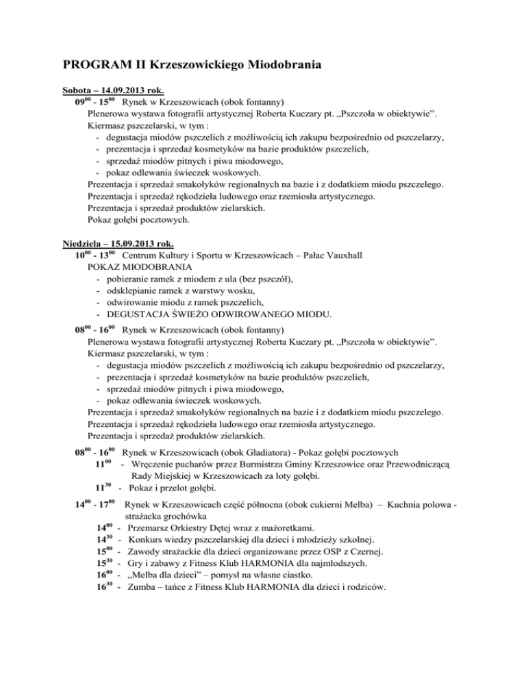 PROGRAM II Krzeszowickiego Miodobrania Sobota – 14.09.2013 rok. 0900 - 1500 Rynek w Krzeszowicach (obok fontanny) Plenerowa wystawa fotografii artystycznej Roberta Kuczary pt. „Pszczoła w obiektywie”. Kiermasz pszczelarski, w tym : - degustacja miodów pszczelich z możliwością ich zakupu bezpośrednio od pszczelarzy, - prezentacja i sprzedaż kosmetyków na bazie produktów pszczelich, - sprzedaż miodów pitnych i piwa miodowego, - pokaz odlewania świeczek woskowych. Prezentacja i sprzedaż smakołyków regionalnych na bazie i z dodatkiem miodu pszczelego. Prezentacja i sprzedaż rękodzieła ludowego oraz rzemiosła artystycznego. Prezentacja i sprzedaż produktów zielarskich. Pokaz gołębi pocztowych. Niedziela – 15.09.2013 rok. 1000 - 1300 Centrum Kultury i Sportu w Krzeszowicach – Pałac Vauxhall POKAZ MIODOBRANIA - pobieranie ramek z miodem z ula (bez pszczół), - odsklepianie ramek z warstwy wosku, - odwirowanie miodu z ramek pszczelich, - DEGUSTACJA ŚWIEŻO ODWIROWANEGO MIODU. 0800 - 1600 Rynek w Krzeszowicach (obok fontanny) Plenerowa wystawa fotografii artystycznej Roberta Kuczary pt. „Pszczoła w obiektywie”. Kiermasz pszczelarski, w tym : - degustacja miodów pszczelich z możliwością ich zakupu bezpośrednio od pszczelarzy, - prezentacja i sprzedaż kosmetyków na bazie produktów pszczelich, - sprzedaż miodów pitnych i piwa miodowego, - pokaz odlewania świeczek woskowych. Prezentacja i sprzedaż smakołyków regionalnych na bazie i z dodatkiem miodu pszczelego. Prezentacja i sprzedaż rękodzieła ludowego oraz rzemiosła artystycznego. Prezentacja i sprzedaż produktów zielarskich. 0800 - 1600 Rynek w Krzeszowicach (obok Gladiatora) - Pokaz gołębi pocztowych 1100 - Wręczenie pucharów przez Burmistrza Gminy Krzeszowice oraz Przewodniczącą Rady Miejskiej w Krzeszowicach za loty gołębi. 1130 - Pokaz i przelot gołębi. 1400 - 1700 1400 1430 1500 1530 1600 1630 - Rynek w Krzeszowicach część północna (obok cukierni Melba) – Kuchnia polowa strażacka grochówka Przemarsz Orkiestry Dętej wraz z mażoretkami. Konkurs wiedzy pszczelarskiej dla dzieci i młodzieży szkolnej. Zawody strażackie dla dzieci organizowane przez OSP z Czernej. Gry i zabawy z Fitness Klub HARMONIA dla najmłodszych. „Melba dla dzieci” – pomysł na własne ciastko. Zumba – tańce z Fitness Klub HARMONIA dla dzieci i rodziców.