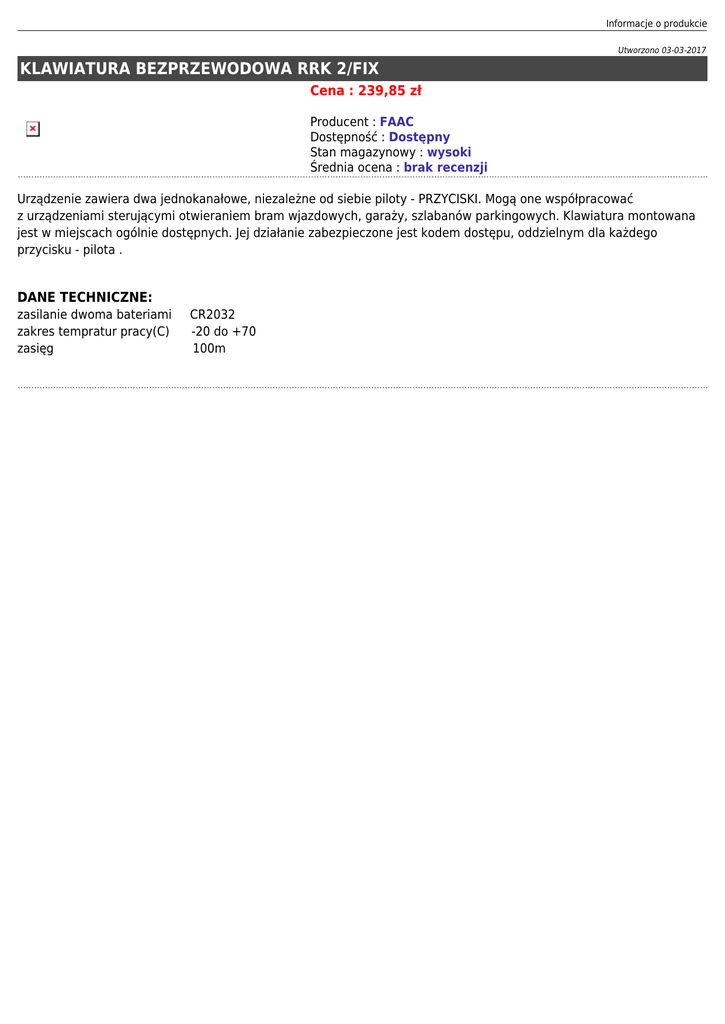 Informacje o produkcie Utworzono 03-03-2017 KLAWIATURA BEZPRZEWODOWA RRK 2/FIX Cena : 239,85 zł Producent : FAAC Dostępność : Dostępny Stan magazynowy : wysoki Średnia ocena : brak recenzji Urządzenie zawiera dwa jednokanałowe, niezależne od siebie piloty - PRZYCISKI. Mogą one współpracować z urządzeniami sterującymi otwieraniem bram wjazdowych, garaży, szlabanów parkingowych. Klawiatura montowana jest w miejscach ogólnie dostępnych. Jej działanie zabezpieczone jest kodem dostępu, oddzielnym dla każdego przycisku - pilota . DANE TECHNICZNE: zasilanie dwoma bateriami zakres tempratur pracy(C) zasięg CR2032 -20 do +70 100m