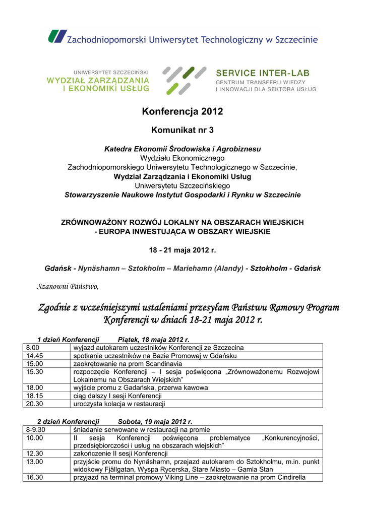 Konferencja 2012 Komunikat nr 3 Katedra Ekonomii Środowiska i Agrobiznesu Wydziału Ekonomicznego Zachodniopomorskiego Uniwersytetu Technologicznego w Szczecinie, Wydział Zarządzania i Ekonomiki Usług Uniwersytetu Szczecińskiego Stowarzyszenie Naukowe Instytut Gospodarki i Rynku w Szczecinie ZRÓWNOWAŻONY ROZWÓJ LOKALNY NA OBSZARACH WIEJSKICH - EUROPA INWESTUJĄCA W OBSZARY WIEJSKIE 18 - 21 maja 2012 r. Gdańsk - Nynäshamn – Sztokholm – Mariehamn (Alandy) - Sztokholm - Gdańsk Szanowni Państwo, Zgodnie Zgodnie z wcześniejszymi ustaleniami przesyłam Państwu Ramowy Program Konferencji w dniach 1818-21 maja 2012 r. 1 dzień Konferencji Piątek, 18 maja 2012 r. 8.00 wyjazd autokarem uczestników Konferencji ze Szczecina 14.45 spotkanie uczestników na Bazie Promowej w Gdańsku 15.00 zaokrętowanie na prom Scandinavia 15.30 rozpoczęcie Konferencji – I sesja poświęcona „Zrównoważonemu Rozwojowi Lokalnemu na Obszarach Wiejskich” 18.00 wyjście promu z Gadańska, przerwa kawowa 18.15 ciąg dalszy I sesji Konferencji 20.30 uroczysta kolacja w restauracji 2 dzień Konferencji Sobota, 19 maja 2012 r. 8-9.30 śniadanie serwowane w restauracji na promie 10.00 II sesja Konferencji poświęcona problematyce „Konkurencyjności, przedsiębiorczości i usług na obszarach wiejskich” 12.30 zakończenie II sesji Konferencji 13.00 przyjście promu do Nynäshamn, przejazd autokarem do Sztokholmu, m.in. punkt widokowy Fjällgatan, Wyspa Rycerska, Stare Miasto – Gamla Stan 16.30 przyjazd na terminal promowy Viking Line – zaokrętowanie na prom Cindirella 18.00 19.00 wyjście promu ze Sztokholmu kolacja – specjały kuchni skandynawskiej – all inclusive 3 dzień Konferencji Niedziela, 20 maja 2012 r. 7.00 – 10.00 śniadanie w restauracji na promie 7.45 przyjście promu do Mariehamn – jedynego miasta Wysp Alandzkich, położonego na półwyspie o szerokości 1 km, nazywanego „miastem tysiąca lip”, któremu prawa miejskie nadał car Aleksander II w 1861 r.* 8.00-9.30 spacer z pilotem po Mariehamn (dla chętnych) :-) 9.55 wyjście promu z Mariehamn, rejs wśród 24 tyś. Wysp archipelagu sztokholmskiego, podziwianie piękna i majestatu przyrody 15.30 przyjście promu do Sztokholmu, przejazd do Nynäshamn, możliwość dokonania zakupów w centrum handlowym, polecamy przede wszystkim śledzie w różnych wariantach smakowych 17.30 zaokrętowanie na prom Scandinavia 18.00 wyjście promu z Nynäshamn 19.00 kolacja, wieczór rozrywki 4 dzień Konferencji Poniedziałek, 21 maja 2012 r. 8-10.00 śniadanie serwowane w restauracji 10.30 podsumowanie i zakończenie Konferencji 13.00 przyjście promu do Gdańska 13.30 wyjazd uczestników Konferencji do Szczecina Jeszcze raz proszę o przesyłanie zgłoszeń na Konferencję, wydłużyliśmy czas zgłaszania uczestnictwa dla osób, które chcą opublikować referat we wskazanym wydawnictwie do 15 stycznia 2012 r. Dla osób deklarujących udział w Konferencji bez publikacji termin zgłoszeń upływa 15 marca 2012 r. Sekretarz konferencji Dr hab. inż. Bartosz Mickiewicz *Mariehamn - stolica, a zarazem największe miasto archipelagu Wysp Alandzkich, autonomicznej prowincji i regionu jednocześnie, najmniejszej spośród tego typu jednostek administracyjnych Finlandii. Miasto jest też siedzibą władz jednego z trzech podregionów archipelagu - Mariehamns stad, posiada także prawa gminy. Zamieszkuje je 11 139 osób, na obszarze 11,8 km². Nazwa miasta została wymyślona na cześć żony cara Aleksandra II, Marii Aleksandrowny (Marii Heskiej). Wyspy Alandzkie (szw. Åland, fiń. Ahvenanmaa) – szwedzkojęzyczny archipelag wysp politycznie należący do Finlandii, stanowiący jednak osobny podmiot z dużą autonomią, położony na Morzu Bałtyckim u wejścia do Zatoki Botnickiej. Status wysp jest gwarantowany międzynarodowo, ostatnio przez traktat akcesyjny do Unii Europejskiej. Łączna powierzchnia archipelagu liczącego 6757 wysp wynosi 1552,56 km², a największa wyspa Aland – 650 km². Liczba ludności wynosi 27 687 (IX 2009). Około 60 wysp jest zamieszkanych, głównie przez ludność pochodzenia szwedzkiego, którzy stanowią 90 % mieszkańców wysp. Ludność zajmuje się głównie rybołówstwem, hodowlą bydła i uprawą roli. Jedynym miastem i zarazem stolicą jest Mariehamn (fiń. Maarianhamina). Na Wyspach Alandzkich występuje całkowity zakaz manewrów wojskowych oraz zakaz przelotów samolotów lotnictwa wojskowego - obszar Wysp Alandzkich jest strefą zdemilitaryzowaną. Polonica - Na zamku Kastelholm na Wyspach Alandzkich na suficie jednej z sal wywieszone są herby wszystkich właścicieli twierdzy. Wśród nich znajduje się orzeł biały w czerwonym polu zaznaczający, że właścicielką zamku była najmłodsza córka króla Polski Zygmunta I Starego Katarzyna Jagiellonka, która była żoną króla Szwecji Jana III Wazy.