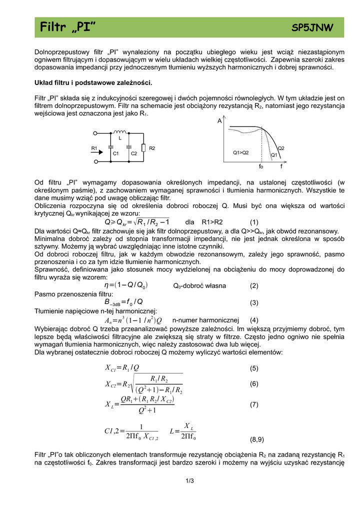 Filtr „PI” SP5JNW Dolnoprzepustowy filtr „PI” wynaleziony na początku ubiegłego wieku jest wciąż niezastąpionym ogniwem filtrującym i dopasowującym w wielu układach wielkiej częstotliwości. Zapewnia szeroki zakres dopasowania impedancji przy jednoczesnym tłumieniu wyższych harmonicznych i dobrej sprawności. Układ filtru i podstawowe zależności. Filtr „PI” składa się z indukcyjności szeregowej i dwóch pojemności równoległych. W tym układzie jest on filtrem dolnoprzepustowym. Filtr na schemacie jest obciążony rezystancją R2, natomiast jego rezystancja wejściowa jest oznaczona jest jako R1. A L R1 C1 R2 C2 Q2 Q1>Q2 Q1 fo f Od filtru „PI” wymagamy dopasowania określonych impedancji, na ustalonej częstotliwości (w określonym paśmie), z zachowaniem wymaganej sprawności i tłumienia harmonicznych. Wszystkie te dane musimy wziąć pod uwagę obliczając filtr. Obliczenia rozpoczyna się od określenia dobroci roboczej Q. Musi być ona większa od wartości krytycznej Qkr wynikającej ze wzoru: QQ kr = R 1 / R 2 −1 dla R1>R2 (1) Dla wartości Q≈Qkr filtr zachowuje się jak filtr dolnoprzepustowy, a dla Q>>Qkr, jak obwód rezonansowy. Minimalna dobroć zależy od stopnia transformacji impedancji, nie jest jednak określona w sposób sztywny. Możemy ją wybrać uwzględniając inne istotne czynniki. Od dobroci roboczej filtru, jak w każdym obwodzie rezonansowym, zależy jego sprawność, pasmo przenoszenia i co za tym idzie tłumienie harmonicznych. Sprawność, definiowana jako stosunek mocy wydzielonej na obciążeniu do mocy doprowadzonej do filtru wyraża się wzorem: η=1−Q /Q 0 Q0-dobroć własna (2) Pasmo przenoszenia filtru: B−3dB =f 0 / Q (3) Tłumienie napięciowe n-tej harmonicznej: (4) An =n 3 1−1 / n2 Q n-numer harmonicznej Wybierając dobroć Q trzeba przeanalizować powyższe zależności. Im większą przyjmiemy dobroć, tym lepsze będą właściwości filtracyjne ale zwiększą się straty w filtrze. Często jedno ogniwo nie spełnia wymagań tłumienia harmonicznych, więc należy zastosować dwa lub więcej. Dla wybranej ostatecznie dobroci roboczej Q możemy wyliczyć wartości elementów: X C1 =R1 /Q X C2 =R 2 X L= (5) R1 / R2 (6) 2 Q 1−R1 / R2 QR1 R1 R2 / X C2 C1,2= (7) Q2 1 1 2Πf 0 X C1 ,2 L= XL 2Πf 0 (8,9) Filtr „PI”o tak obliczonych elementach transformuje rezystancję obciążenia R2 na zadaną rezystancję R1 na częstotliwości f0. Zakres transformacji jest bardzo szeroki i możemy na wyjściu uzyskać rezystancję 1/3 wielokrotnie większą lub mniejszą od wejściowej. Przy częstotliwościach różnych od f 0 impedancja wejściowa filtru nie jest już czysto rzeczywista. Im odstrojenie jest większe, tym większa jest reaktancja widziana na wejściu. Zmniejszenie dobroci filtru rozszerza jego pasmo czyli zmniejsza niedopasowanie dla tej samej odchyłki częstotliwości. Jeśli układy dołączane do filtru mają pojemności wejściowe, to należy zmniejszyć obliczone pojemności filtru o ich wartość. Korygując wartość dobroci Q możemy w pewnych granicach wpływać na wartości podzespołów i często osiągnąć dla indukcyjności i pojemności wartości z typowego szeregu. Warto zauważyć, że po podstawieniu do zależności (6), wzoru (1) na dobroć krytyczną, wartość XC2 przyjmuje wartość nieskończenie dużą, co odpowiada zerowej pojemności C2. Wynika stąd, że dla dobroci krytycznej filtr „PI” przyjmuje postać ogniwa „L” (lub „Γ”, jak kto woli). Podany sposób obliczania wartości elementów filtru „PI” wynika z kryterium dopasowania na określonej częstotliwości i nie jest optymalizowany na tłumienie poza pasmem. Filtr w takim samym układzie elektrycznym może być obliczany np. według wzorów Czebyszewa, aby uzyskać lepsze tłumienie. Dalsza poprawa filtracji wymaga zastosowania bardziej złożonych ogniw. Przykład. Obliczyć filtr „PI” transformujący rezystancję anteny Ra=50om na wartość Ro=10om wymaganą dla obciążenia stopnia mocy nadajnika QRP, na częstotliwości f0=7,1MHz. Sprawność filtru η>90%. Dobroć własna cewki Q0=50. Tranzystor wyjściowy ma pojemność Cc=100pF. Q kr = 50 /10 −1=2 L 0,45uH Ro 10om Ra 50om C1 1344pF C2 Cc 2140pF 100pF dobroć krytyczna (wz.1) Q=3 wybrana wartość dobroci roboczej η=1− sprawność (założenie wstępne spełnione) (wz.2) 3 =0,94=94 % 50 50 X C1 = =16,7 om 3 50/10 X C2 =10 =10om 2 3 1−50 /10 3∗5050∗10 /10 X L= =20om 321 1 C1= =1344pF 2∗3,14∗16,7∗7,1∗106 1 C2= =2240pF 2∗3,14∗10∗7,1∗106 C2' =C2−Cc=2240−100=2140pF 20 L= =0,45 uH 2∗3,14∗7,1∗106 1 A2 =2 3 1− 2 3=18 25,1 dB 2 1 3 A3 =3 1− 2 3=72 37,2 dB 3 reaktancja pojemności C1 (wz.5) reaktancja pojemności C2 (wz.6) reaktancja indukcyjności L (wz.7) pojemność C1 (wz.8) pojemność C2 (teoretyczna) (wz.8) pojemność C2' do zastosowania indukcyjność L (wz.9) tłumienie drugiej harmonicznej (wz.4) tłumienie trzeciej harmonicznej (wz.4) Obliczone pojemności mają znaczne wartości, które mogą sprawić kłopot przy praktycznej realizacji. Z tego powodu w nadajnikach stosuje się na ogół transformatory szerokopasmowe, aby podnieść impedancję do wartości standardowej 50om, przy której realizacja filtrów jest łatwiejsza. Realizacja praktyczna. W tabeli są przedstawione wartośći L,C1,C2 dla symetrycznych filtrów „PI” (50om/50om), na poszczególnych pasmach amatorskich. Symbole A2 i A3 oznaczaję tłumienie 2 i 3 harmonicznej. Z porównania kolumn tabeli widać, jak dobroć filtru rzutuje na wartości elementów itłumienie harmonicznych. Z punktu widzenia sprawności można sobie pozwolić na dobroć w granicach aż do 2/3 Q=10 (dla dobroci cewek Q0>=100) ale wtedy pojemności były by zbyt duże. Trzymanie się małej dobroci oznacza natomiast małe tłumienie harmonicznych. Dla typowych stopni wyjściowych nadajników w klasie C, druga harmoniczna ma teoretycznie poziom rzędu 50% (ok