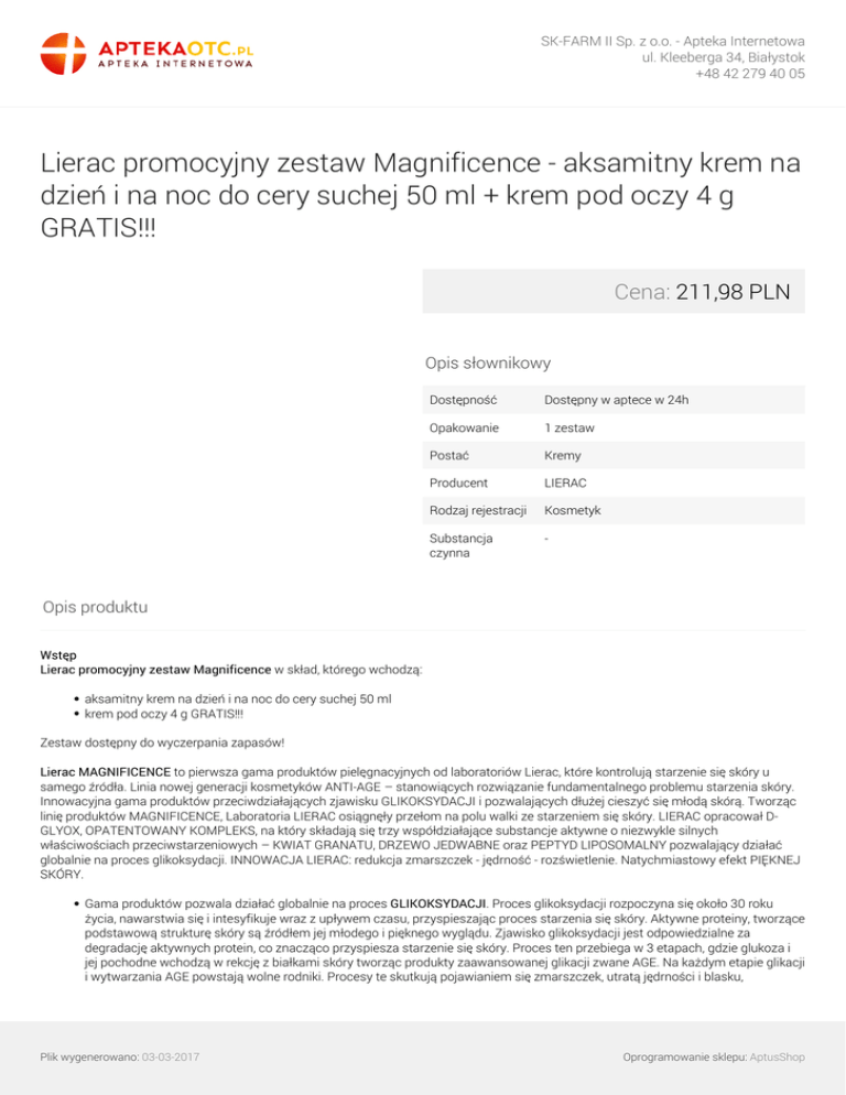 SK-FARM II Sp. z o.o. - Apteka Internetowa ul. Kleeberga 34, Białystok +48 42 279 40 05 Lierac promocyjny zestaw Magnificence - aksamitny krem na dzień i na noc do cery suchej 50 ml + krem pod oczy 4 g GRATIS!!! Cena: 211,98 PLN Opis słownikowy Dostępność Dostępny w aptece w 24h Opakowanie 1 zestaw Postać Kremy Producent LIERAC Rodzaj rejestracji Kosmetyk Substancja czynna - Opis produktu Wstęp Lierac promocyjny zestaw Magnificence w skład, którego wchodzą: aksamitny krem na dzień i na noc do cery suchej 50 ml krem pod oczy 4 g GRATIS!!! Zestaw dostępny do wyczerpania zapasów! Lierac MAGNIFICENCE to pierwsza gama produktów pielęgnacyjnych od laboratoriów Lierac, które kontrolują starzenie się skóry u samego źródła. Linia nowej generacji kosmetyków ANTI-AGE – stanowiących rozwiązanie fundamentalnego problemu starzenia skóry. Innowacyjna gama produktów przeciwdziałających zjawisku GLIKOKSYDACJI i pozwalających dłużej cieszyć się młodą skórą. Tworząc linię produktów MAGNIFICENCE, Laboratoria LIERAC osiągnęły przełom na polu walki ze starzeniem się skóry. LIERAC opracował DGLYOX, OPATENTOWANY KOMPLEKS, na który składają się trzy współdziałające substancje aktywne o niezwykle silnych właściwościach przeciwstarzeniowych – KWIAT GRANATU, DRZEWO JEDWABNE oraz PEPTYD LIPOSOMALNY pozwalający działać globalnie na proces glikoksydacji. INNOWACJA LIERAC: redukcja zmarszczek - jędrność - rozświetlenie. Natychmiastowy efekt PIĘKNEJ SKÓRY. Gama produktów pozwala działać globalnie na proces GLIKOKSYDACJI. Proces glikoksydacji rozpoczyna się około 30 roku życia, nawarstwia się i intesyfikuje wraz z upływem czasu, przyspieszając proces starzenia się skóry. Aktywne proteiny, tworzące podstawową strukturę skóry są źródłem jej młodego i pięknego wyglądu. Zjawisko glikoksydacji jest odpowiedzialne za degradację aktywnych protein, co znacząco przyspiesza starzenie się skóry. Proces ten przebiega w 3 etapach, gdzie glukoza i jej pochodne wchodzą w rekcję z białkami skóry tworząc produkty zaawansowanej glikacji zwane AGE. Na każdym etapie glikacji i wytwarzania AGE powstają wolne rodniki. Procesy te skutkują pojawianiem się zmarszczek, utratą jędrności i blasku, Plik wygenerowano: 03-03-2017 Oprogramowanie sklepu: AptusShop SK-FARM II Sp. z o.o. - Apteka Internetowa ul. Kleeberga 34, Białystok +48 42 279 40 05 pogorszeniem się jakości skóry. GLIKOKSYDACJA = glikacja + oksydacja. Charakterystyka Lierac Magnificence aksamitny krem na dzień i na noc do cery suchej Bogata i kremowa konsystencja natychmiast przynosi skórze komfort, przywracając jej gładkość. Delikatny zapach łączy w sobie subtelne nuty liści palmowych, passiflory, plumerii i kory szlachetnych drzew. Preparat przeznaczony dla wszystkich kobiet, które pragną skutecznie wygładzić zmarszczki i przywrócić jędrność skóry. Także dla kobiet dążących do uzyskania długotrwałego efektu "pięknej skóry" i natychmiastowego przywrócenia cerze jej naturalnego blasku. Idealny dla skóry suchej. Lierac Magnificence krem pod oczy Kremowa konsystencja zapewnia prawdziwy komfort. Formuła bezzapachowa, zapewniająca optymalną tolerancję przez wrażliwą skórę okolicy oczu. Dzięki specjalnemu aplikatarowi z pędzelkiem pozwala na niezwykle precyzyjną aplikację preparatu na skórę okolic oczu. Preparat przeznaczony dla wszystkich kobiet, które pragną skutecznie wygładzić zmarszczki i przywrócić jędrność skóry. Idealny dla kobiet, pragnących mieć zawsze jasne spojrzenie, pozbyć się worków i cieni pod oczami i dążących do uzyskania długotrwałego efektu pięknej skóry. Krem przeznaczony jest dla wszystkich typów skóry. Informacje dodatkowe W razie pytań lub wątpliwości służymy Państwu pomocą pod adresem [email protected]. Plik wygenerowano: 03-03-2017 Powered by TCPDF (www.tcpdf.org) Oprogramowanie sklepu: AptusShop