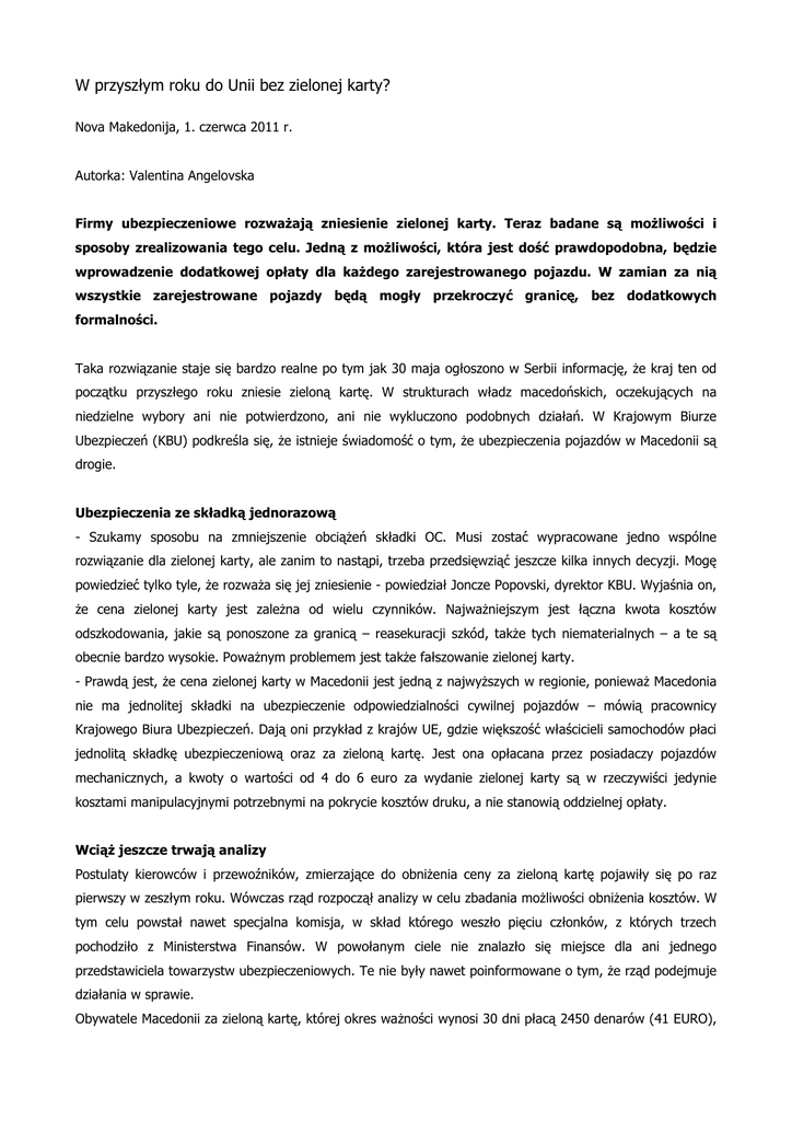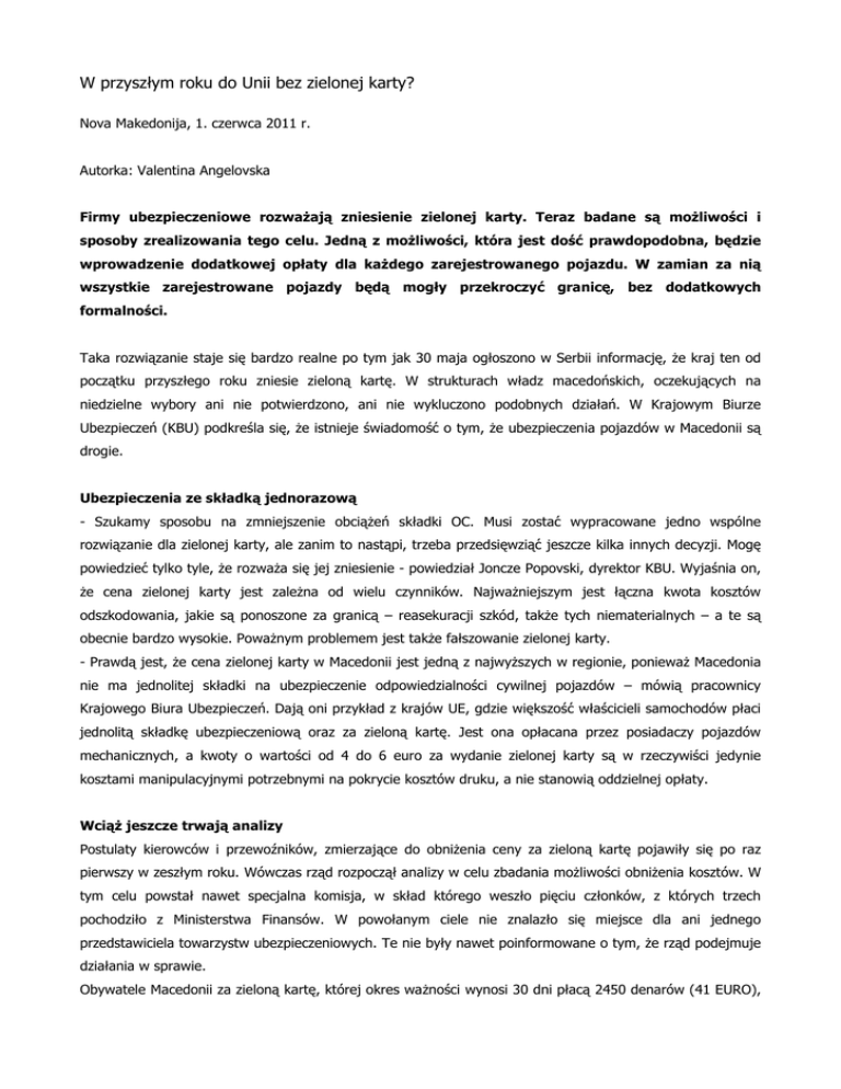 W przyszłym roku do Unii bez zielonej karty? Nova Makedonija, 1. czerwca 2011 r. Autorka: Valentina Angelovska Firmy ubezpieczeniowe rozważają zniesienie zielonej karty. Teraz badane są możliwości i sposoby zrealizowania tego celu. Jedną z możliwości, która jest dość prawdopodobna, będzie wprowadzenie dodatkowej opłaty dla każdego zarejestrowanego pojazdu. W zamian za nią wszystkie zarejestrowane pojazdy będą mogły przekroczyć granicę, bez dodatkowych formalności. Taka rozwiązanie staje się bardzo realne po tym jak 30 maja ogłoszono w Serbii informację, że kraj ten od początku przyszłego roku zniesie zieloną kartę. W strukturach władz macedońskich, oczekujących na niedzielne wybory ani nie potwierdzono, ani nie wykluczono podobnych działań. W Krajowym Biurze Ubezpieczeń (KBU) podkreśla się, że istnieje świadomość o tym, że ubezpieczenia pojazdów w Macedonii są drogie. Ubezpieczenia ze składką jednorazową - Szukamy sposobu na zmniejszenie obciążeń składki OC. Musi zostać wypracowane jedno wspólne rozwiązanie dla zielonej karty, ale zanim to nastąpi, trzeba przedsięwziąć jeszcze kilka innych decyzji. Mogę powiedzieć tylko tyle, że rozważa się jej zniesienie - powiedział Joncze Popovski, dyrektor KBU. Wyjaśnia on, że cena zielonej karty jest zależna od wielu czynników. Najważniejszym jest łączna kwota kosztów odszkodowania, jakie są ponoszone za granicą – reasekuracji szkód, także tych niematerialnych – a te są obecnie bardzo wysokie. Poważnym problemem jest także fałszowanie zielonej karty. - Prawdą jest, że cena zielonej karty w Macedonii jest jedną z najwyższych w regionie, ponieważ Macedonia nie ma jednolitej składki na ubezpieczenie odpowiedzialności cywilnej pojazdów – mówią pracownicy Krajowego Biura Ubezpieczeń. Dają oni przykład z krajów UE, gdzie większość właścicieli samochodów płaci jednolitą składkę ubezpieczeniową oraz za zieloną kartę. Jest ona opłacana przez posiadaczy pojazdów mechanicznych, a kwoty o wartości od 4 do 6 euro za wydanie zielonej karty są w rzeczywiści jedynie kosztami manipulacyjnymi potrzebnymi na pokrycie kosztów druku, a nie stanowią oddzielnej opłaty. Wciąż jeszcze trwają analizy Postulaty kierowców i przewoźników, zmierzające do obniżenia ceny za zieloną kartę pojawiły się po raz pierwszy w zeszłym roku. Wówczas rząd rozpoczął analizy w celu zbadania możliwości obniżenia kosztów. W tym celu powstał nawet specjalna komisja, w skład którego weszło pięciu członków, z których trzech pochodziło z Ministerstwa Finansów. W powołanym ciele nie znalazło się miejsce dla ani jednego przedstawiciela towarzystw ubezpieczeniowych. Te nie były nawet poinformowane o tym, że rząd podejmuje działania w sprawie. Obywatele Macedonii za zieloną kartę, której okres ważności wynosi 30 dni płacą 2450 denarów (41 EURO), za 3-miesięczną – 3670 denarów (62 EURO),półroczną - 5500 denarów (92 EURO). Zielona karta na cały rok kosztuje 9760 denarów (163 EURO). Wysokie ceny za zieloną kartę firmy ubezpieczeniowe uzasadniają faktem, iż duża liczba pojazdów, bo ponad 30 procent, nie jest zarejestrowana i nie posiada żadnego ubezpieczenia. To podnosi i tak już wysokie koszty reasekuracji. Jednocześnie ubezpieczyciele dodają, że aby zmienić ten niekorzystny wizerunek dla kraju, macedońskie instytucje powinny podjąć niezwłoczne kroki w celu usunięcia z ruchu pojazdów niezarejestrowanych, a także poprawić przepisy w dziedzinie ubezpieczeń. Nie ma takiego drugiego kraju jak Macedonia Jeśli mielibyśmy porównać państwa w bezpośrednim sąsiedztwie Macedonii, to okaże się, że znajduje się ona w martwym punkcie, ponieważ ubezpieczenia tam płacone realizuje się w zupełnie inny sposób. W pierwszej grupie krajów znajdują się te, które mają stałą składkę OC. Do nich należy Słowenia z 1,6 mln pojazdów, gdzie za ubezpieczenie samochodu płaci się 224 euro rocznie. W Chorwacji, składka ta waha się pomiędzy 197 a 573 euro, w zależności od masy pojazdu. Na krajowych tablicach jeździ 2 miliony pojazdów. W Serbii zarejestrowanych pojazdów jest mniej więcej tyle samo, a suma ubezpieczenia wynosi od 66 do 172 euro na rok. W Bułgarii liczba kierowców zmechanizowanych wynosi blisko 3 mln, a roczne ubezpieczenie kosztuje między 82 a 134 euro. W drugiej grupie znajdują się kraje, gdzie za ubezpieczenie pojazdów w kraju i zagranicą – na podstawie zielonej karty płaci się oddzielnie. W grupie tej, oprócz Macedonii z 300 tys. pojazdów, znajduje się Albania z 250 tys., w której płaci się składkę ubezpieczenia za osobę, stanowiącą równowartość 49 euro oraz za samochód, w wysokości ok. 400 euro. W Turcji, gdzie po drogach jeździ 13 milionów miejscowych pojazdów koszty ubezpieczenia wynoszą od 160 do 575 euro oraz od 400 do 500 euro za zieloną kartę. Stavreski ogłosił 30-procentową obniżkę Zmniejszenie kosztów zielonej karty o 30 procent ogłosił wczoraj wicepremier i minister finansów Zoran Stavreski, odpowiadając na pytania dziennikarzy podczas otwarcia mostu we wsi Dolni Disan, w pobliżu Negotino. - Rząd przeanalizował sytuację w zakładach ubezpieczeń. Posiadamy końcowe sprawozdania za 2010 r., które pokazują, że istnieje możliwość obniżenia kosztów zielonej karty. Mogę powiedzieć, że na pierwszym posiedzeniu rządu, które zwołane zostanie po wyborach podejmiemy decyzję o obniżeniu ceny za zieloną kartę. Spodziewam się, że nie będzie to obniżka mniejsza niż 30 procent i dla przewoźników i dla obywateli powiedział Stavreski. Kampania wyborcza trwa. Zobaczymy co zwycięzcy powiedzą po wyborach. Tłum. i red. Ł.F.