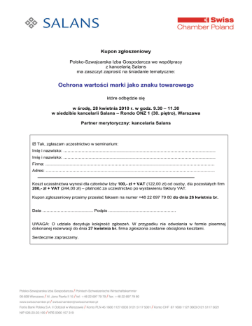 Kupon zgłoszeniowy Polsko-Szwajcarska Izba Gospodarcza we współpracy z kancelarią Salans ma zaszczyt zaprosić na śniadanie tematyczne: Ochrona wartości marki jako znaku towarowego które odbędzie się w środę, 28 kwietnia 2010 r. w godz. 9.30 – 11.30 w siedzibie kancelarii Salans – Rondo ONZ 1 (30. piętro), Warszawa Partner merytoryczny: kancelaria Salans ; Tak, zgłaszam uczestnictwo w seminarium: Imię i nazwisko: ……………………………………………………………………………………………… Imię i nazwisko: ……………………………………………………………………………………………… Firma: ………………………………………………………………………………………………………… Adres: ………………………………………………………………………………………………………… Koszt uczestnictwa wynosi dla członków Izby 100,- zł + VAT (122,00 zł) od osoby, dla pozostałych firm 200,- zł + VAT (244,00 zł) – płatność za uczestnictwo po wystawieniu faktury VAT. Kupon zgłoszeniowy prosimy przesłać faksem na numer +48 22 697 79 80 do dnia 26 kwietnia br. Data ……………………………… Podpis ………………………………………… UWAGA: O udziale decyduje kolejność zgłoszeń. W przypadku nie odwołania w formie pisemnej dokonanej rezerwacji do dnia 27 kwietnia br. firma zgłoszona zostanie obciążona kosztami. Serdecznie zapraszamy. Warsaw 5065459.1